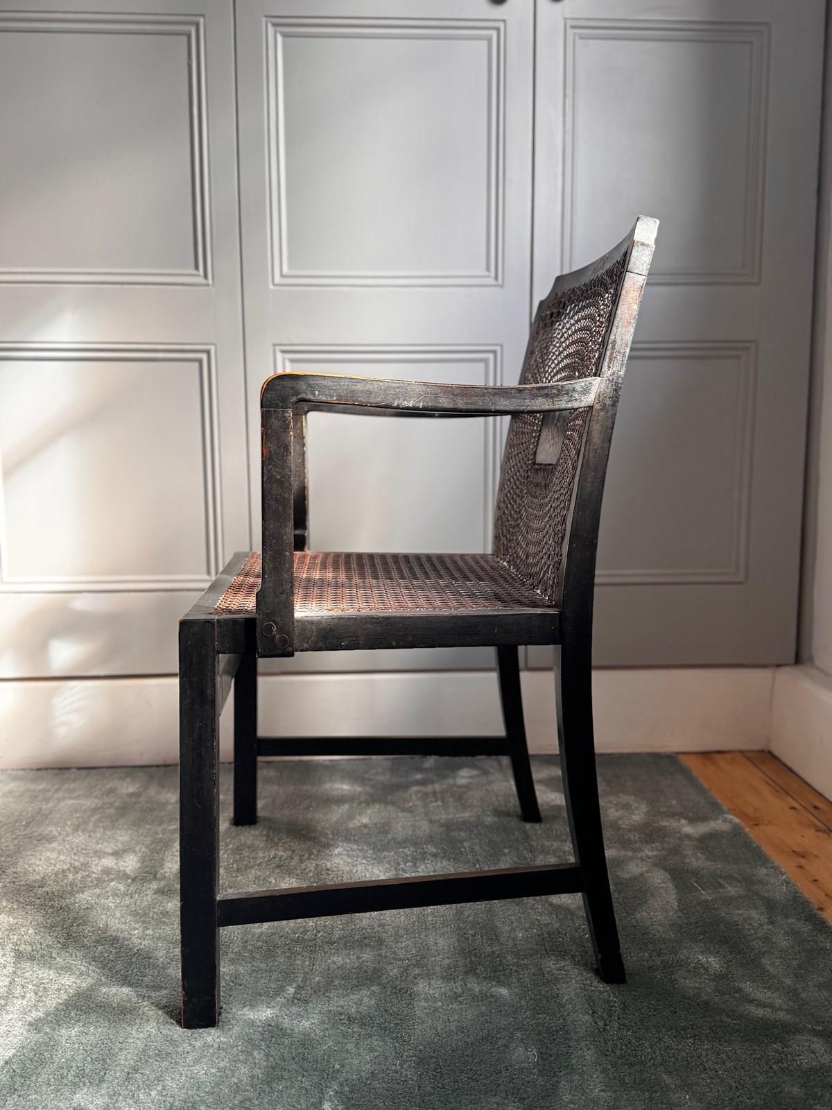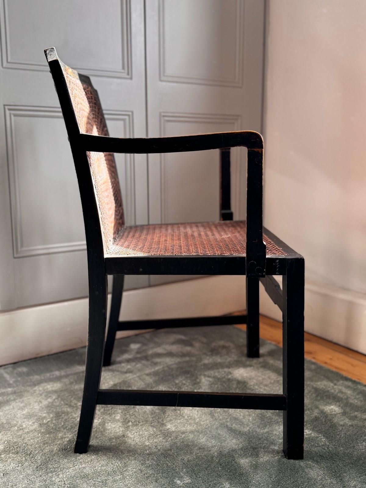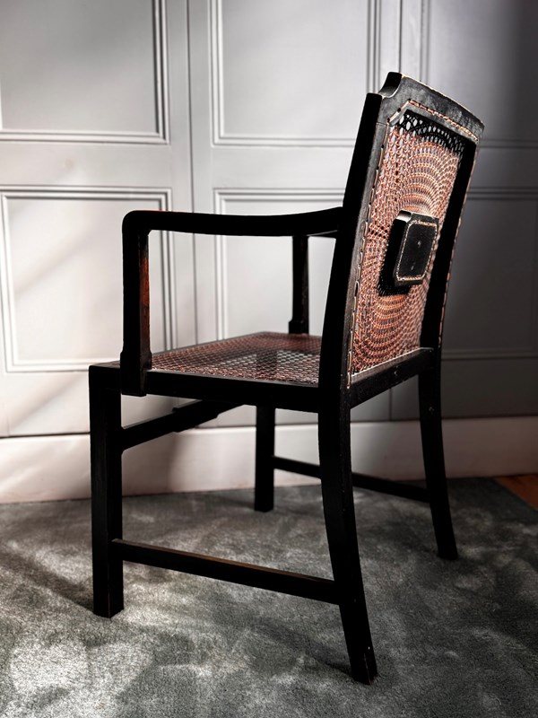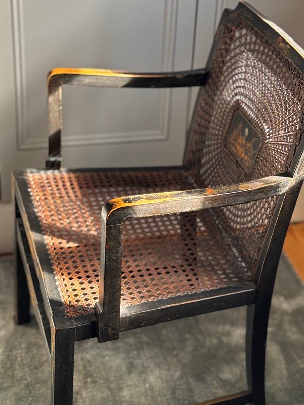 A pretty and decoratively painted English Edwardian chinoiserie bergere petite armchair, perfect for bedroom or dressing room use and with generous sized seat.