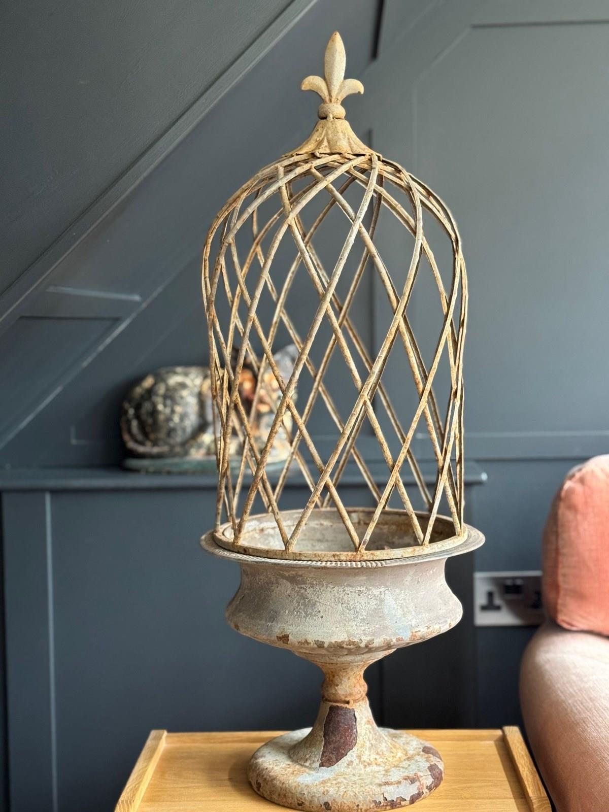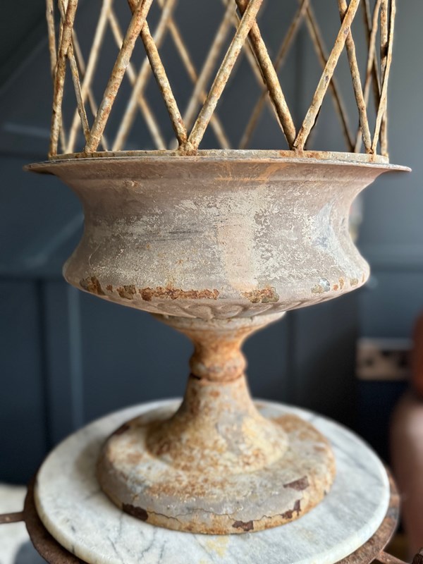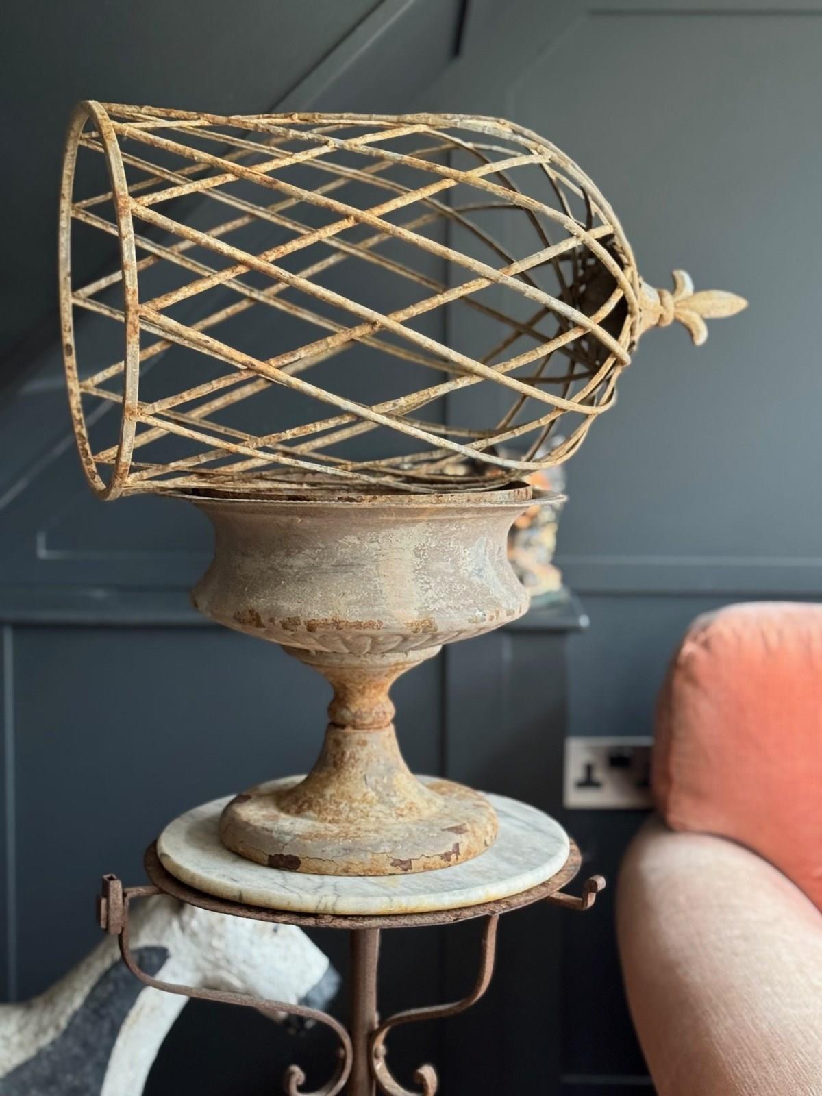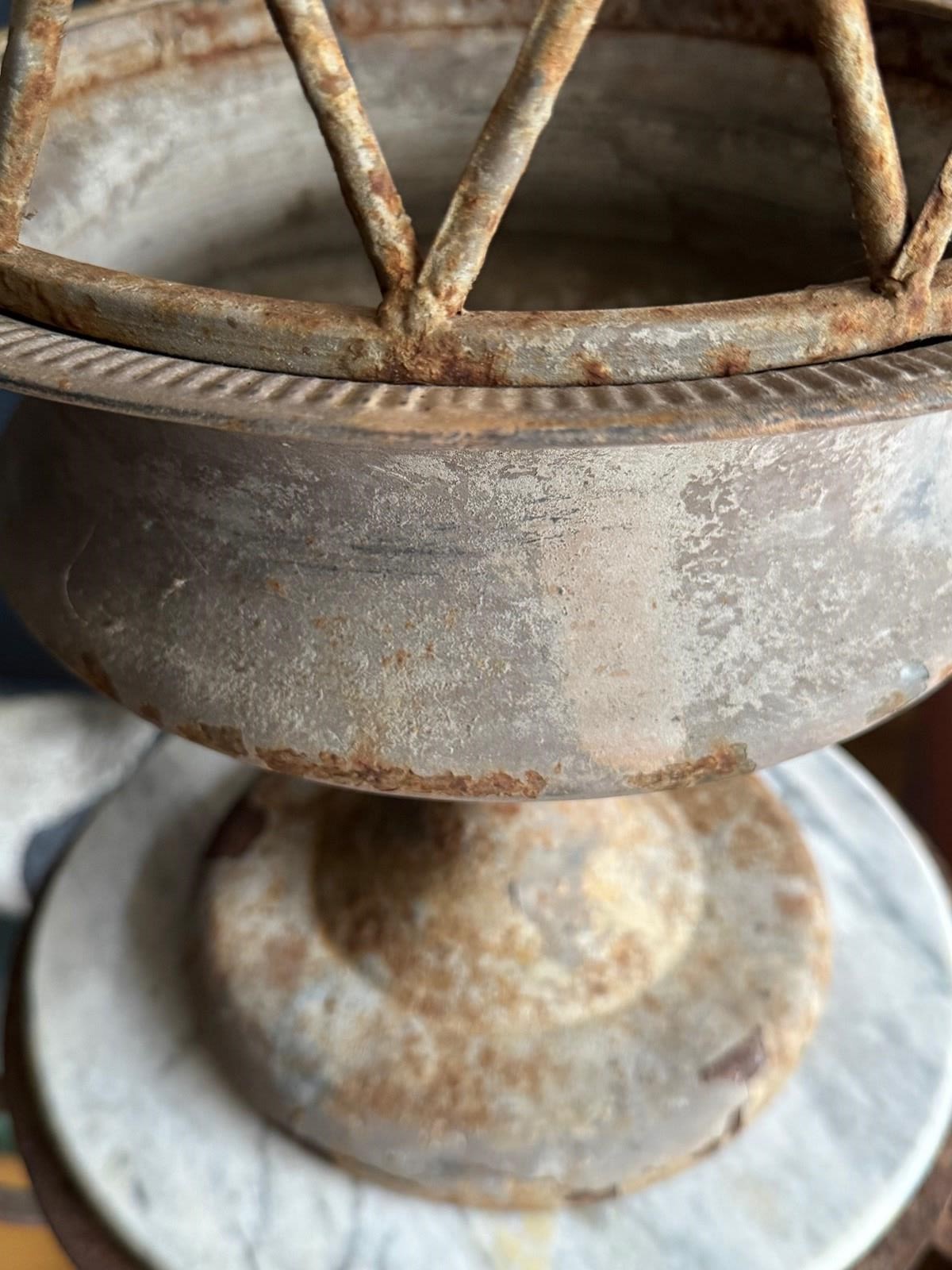 A pretty vintage metal campana shaped urn with a removable trellis top. Great display piece.