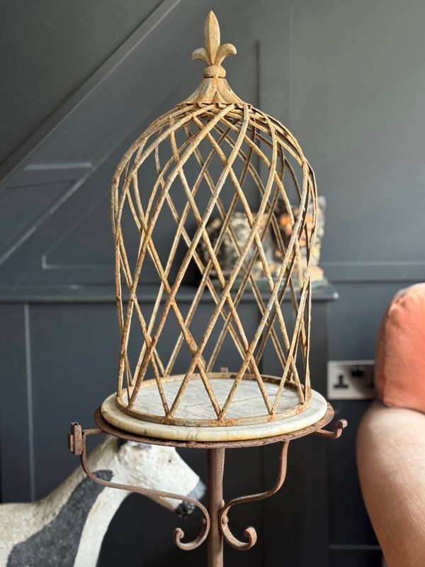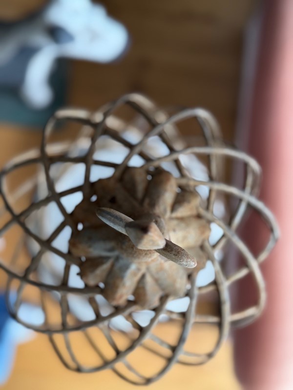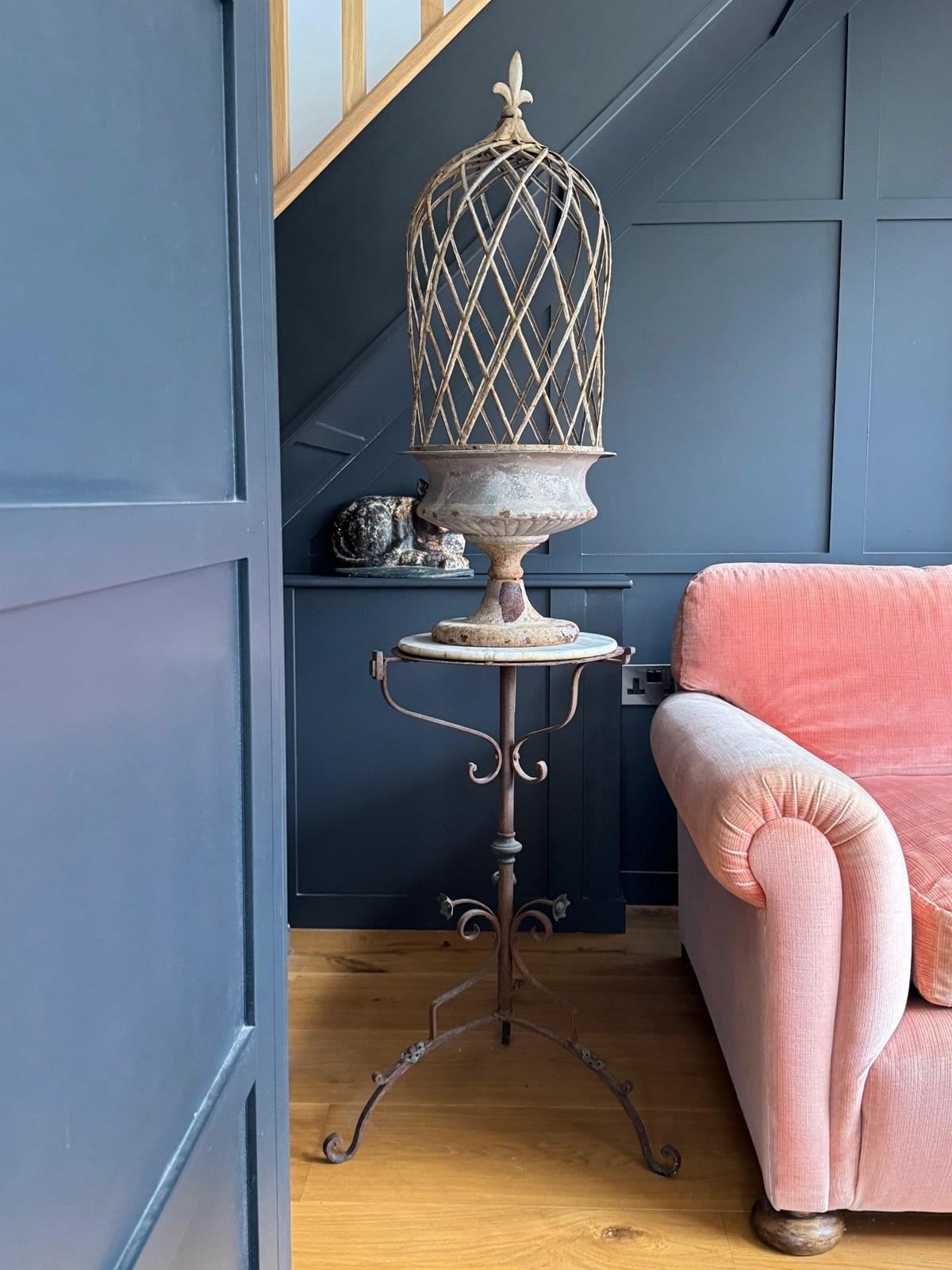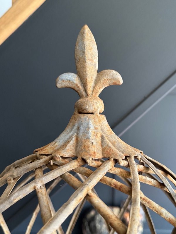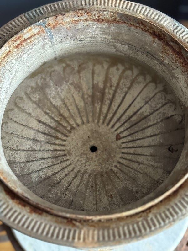 A pretty vintage metal campana shaped urn with a removable trellis top. Great display piece.