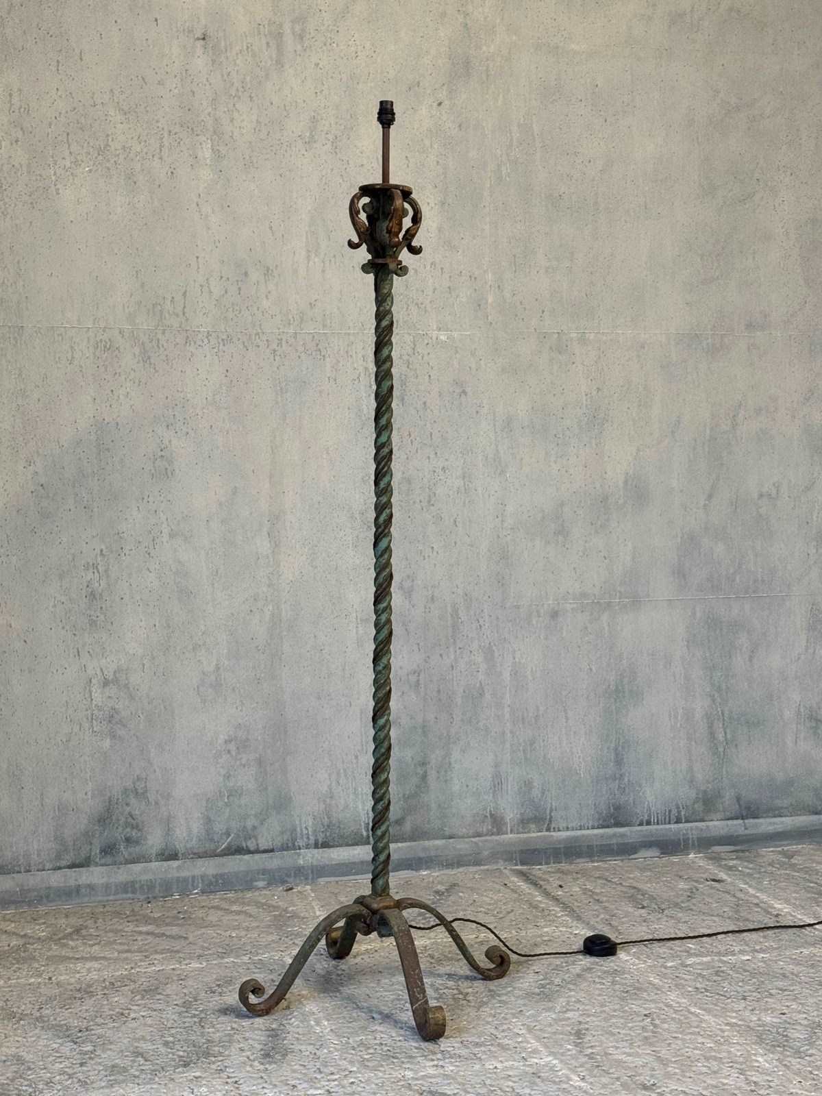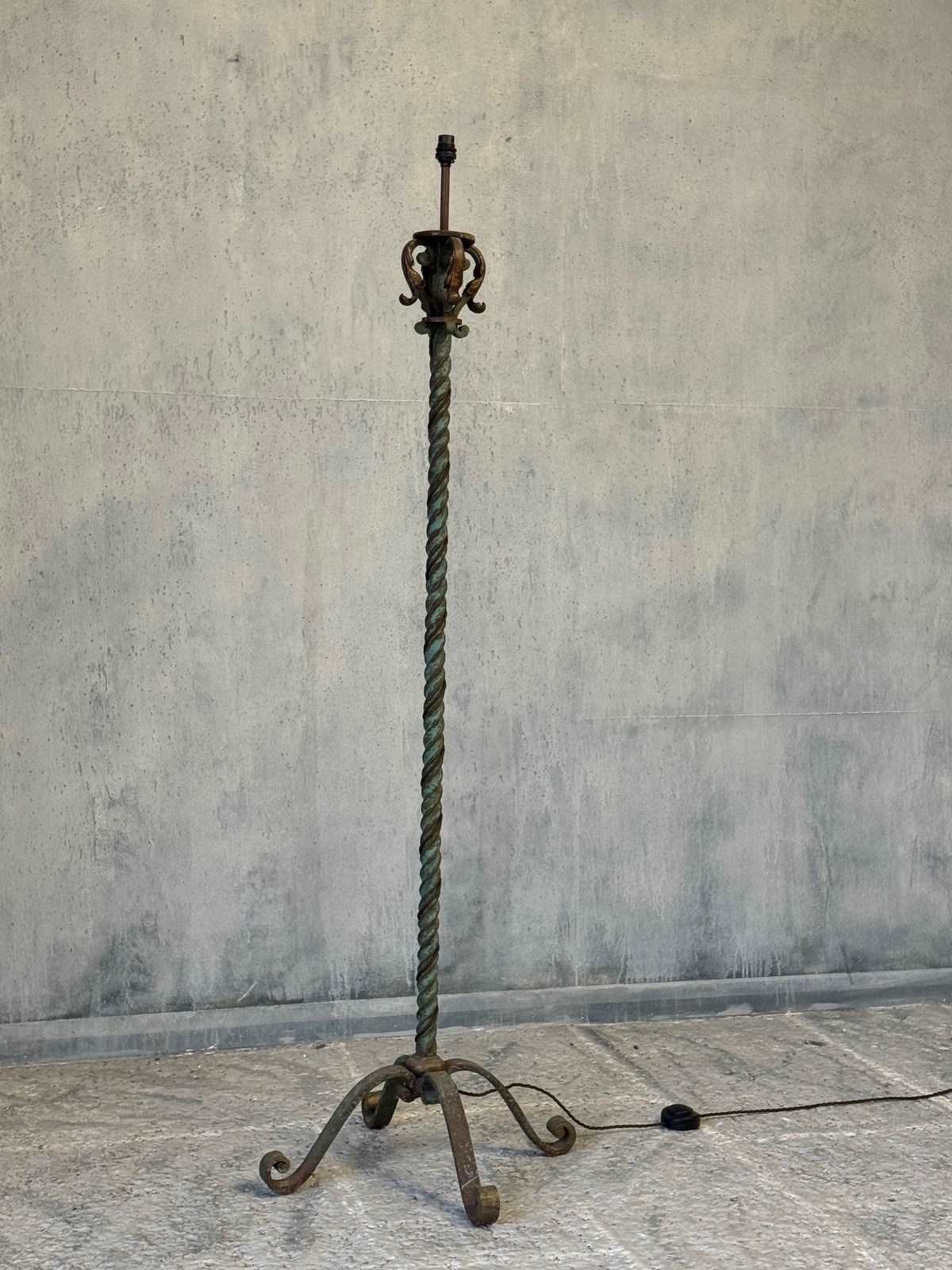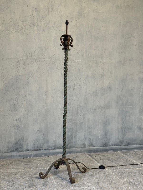 A fabulous quality and heavy antique Continental floor lamp, circa 1920s. Made from iron, and standing on a flared base, the twisted stem making this a very decorative piece. Retaining quite a lot of the old green paint and traces of original gilding to the upper scrolling detail.