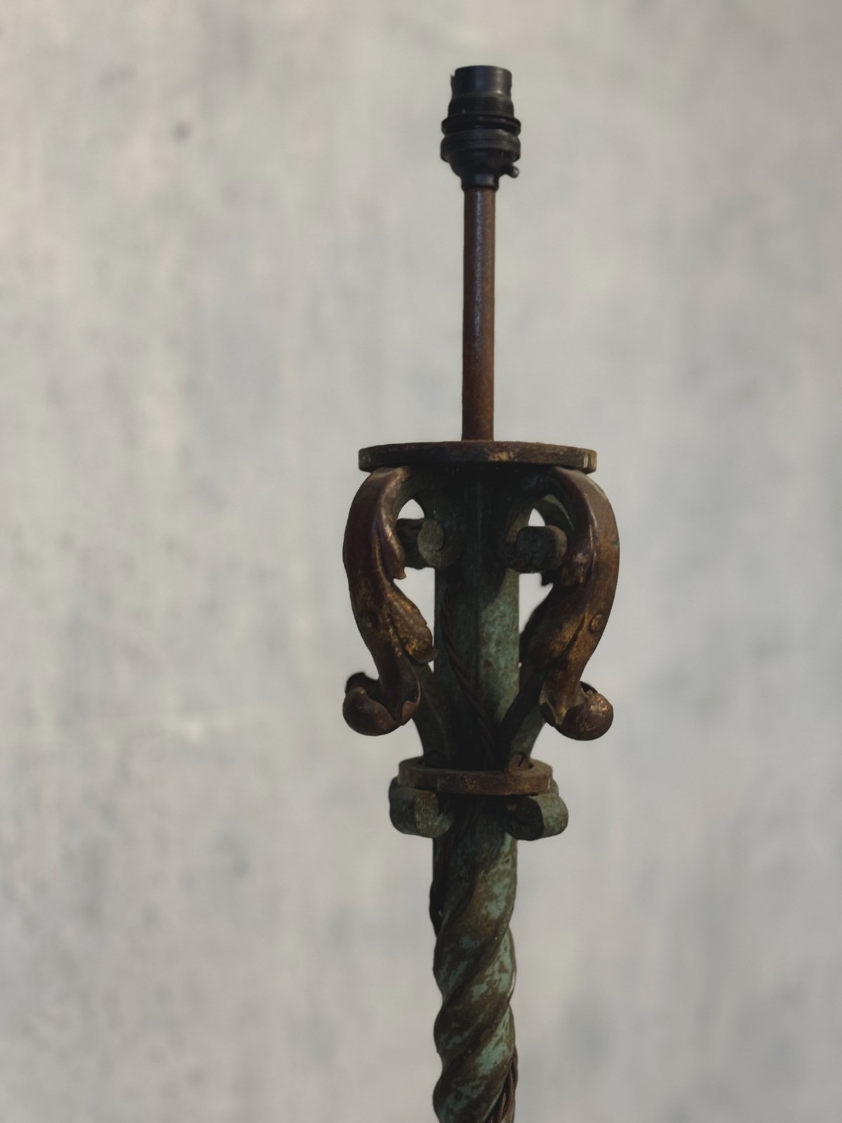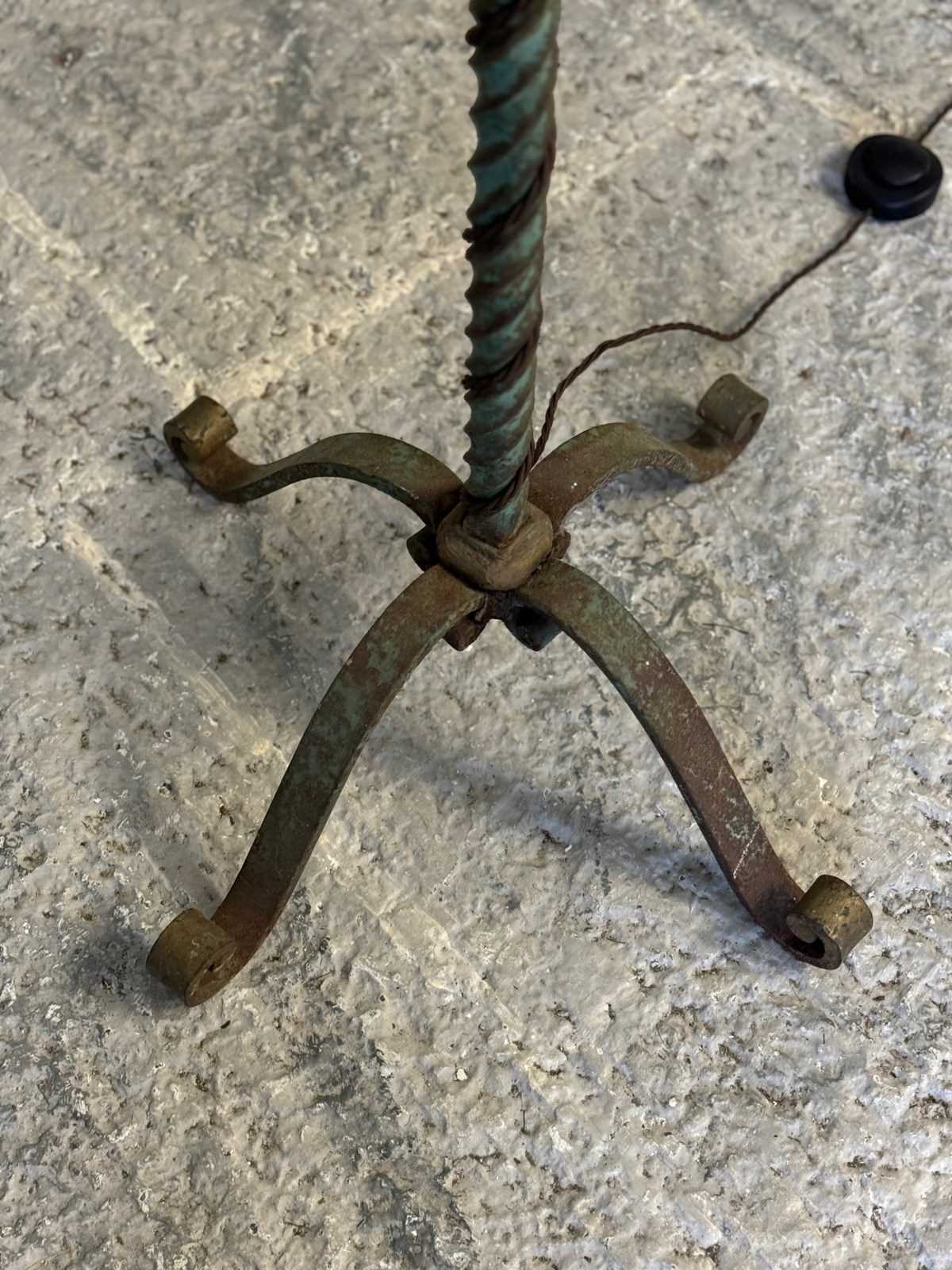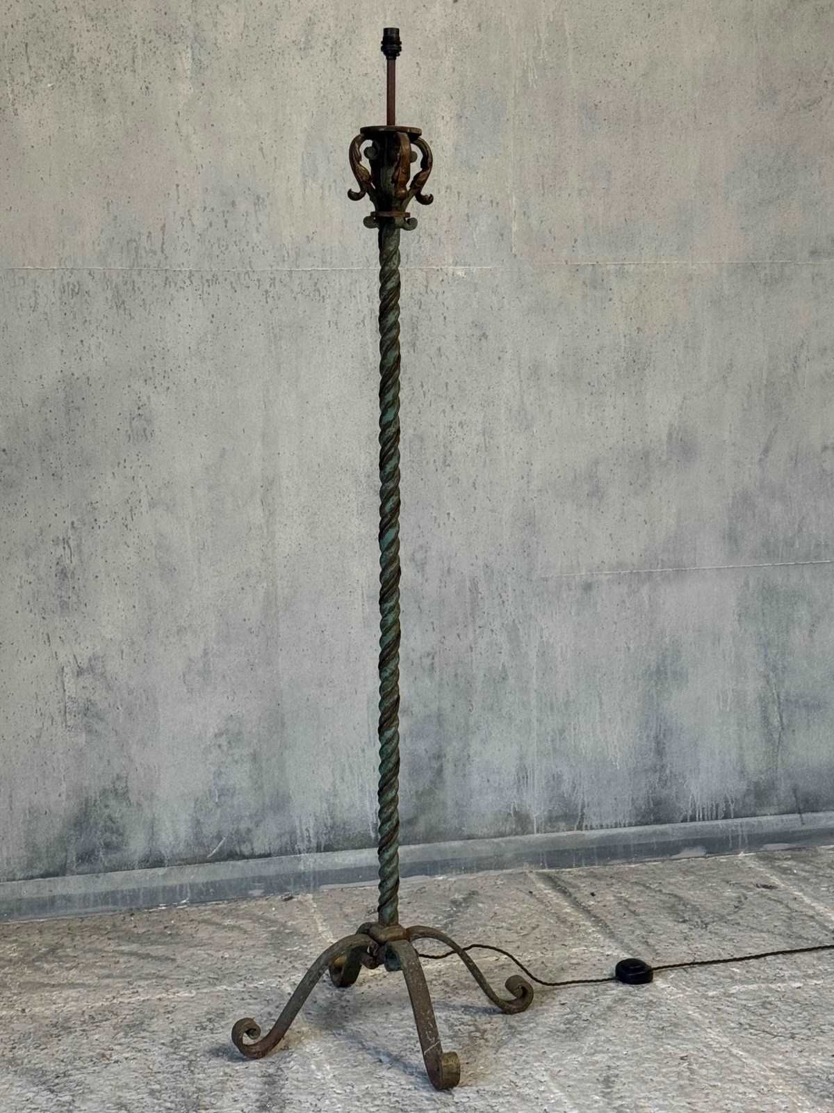 A fabulous quality and heavy antique Continental floor lamp, circa 1920s. Made from iron, and standing on a flared base, the twisted stem making this a very decorative piece. Retaining quite a lot of the old green paint and traces of original gilding to the upper scrolling detail.