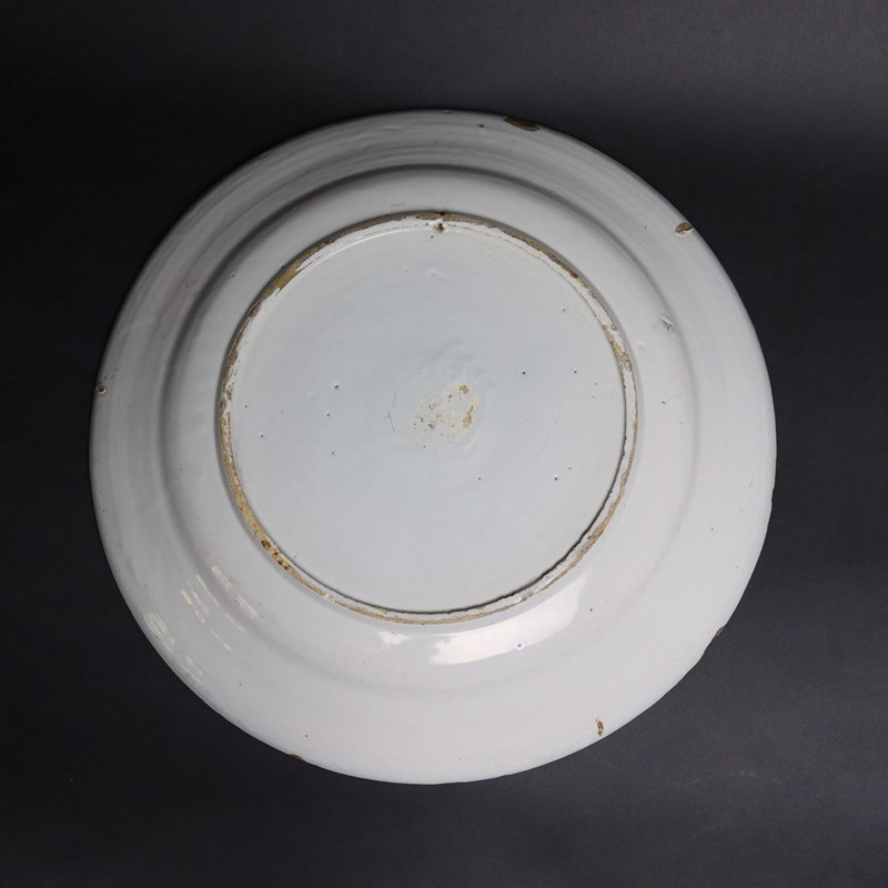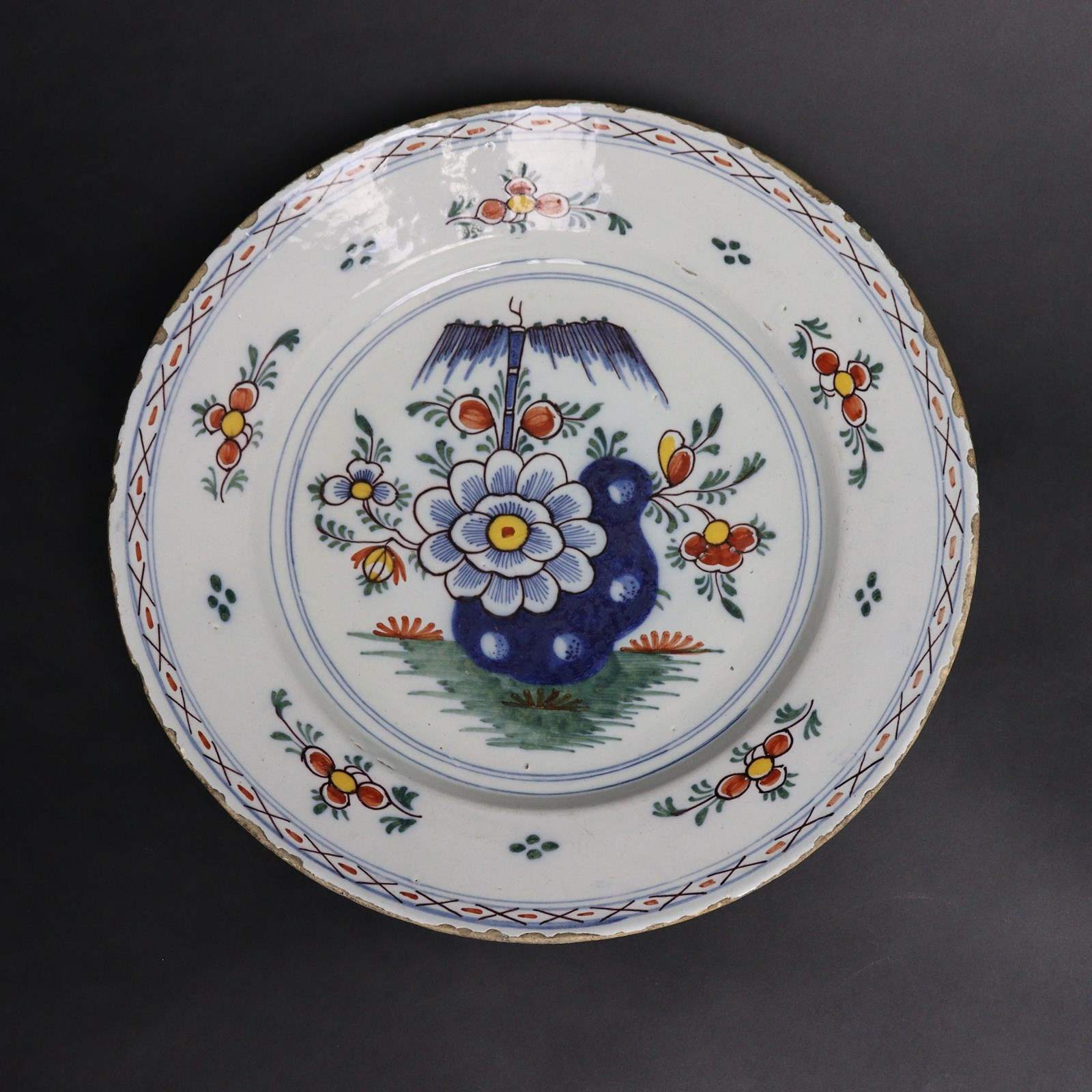 An eighteenth century, polychrome, Dutch Delft charger. This dates from c.1780. It is boldly decorated, in iron red, blue, green and yellow, with a central design including oriental style flowers and bamboo. Around this are small flower sprigs and a narrow, geometric border. There is some flaking to the glaze, around the rim, which can be seen in the image and is typical of Delft due to the soft nature of the glaze. Otherwise it is in good condition.