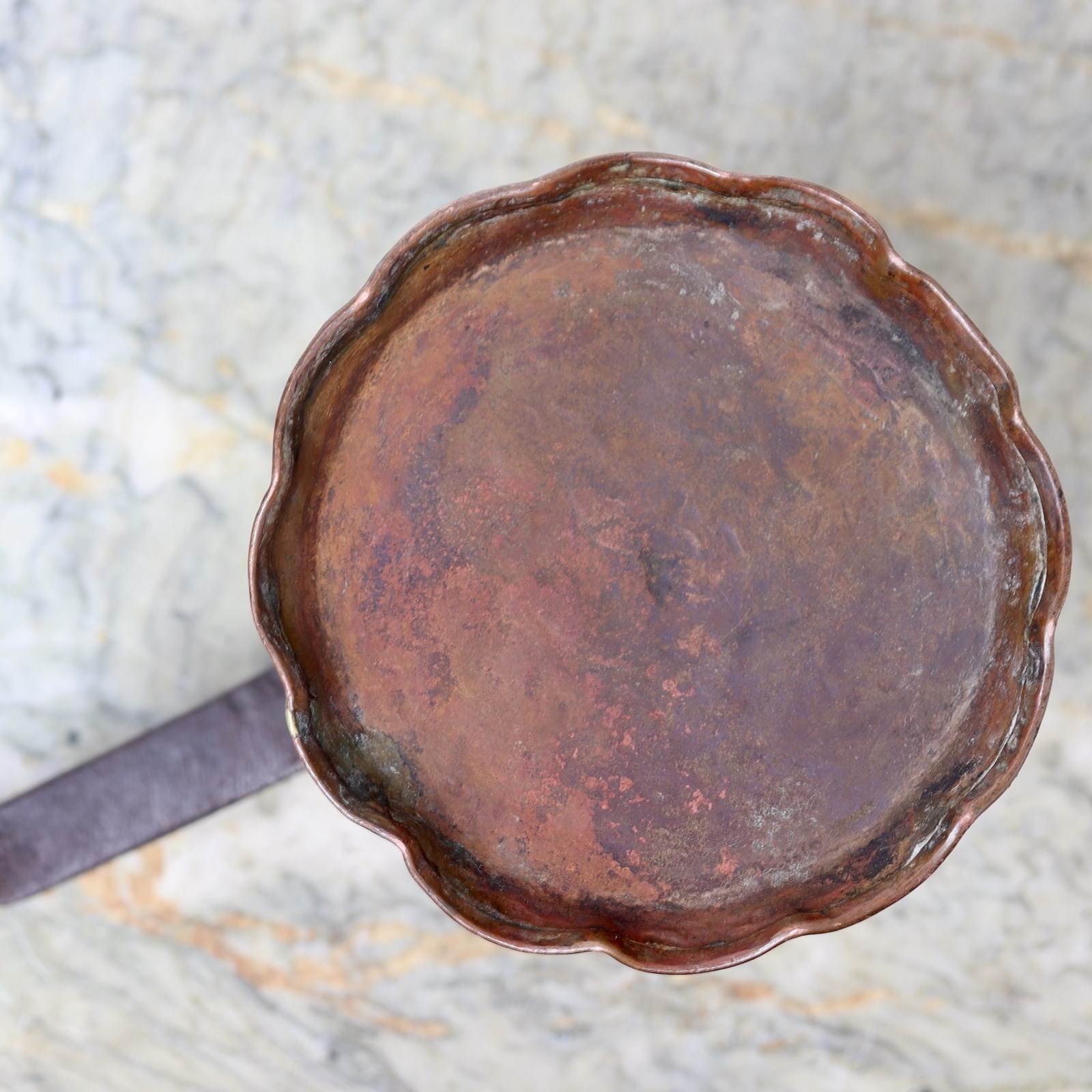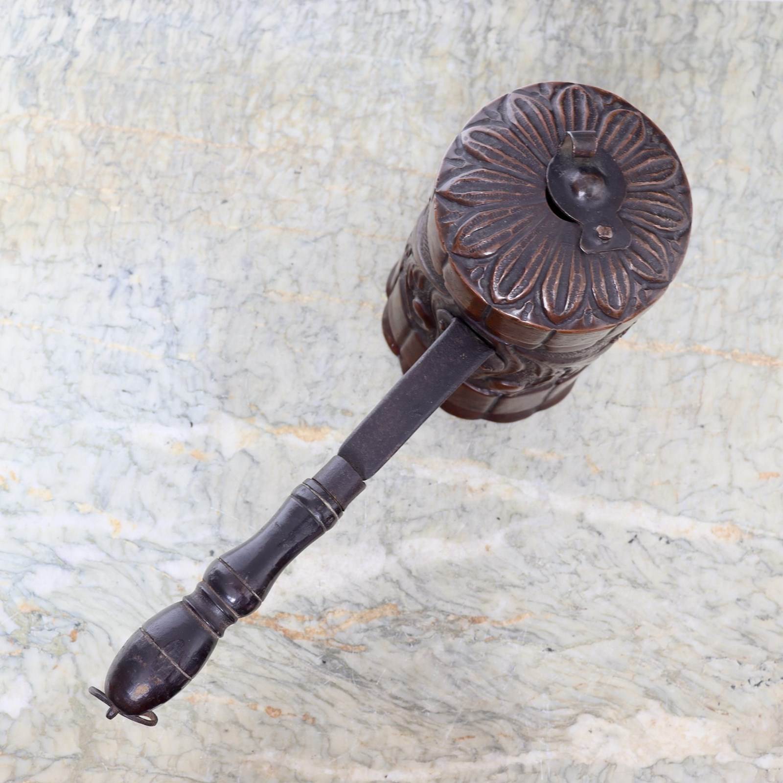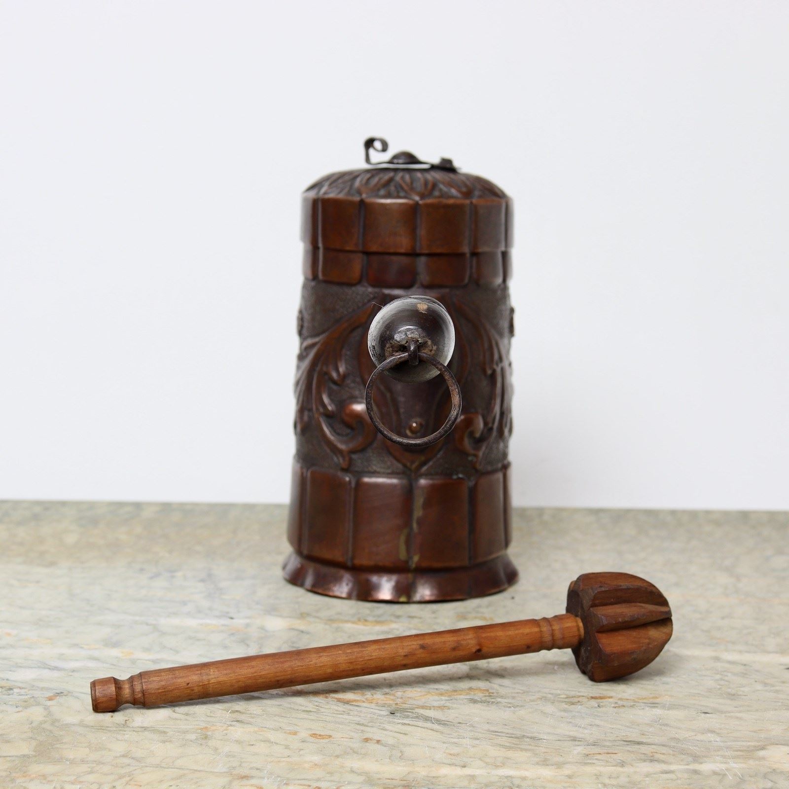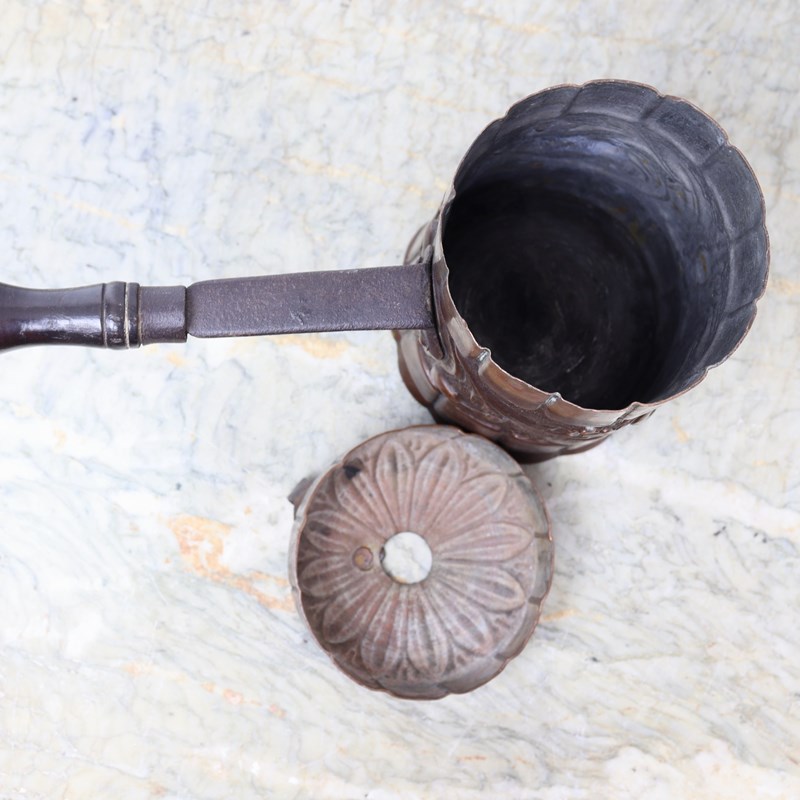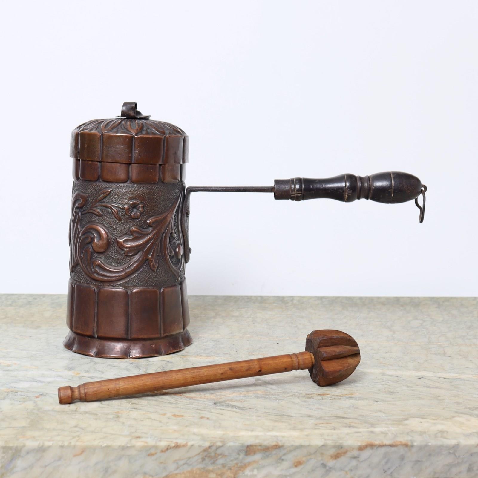 A charming, 18th century, French copper chocolate pot with embossed decoration. This dates from c.1780. The sheet copper would have been pressed with the design and then rolled into shape and joined with a castellated seam. The design consists of scrolls and flowers between wide fluted bands. The lid has a corresponding band to the rim and leaves to the top. The piece has a turned wooden handle, with steel fittings, and it comes complete with a turned wooded chocolate stirrer. We usually make all of our copper shine but this has such a wonderful patina that it would be shameful to polish it. It is in very good condition but the interior is worn.