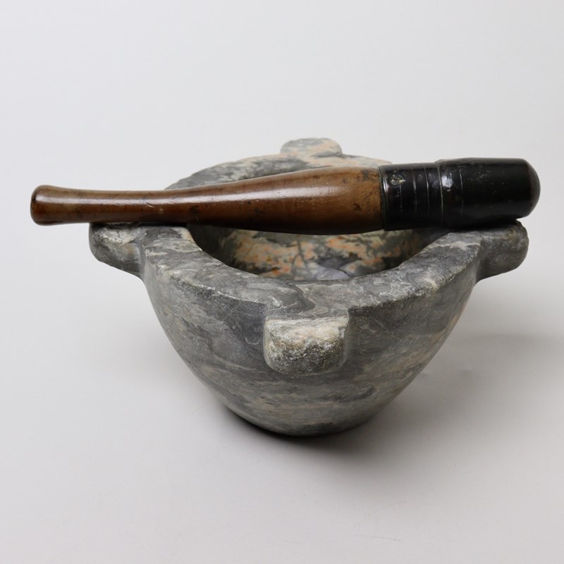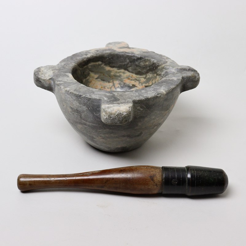 Dimensions: Mortar: Length 21.2cm. Width 20.8cm. Height 10cm. Pestle: Length 23.5cm. Diameter 3.4cm.