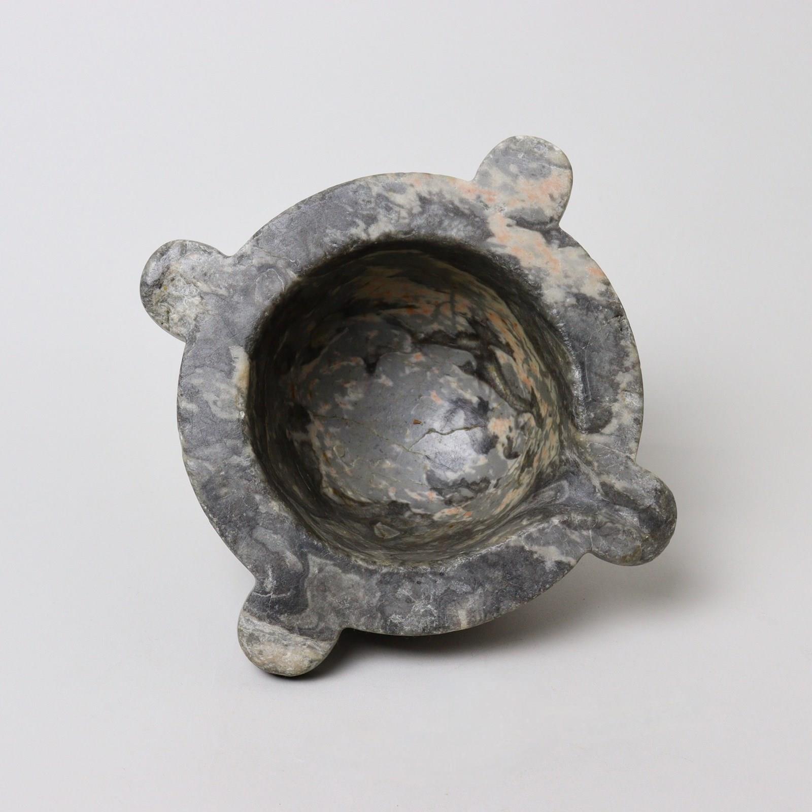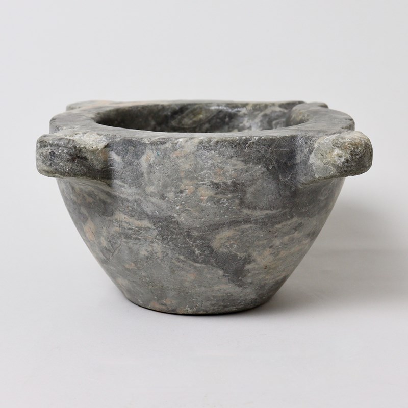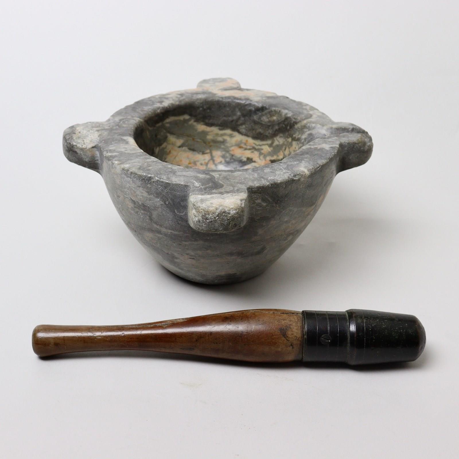 A small, eighteenth century, grey and pink marble mortar with a bronze pestle. This is a small, but useful size of mortar for grinding herbs and spices. The marble is a beautiful colour, ranging from dark to pale grey and mottled with a salmon pink. The pestle is very unusual, with a turned wooden handle and a bronze end. With age the wooden handle, which is possibly walnut, has warped a little and has much character. There is a crack in the wooden handle and the mortar has slight chipping to all of the lobes. This can be seen in the images.
