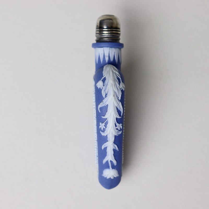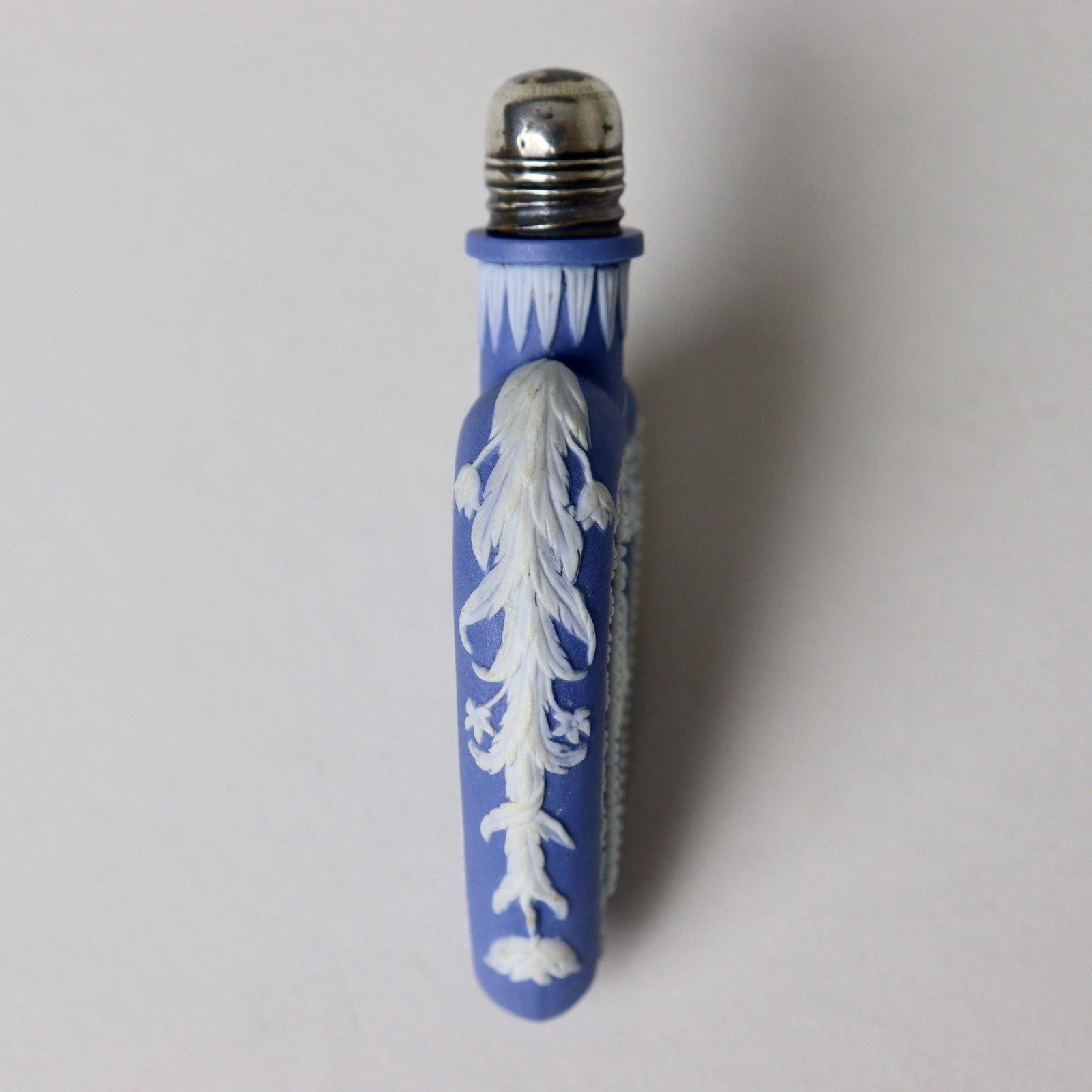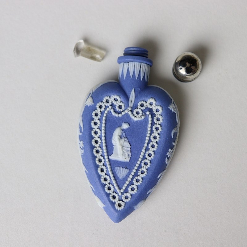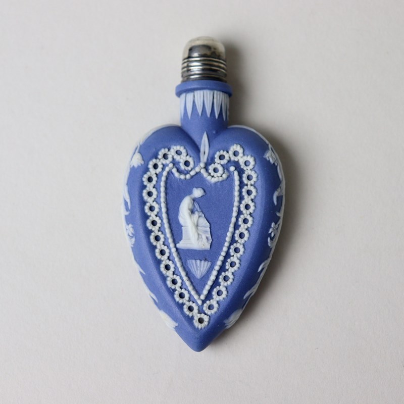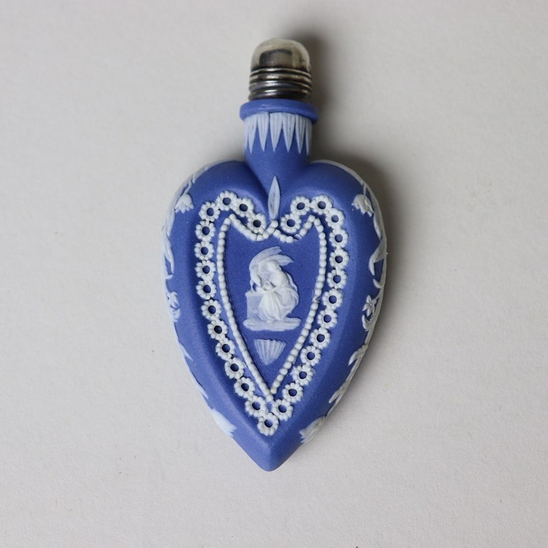 A super quality, 18th century, blue jasper, heart shaped perfume bottle. This has no potters marks but it was probably made by Wedgwood or Turner and it dates from c.1790. The classical subjects are surrounded by a shield shaped cartouche and there are beautiful floral reliefs to the sides. All of the reliefs are of the finest quality. There is very slight damage to the classical relief on one side and to the beaded border on both sides. The piece has a silver lid and a glass stopper which has a chipped end.