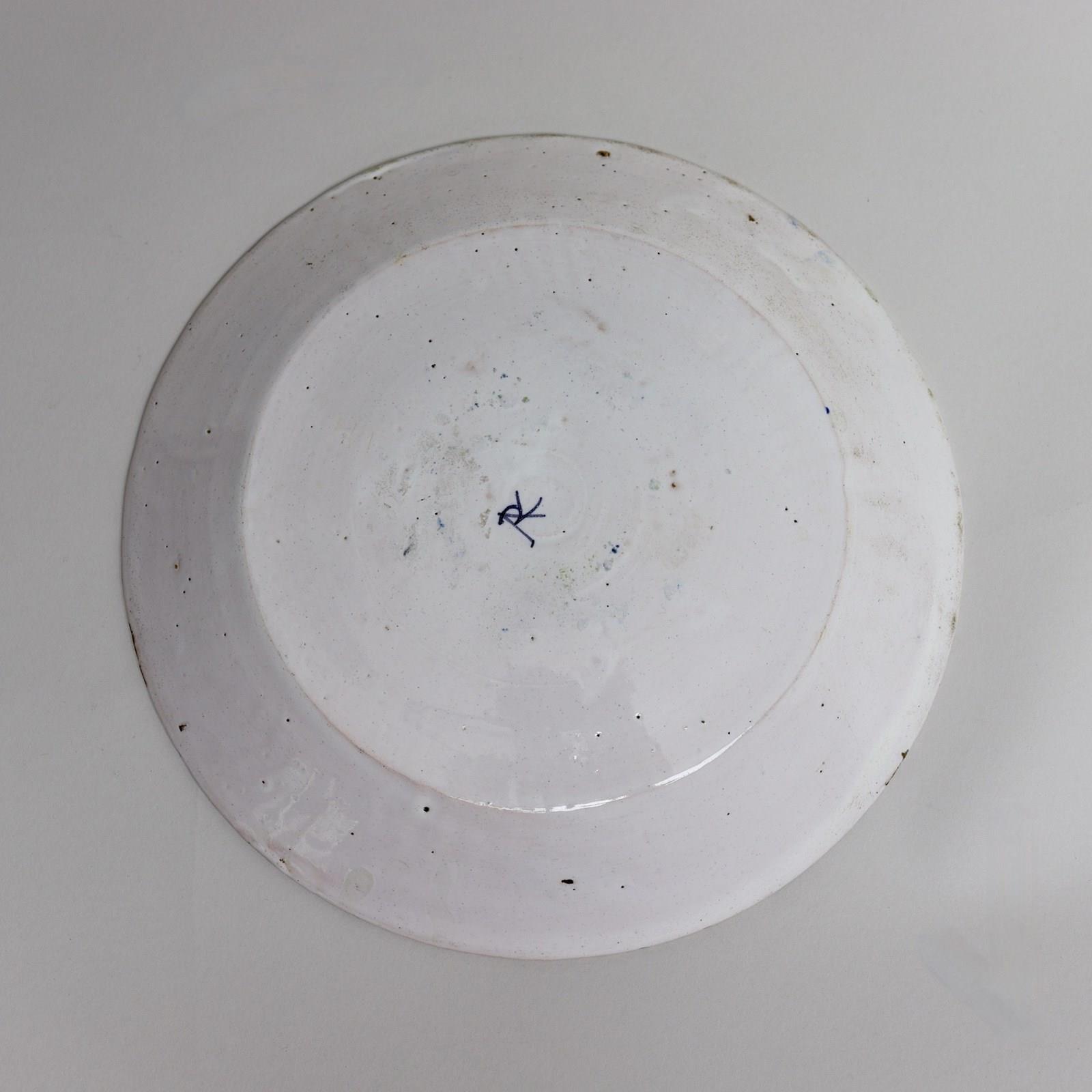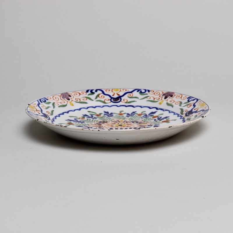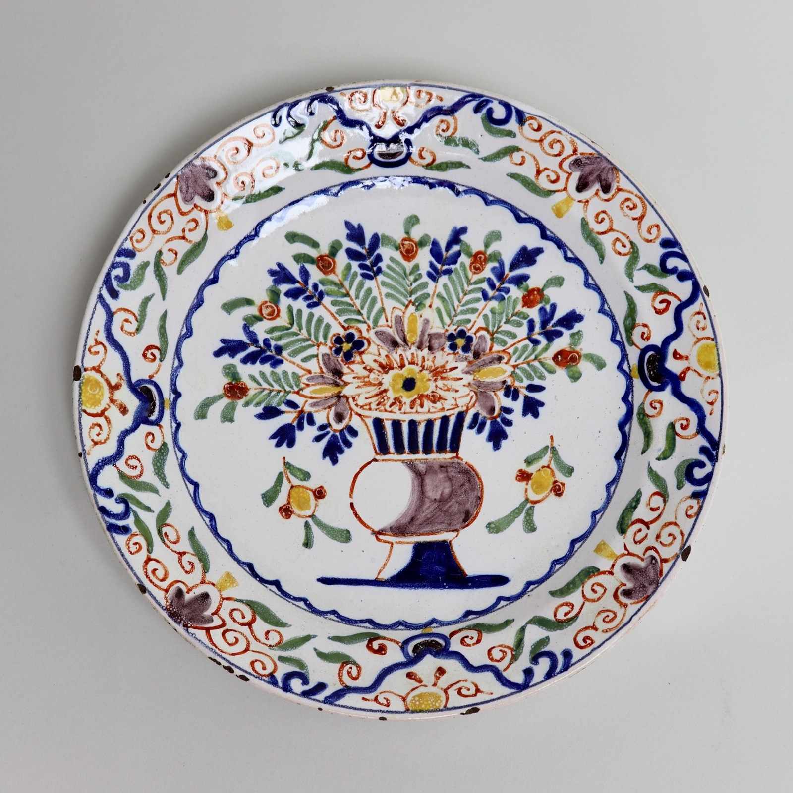 An eighteenth century, polychrome Dutch Delft plate. This is painted, in blue, with a monogram of the makers initials and it dates from c.1780. It is decorated in manganese, blue, green, ochre and iron red, with a central vase of flowers. There is wear to the glaze on the rim, as is usual with tin glazed earthenware due to the soft nature of the glaze, and there is a very fine, hairline crack to the rim.