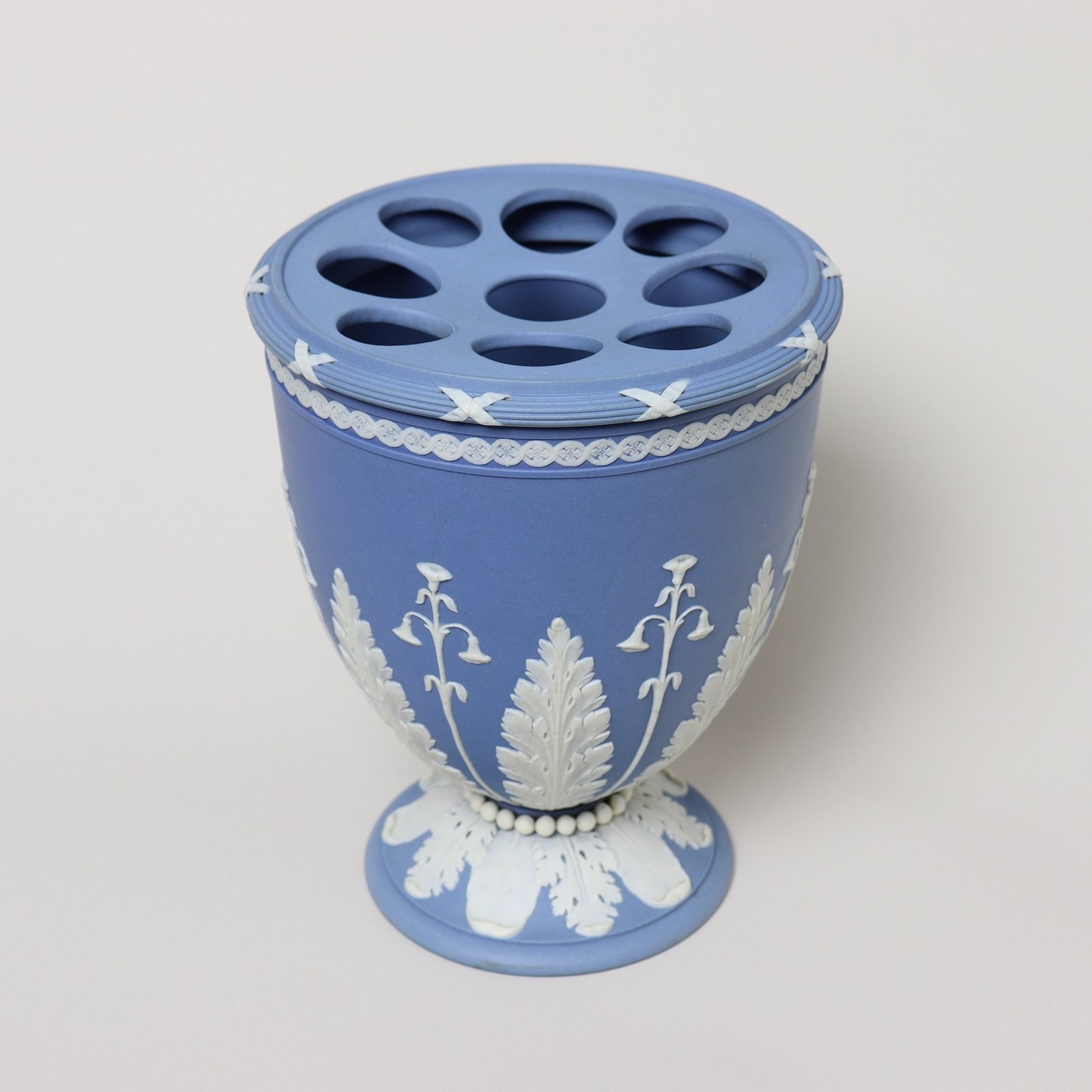 A super quality, 18th century, Wedgwood, solid blue jasper bough pot and cover. This is marked “WEDGWOOD” and it dates from c.1780. It would have been used to contain boughs of flowers. The solid, blue jasper body is decorated, in white relief, with a band of harebells and acanthus and to the rim is a narrow scroll border. There are large beads of white jasper around the foot which is decorated with alternating types of leaves. The rim of the lid is reeded and decorated with crossed ribbons. The reliefs are all very good quality. The jasper to the underside of the lid is a slightly different colour to the rest of the piece but there is no damage or restoration. Both the vase and lid are in excellent condition.