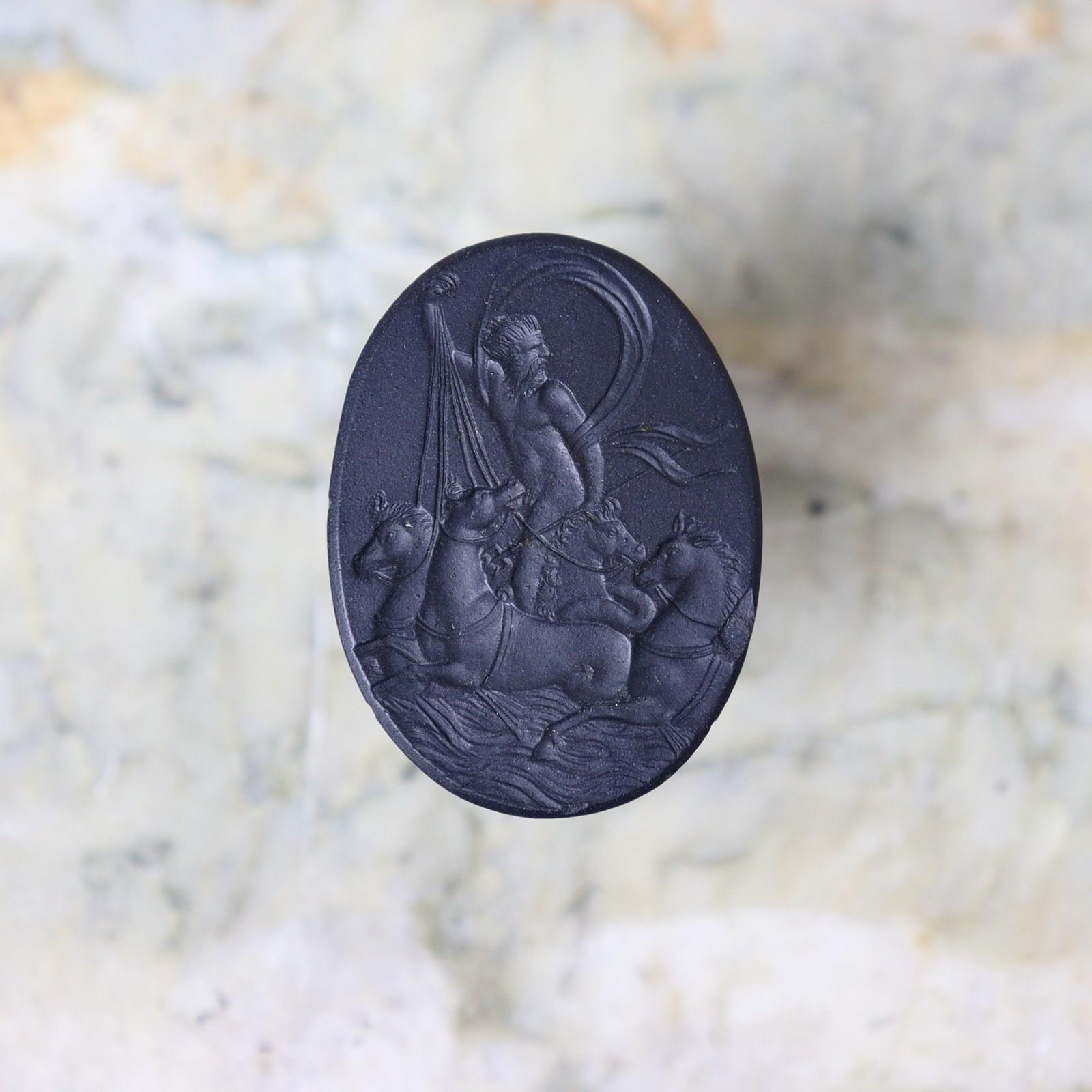 An eighteenth century Wedgwood, polished basalt seal impressed with Neptune riding his chariot across the sea. This is unmarked and it dates from c.1775. During this period Wedgwood produced the finest quality seals and, if the basalt or jasperware were polished, as in this case, they were very rarely marked and this was thought to spoil the appearance. This design in the seal is beautifully detailed, and superb quality, as one would expect from a piece of this period. There are three very small chips to the rim.