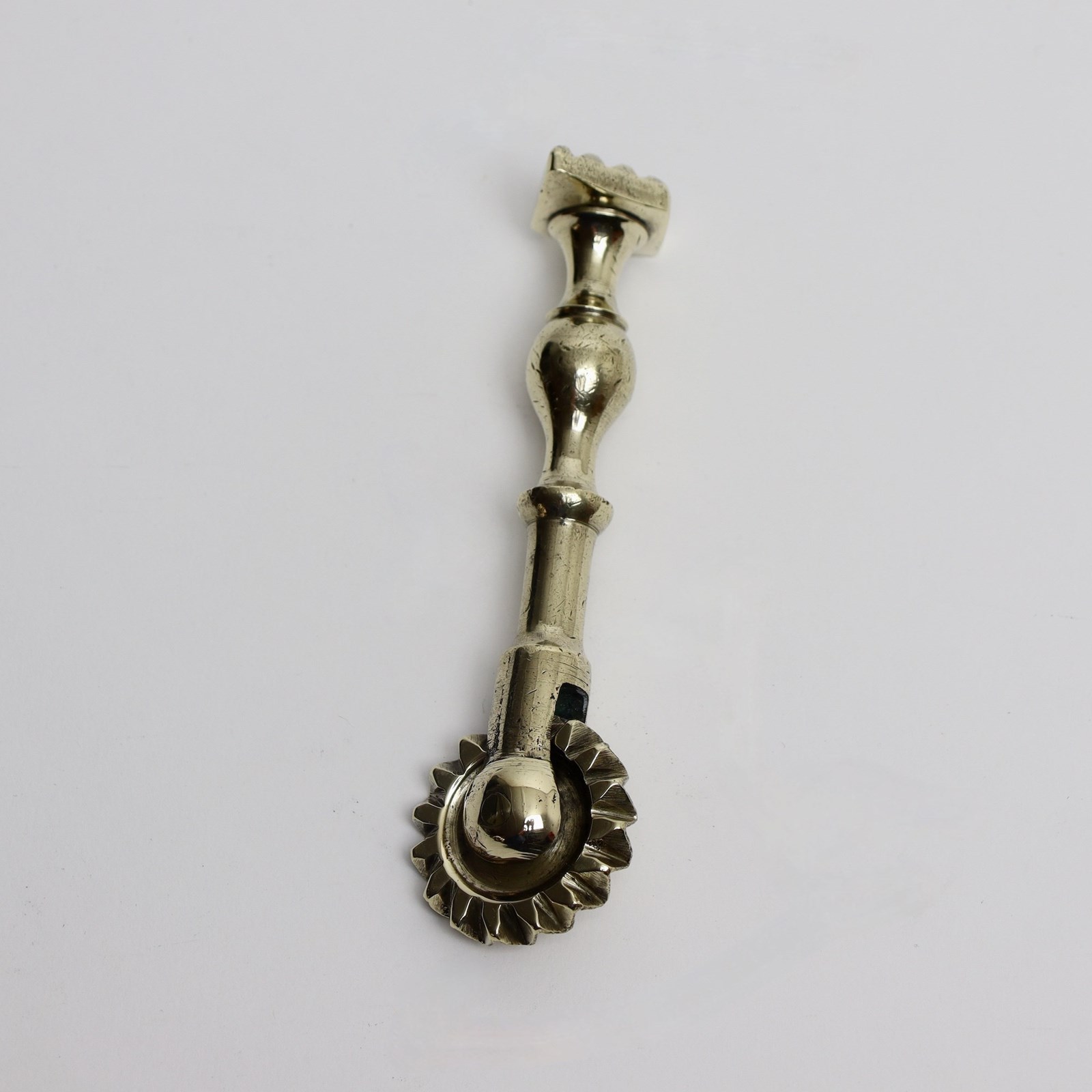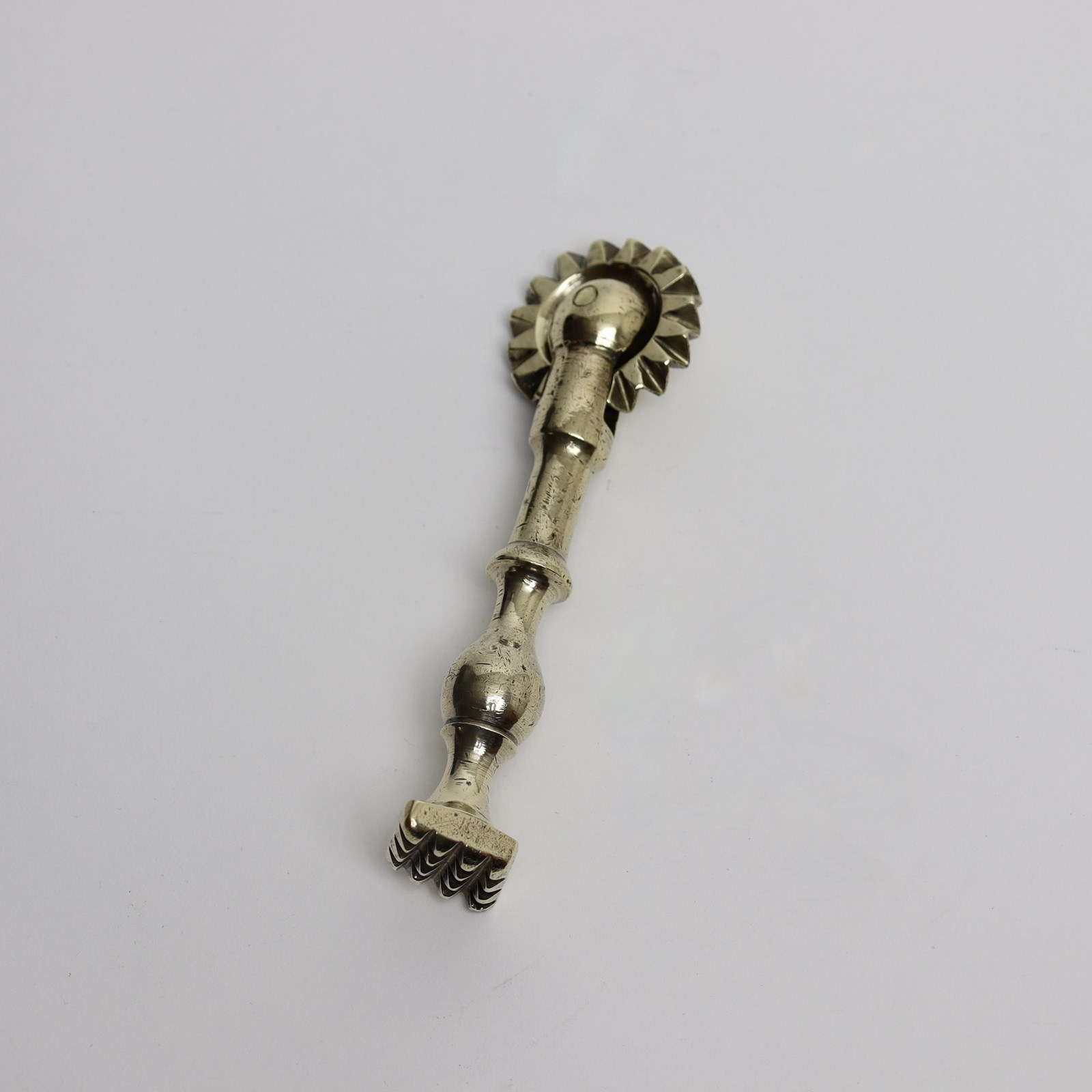 A lovely quality, 19th century, brass pastry tool. This is English and it dates from c.1860. It is cast in brass, has a substantial brass wheel to one end, for trimming the rim of a pie, and a diamond shaped stamp to the other end for impressing a design into the pastry. It is in excellent condition.