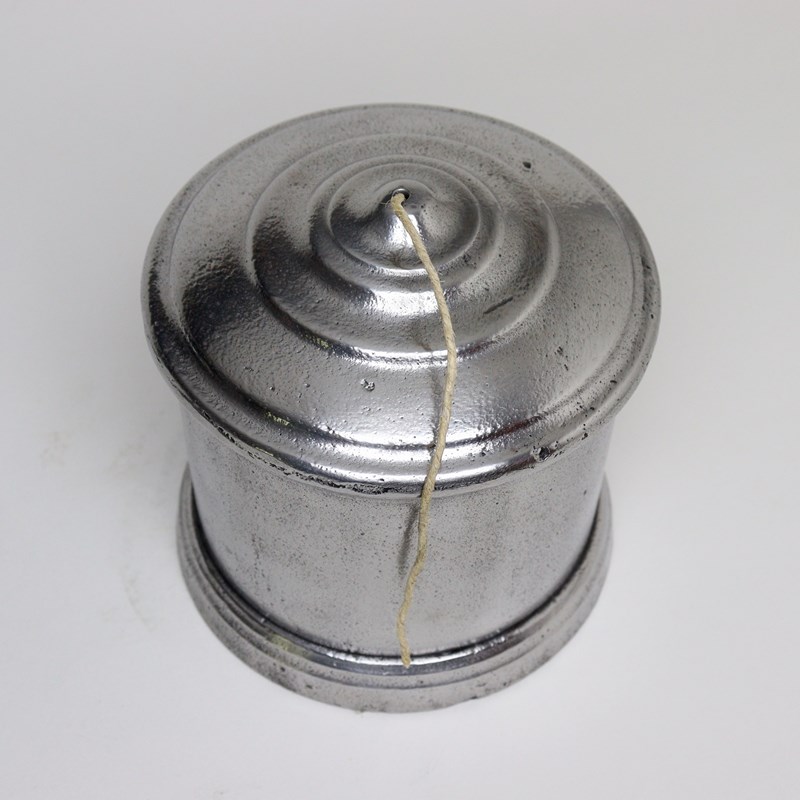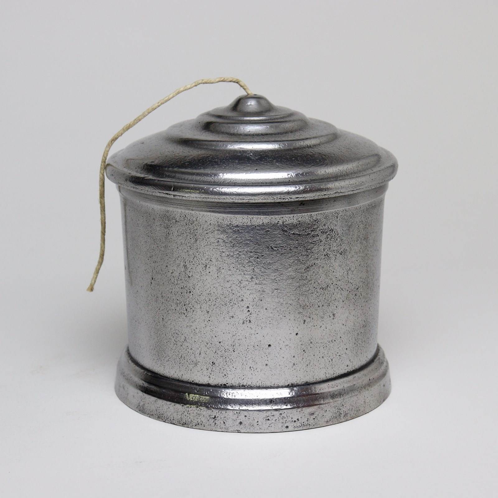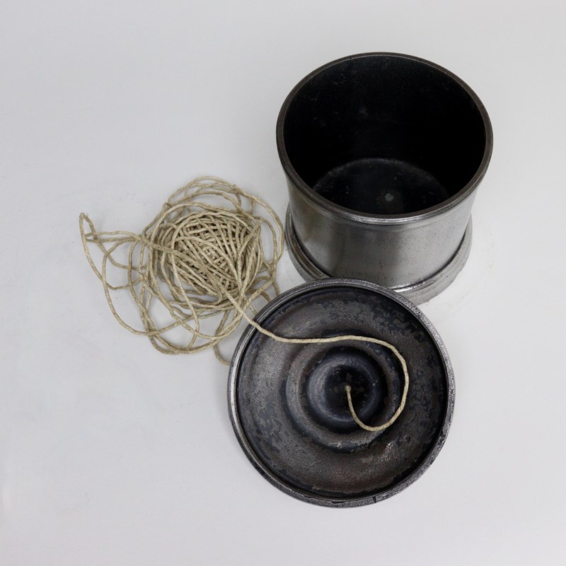 A nineteenth century, polished cast iron string box. This has a screw fitting lid and the simple shape is very practical but would also good in a kitchen. It is in very good condition.