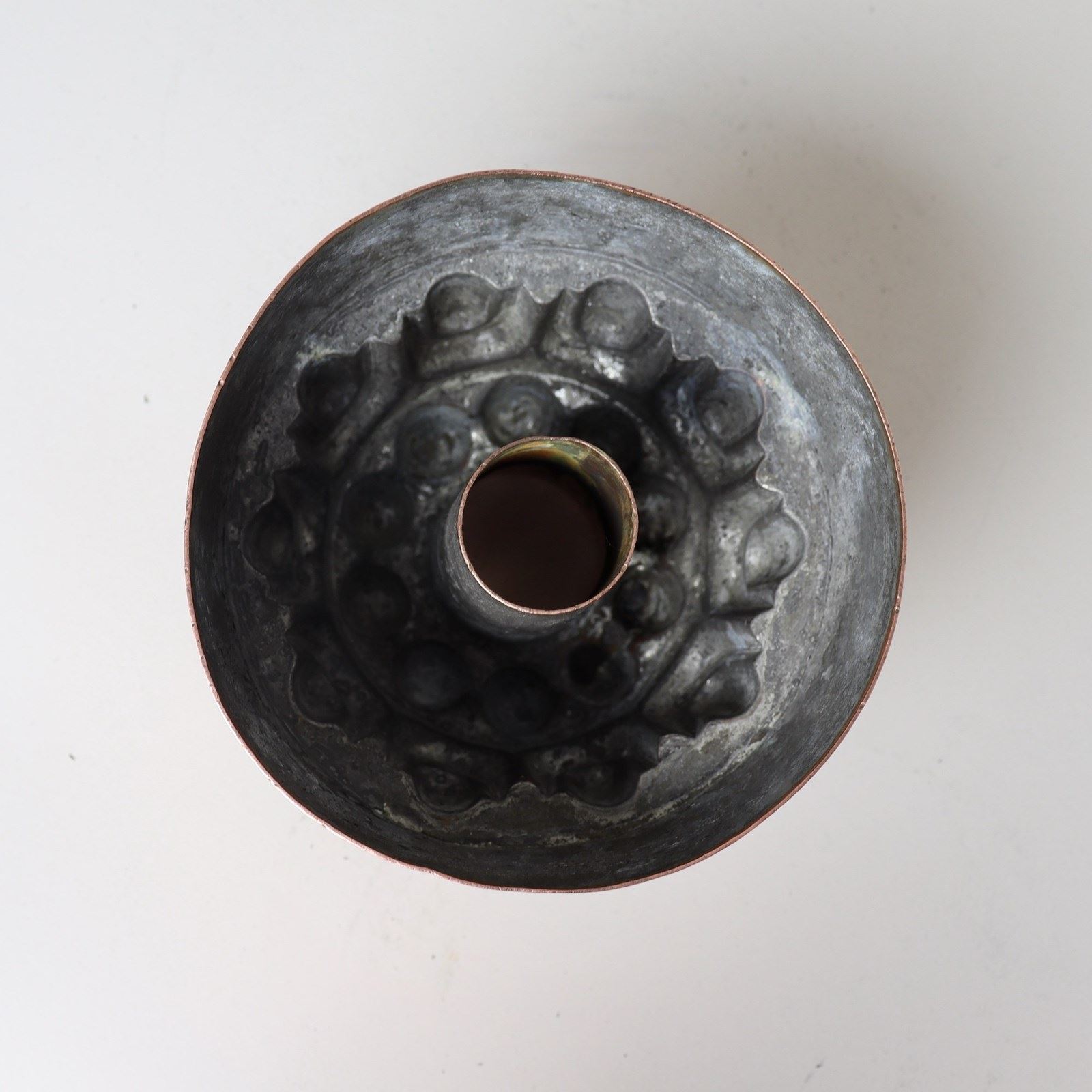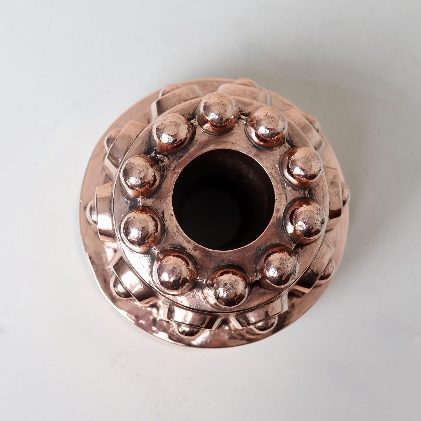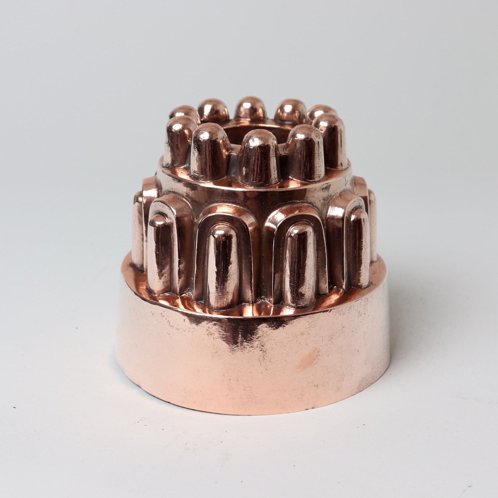 A nineteenth century copper ring mould. This is probably French and it dates from c.1890. The design consists of two tiers of rounded topped columns around a central pipe. There is very slight pitting to the copper but other than that the mould is in good condition. The tinning, to the interior, is worn.