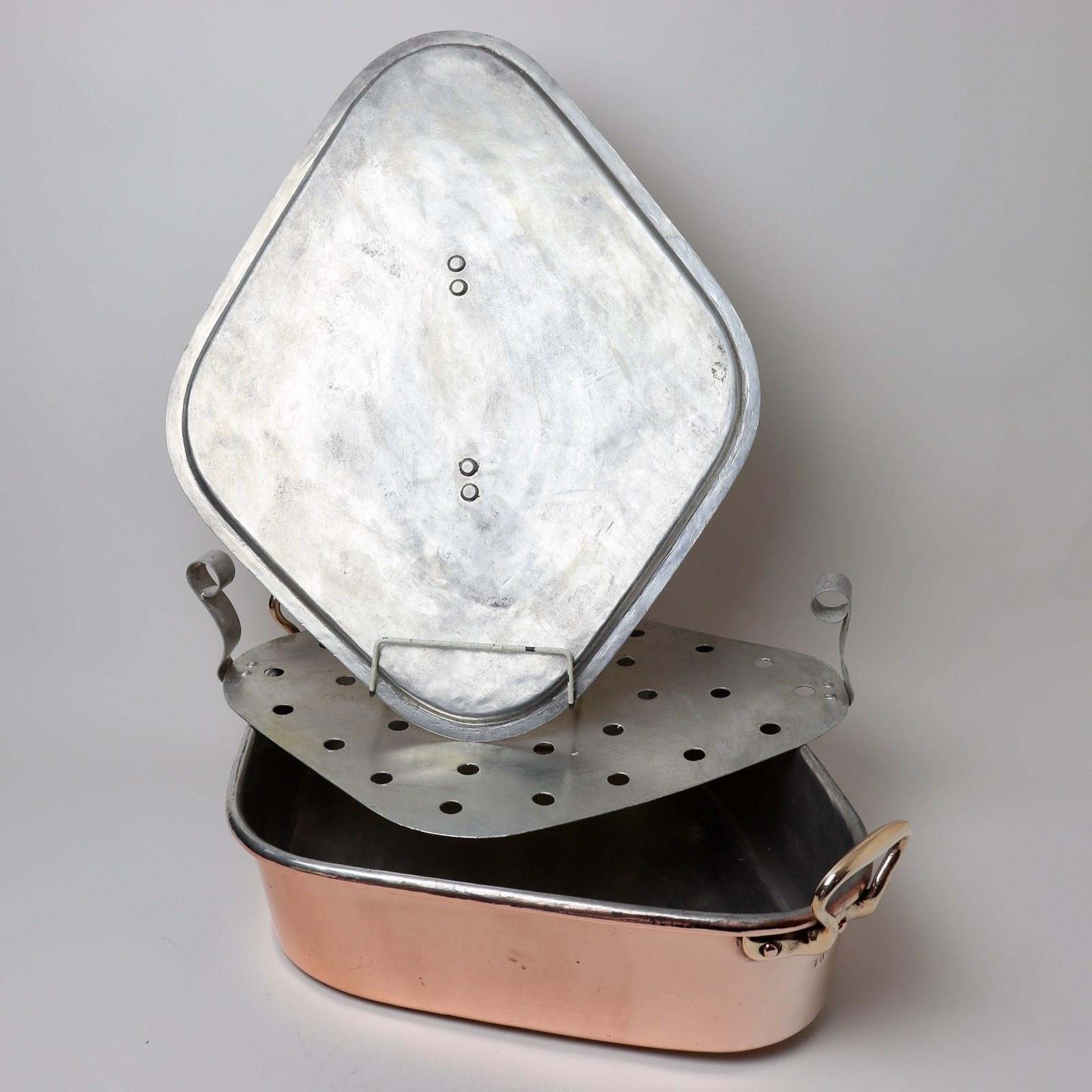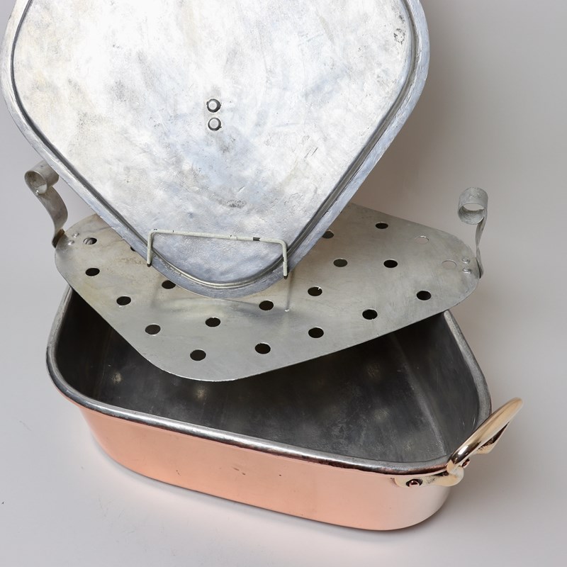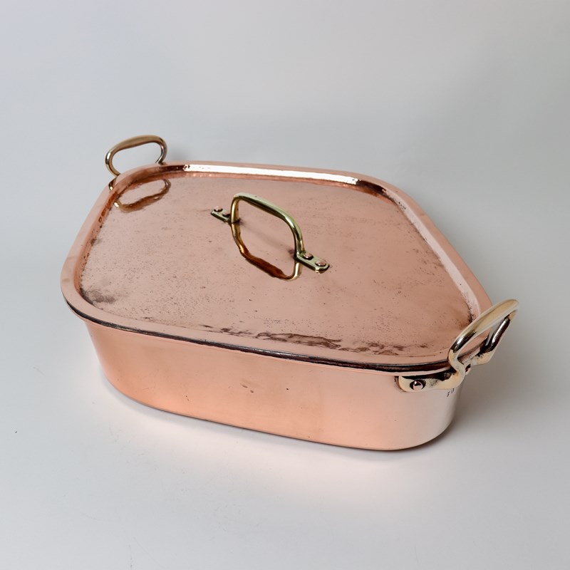 A nineteenth century, French copper turbotiere. This is well made, from a heavy gauge of copper, and it dates from c.1860. The pan has castellated seams around the base, and up one end, and it has the typical, French form of brass handles to either end. It is stamped with a number “50” which relates to the internal length in centimetres. The lid has a simple form of brass handle which is attached by raised rivets. The turbotiere is complete with a copper drainer and the interior has been fully re-tinned so that it can be used. The pan is in very good condition but the lid is showing a lot of pitting, from use.