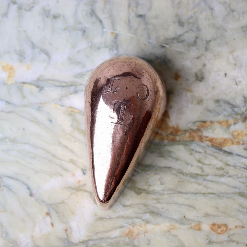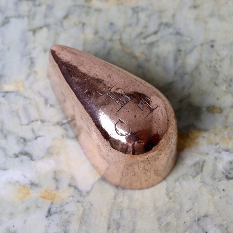 A 19th century, miniature copper mould in the shape of a deep teardrop. This is well made, from a heavy gauge of copper. It is English and it dates from c.1880. The top of the mould is nicely engraved with the letters “L C T” which would be the initials of the original owner. It is in excellent condition and the tinning, to the interior, is still in very good, bright, usable condition.