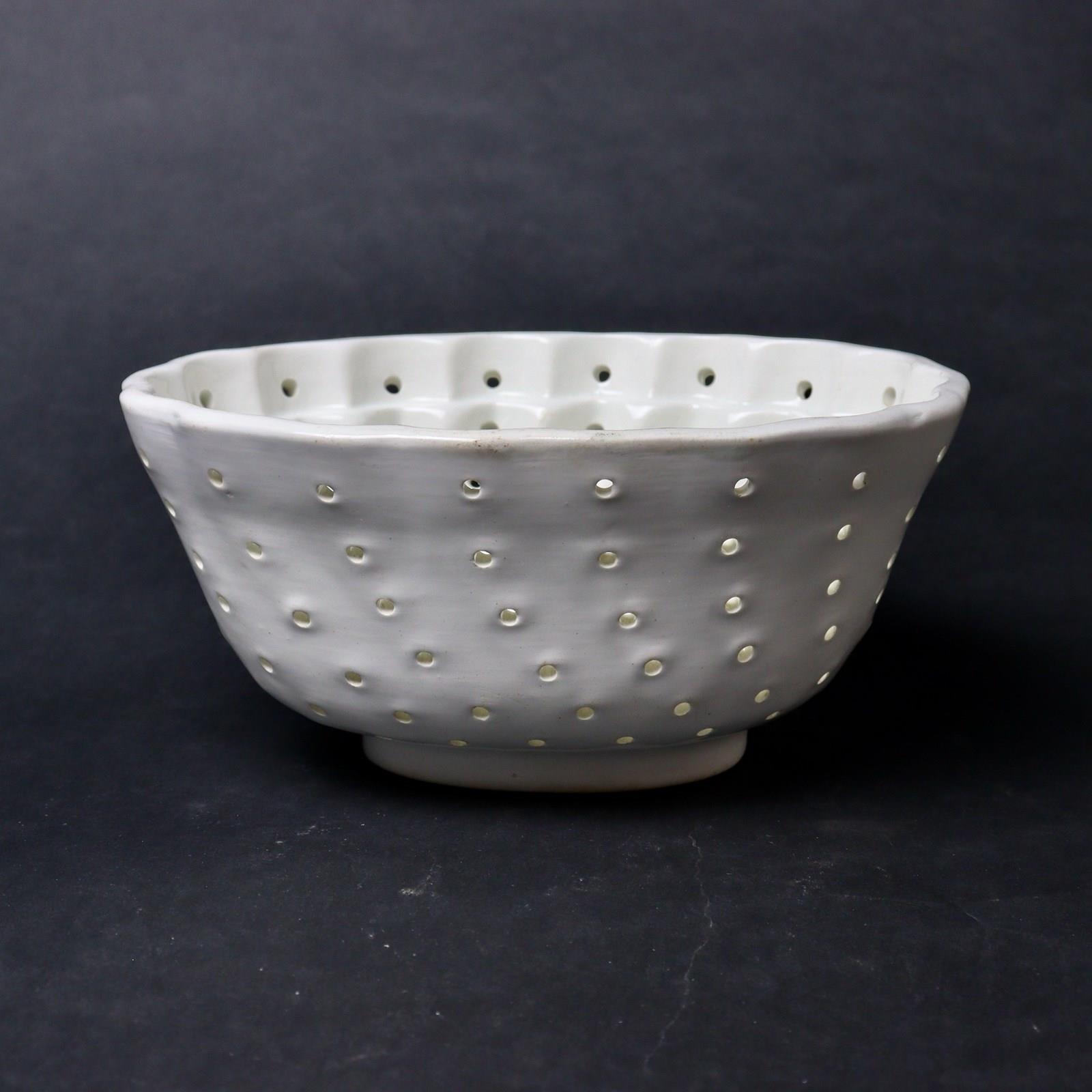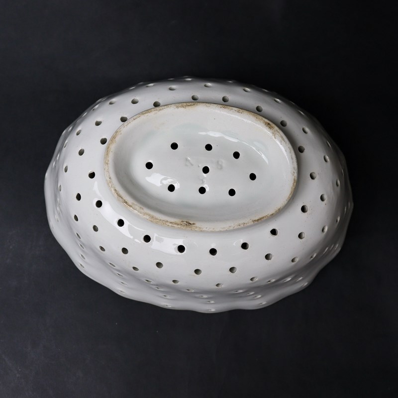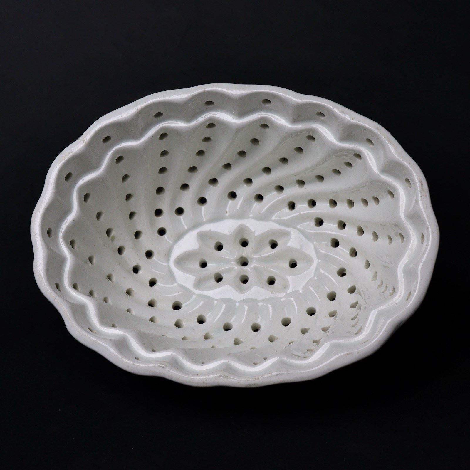 A nineteenth century, Minton curd cheese mould of geometric form. This does not have the Minton mark but it is stamped with the numbers “No.28” over “3”. This is the Minton pattern number relating to the 1848 catalogue. The mould is made from a heavy earthenware and it dates from c.1880. Once the whey has drained from the cheese it would turn out a very attractive, spiralling design. It is in excellent, usable condition.