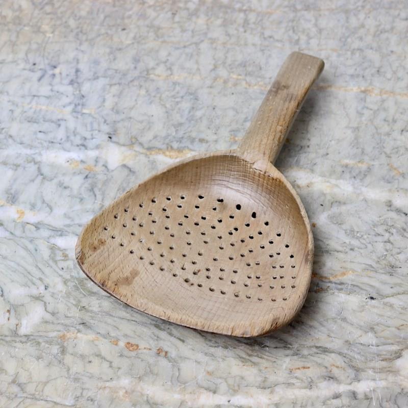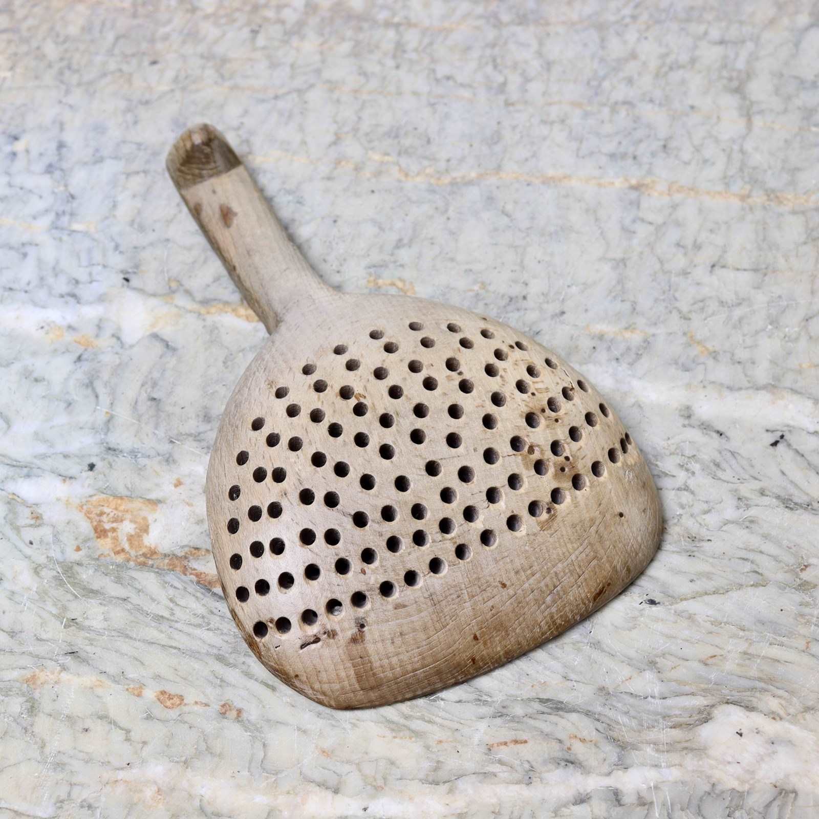 A nineteenth century beechwood cream skimmer. This is English and it dates from c.1840. It would have been used in the dairy to skim the cream from the milk. There is wear to the rim, as one would expect, and there are a couple of small stains to the wood but generally it is in very good condition.