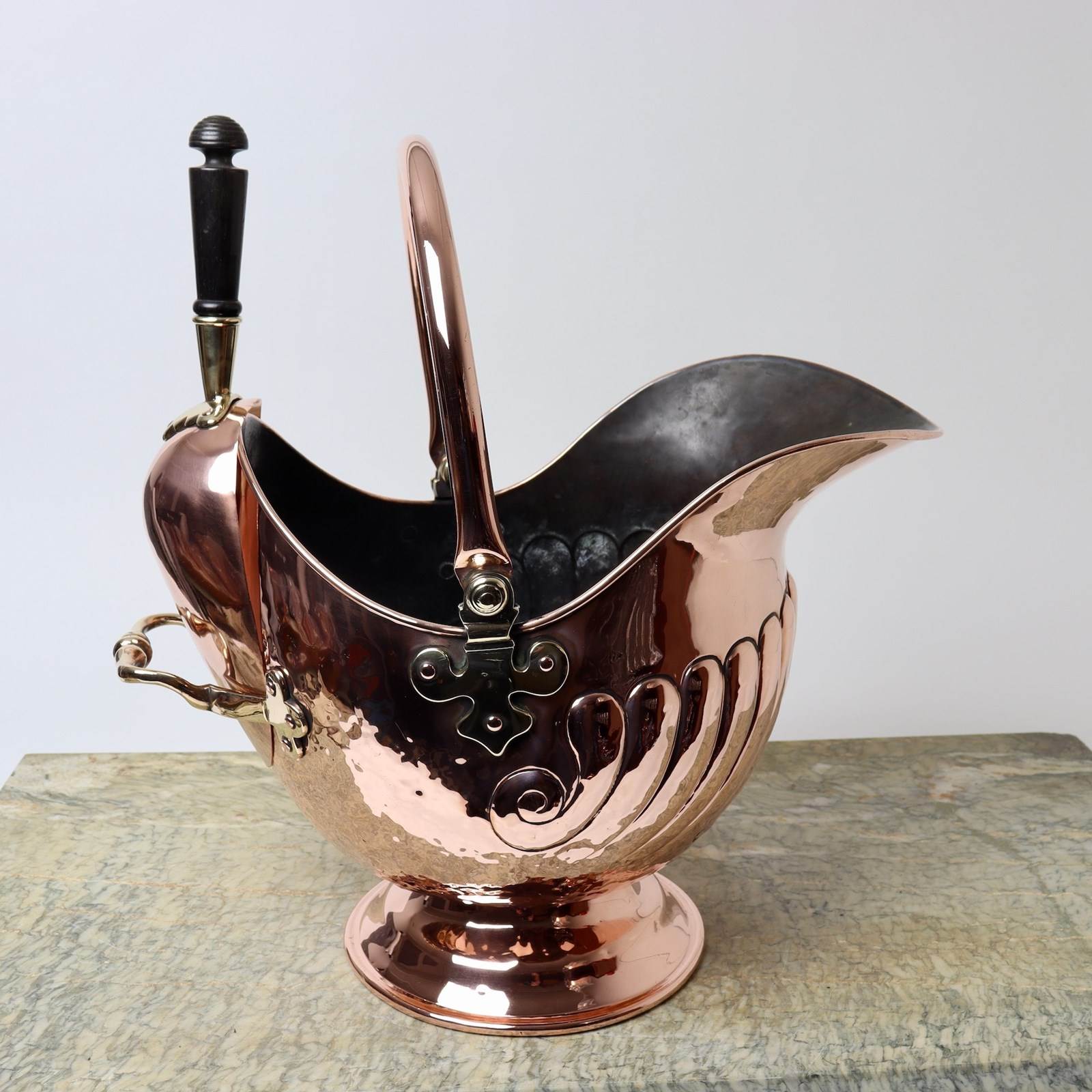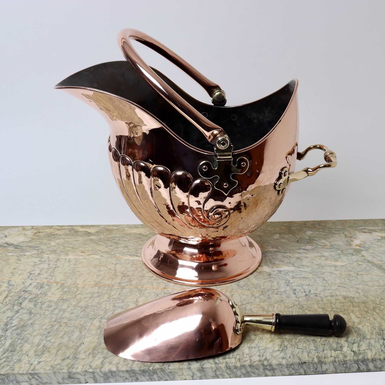 Dimensions: Scuttle: Height 47.5cm. Length 45.5cm. Width 29cm. Scoop: Length 35cm. Width 14cm. Depth 7cm.