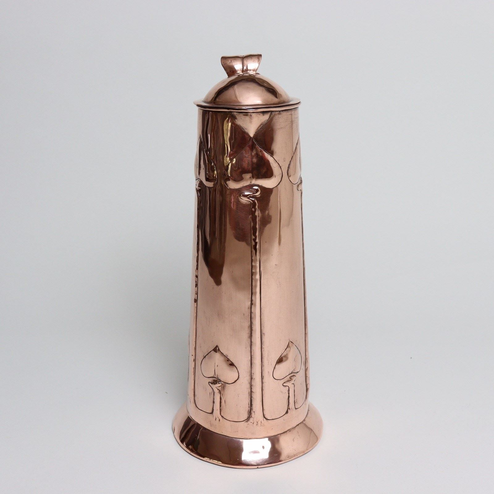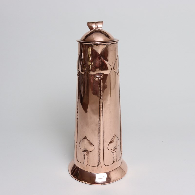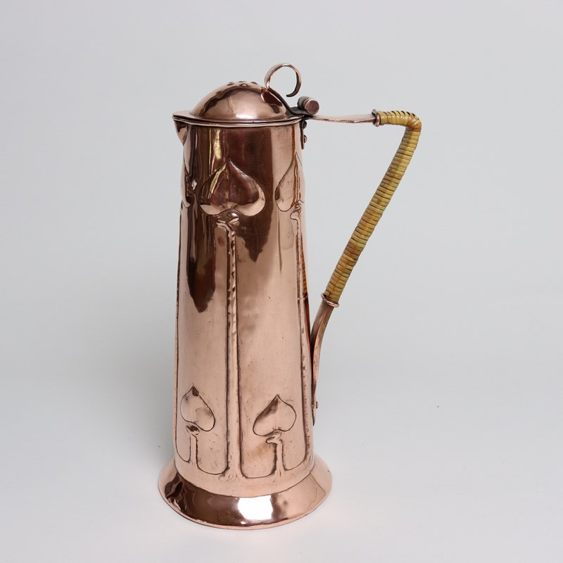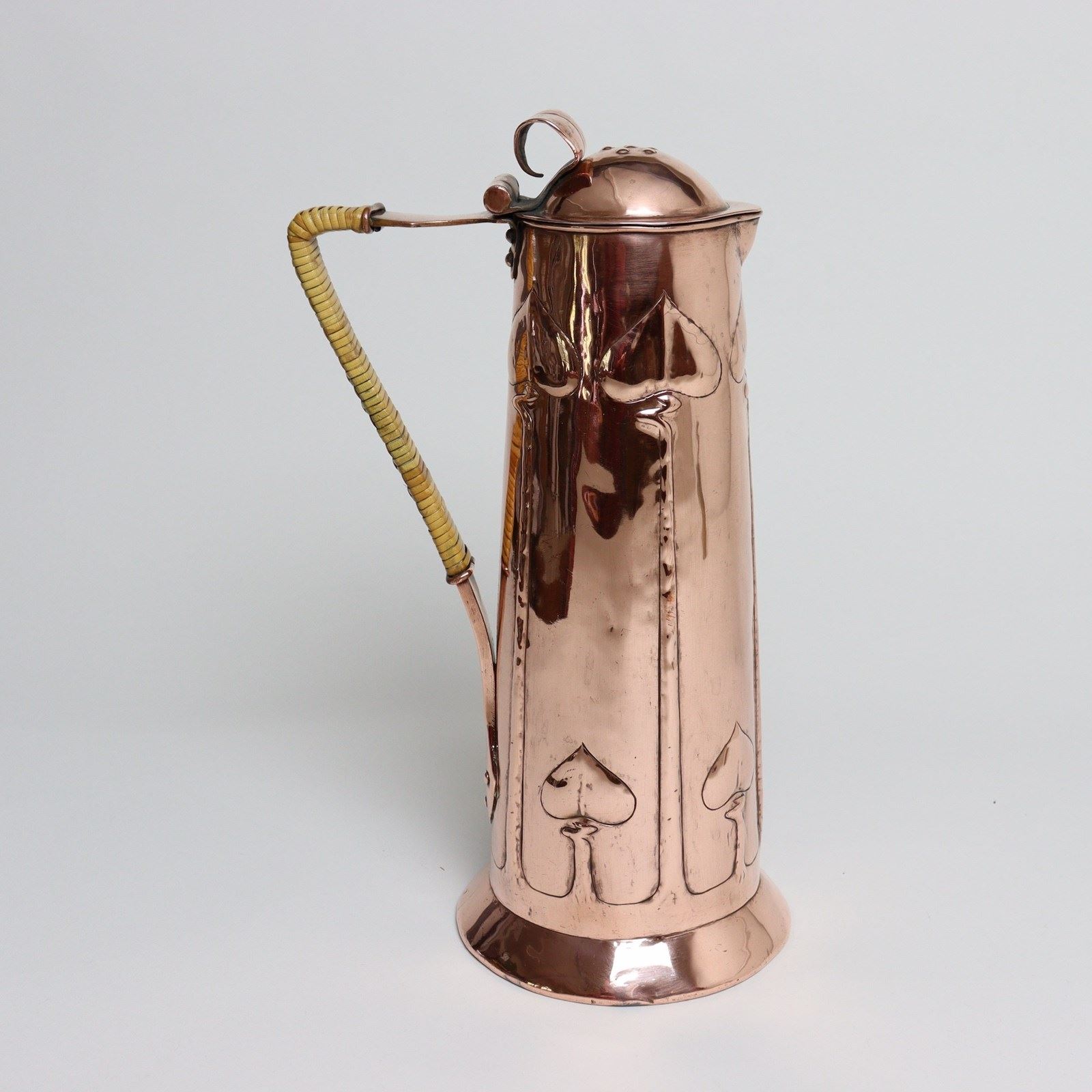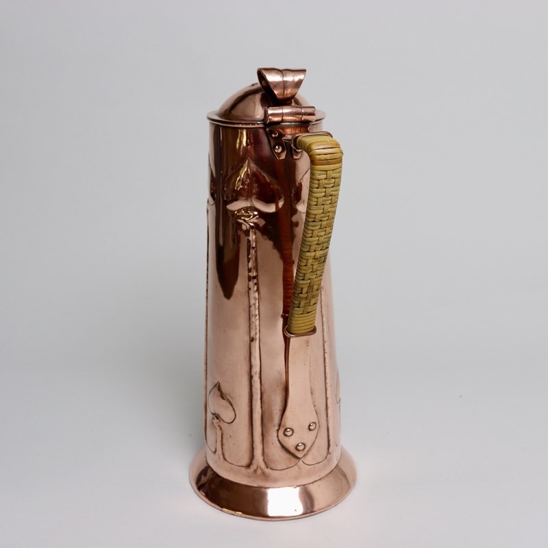 A very attractive, Arts Nouveau copper jug. Thin is English and it dates from c.1900. It is well made, from a substantial gauge of copper, and the design to the sides is very typical of the Arts Nouveau movement. It has a hinged lid and the handle is bound with cane. It is in excellent condition.