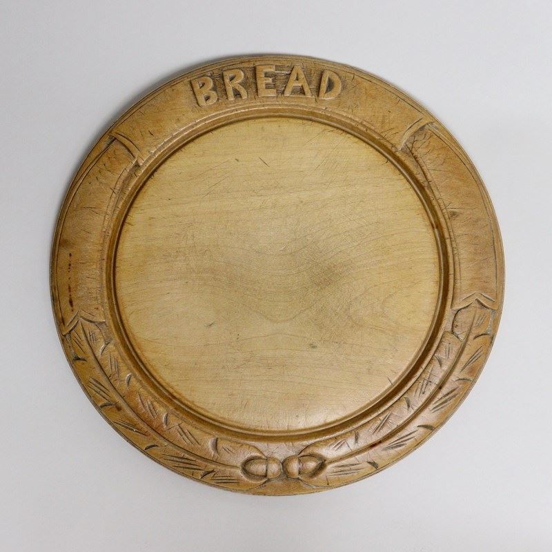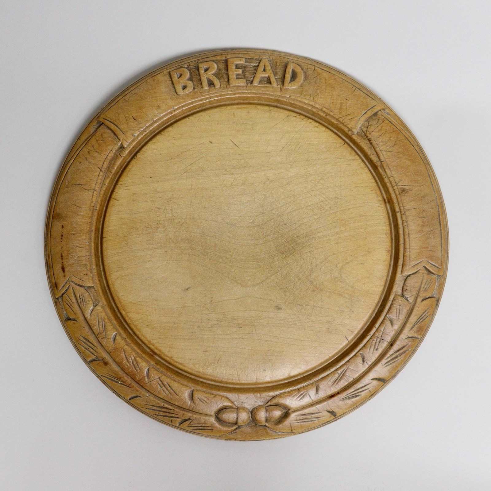 A late 19th century, beechwood breadboard. This is English and it dates from c.1890. The border is quite deeply carved with “BREAD”, opposite acorns, with long, stylised leaves and cartouches between. The board is in very good condition, with no splits. The centre is quite deeply dished where the board has been well used, and the wood has a rich patina.
