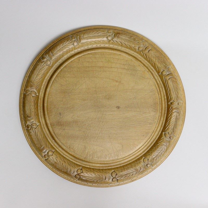 An early 20th century, beechwood breadboard. This is English and it dates from c.1910. The border is chip carved with a simple, repeated, stylised leaf and berry design. The board is in very good condition, with just the usual knife marks to both the face and the reverse of the board, from use. The wood has a lovely, rich patina.