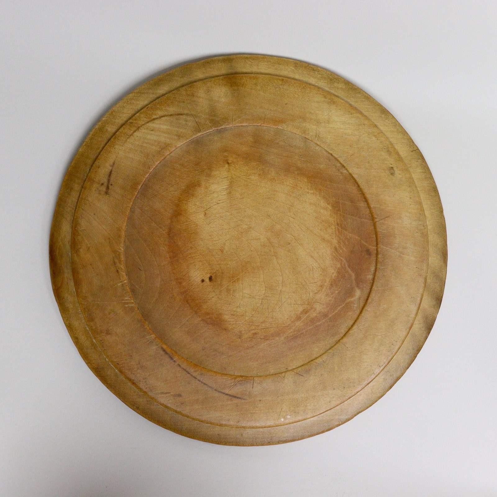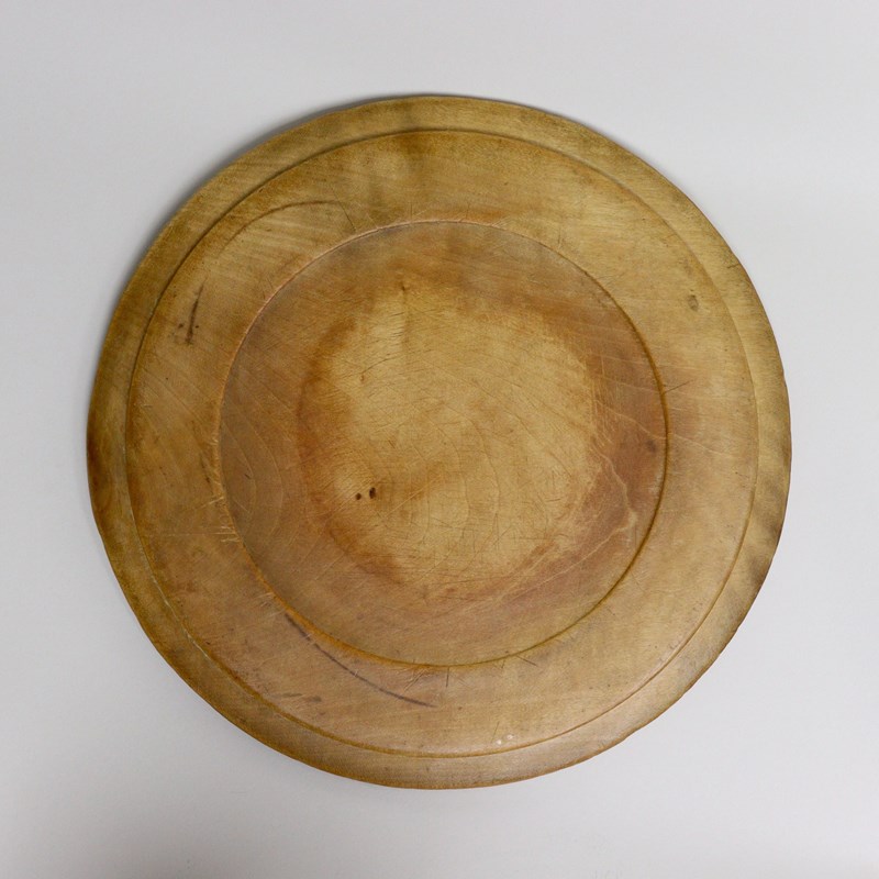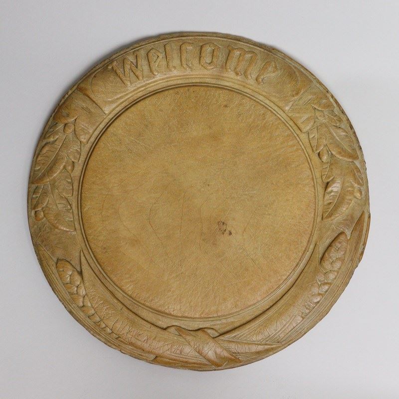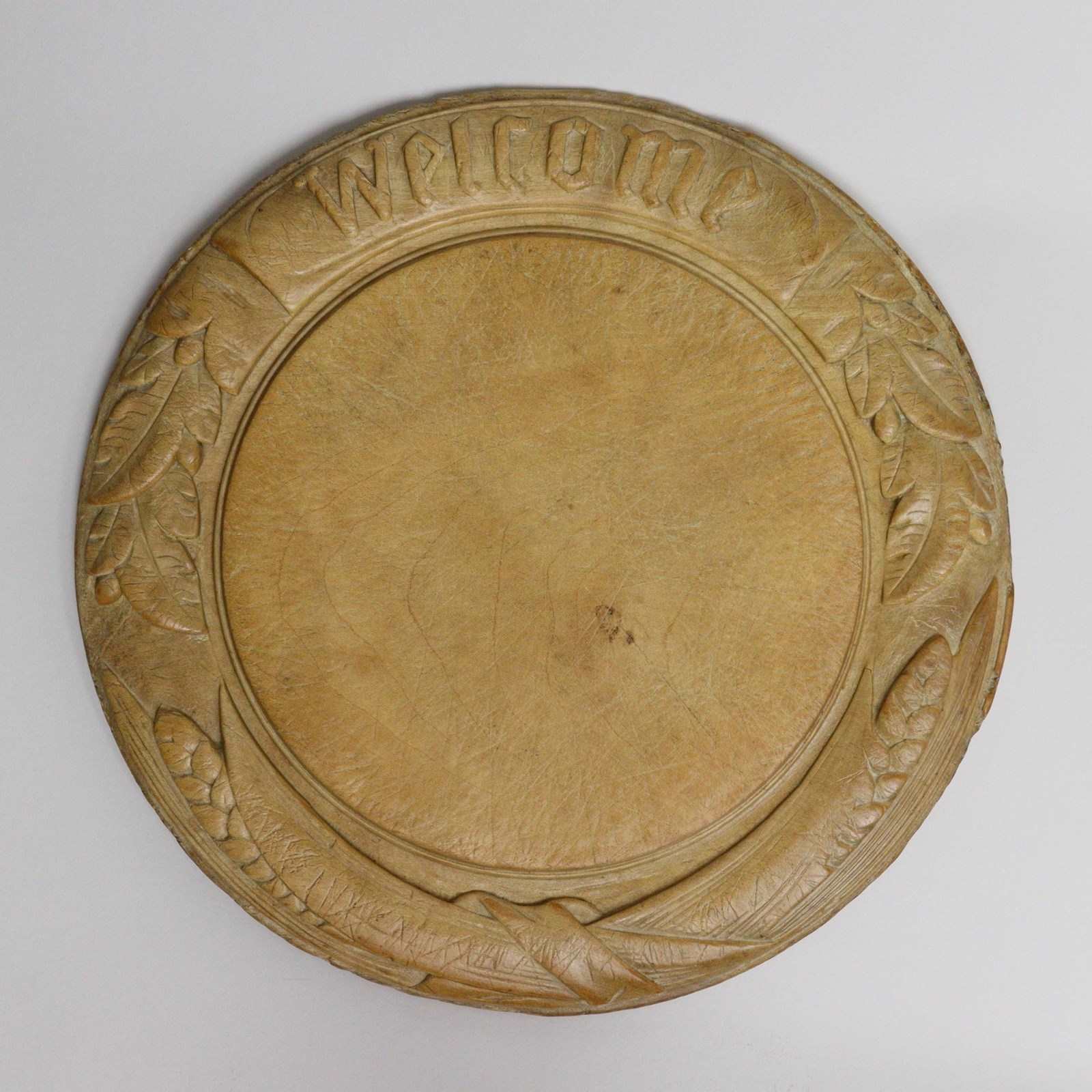 A well carved 19th century, beechwood breadboard. This is English and it dates from c.1880. The border is deeply carved with “Welcome” set between oak leaves and acorns and long ears of wheat. The carving is slightly worn but still has very good depth and detail. There are no splits, just the usual knife marks to both sides of the board, from use, and there is minor chipping to the rim.
