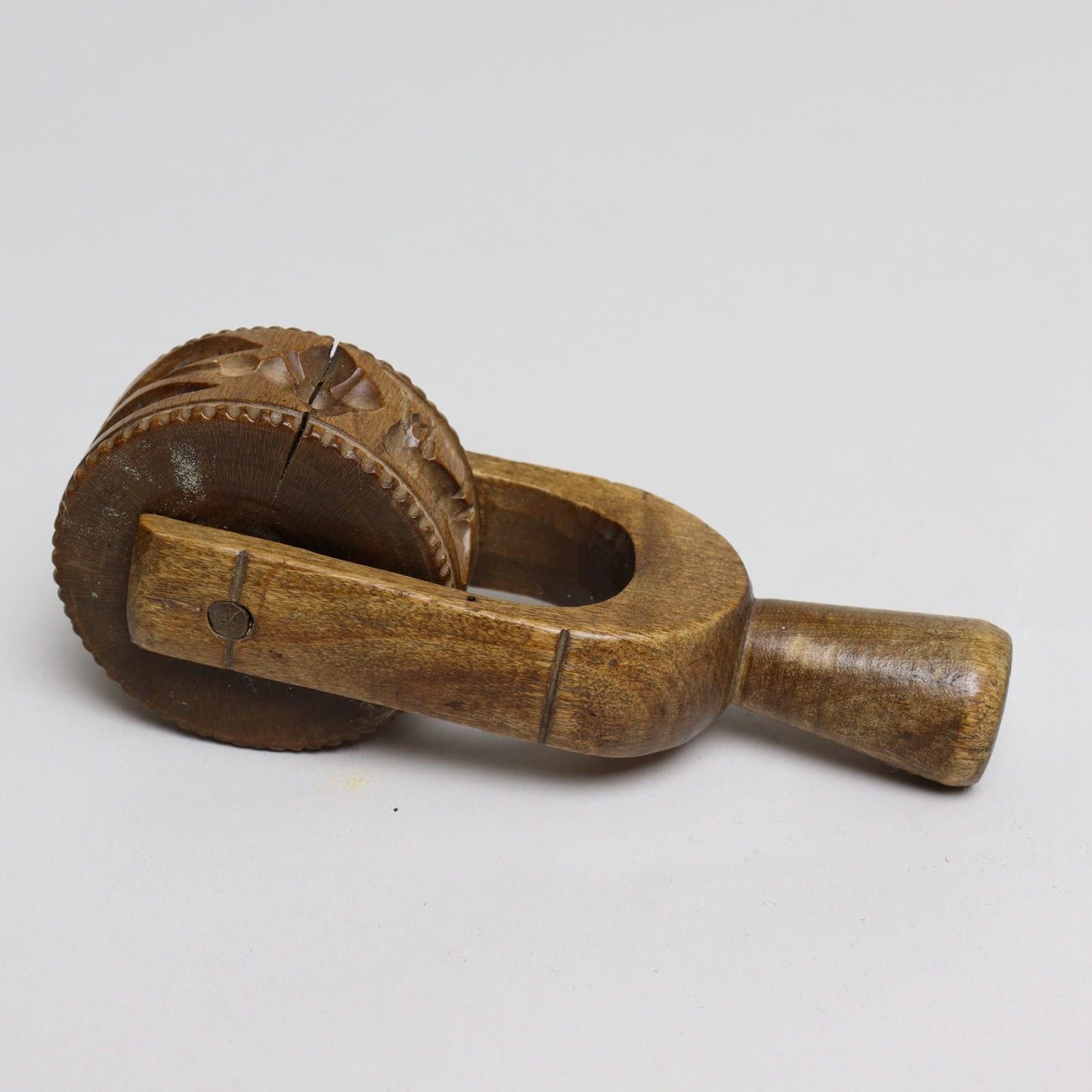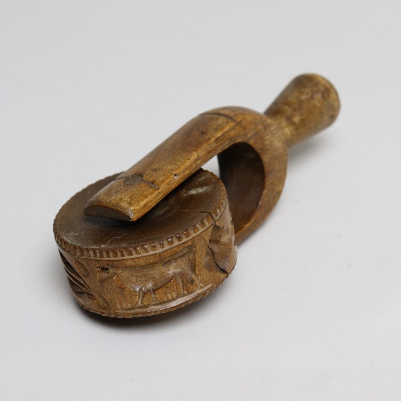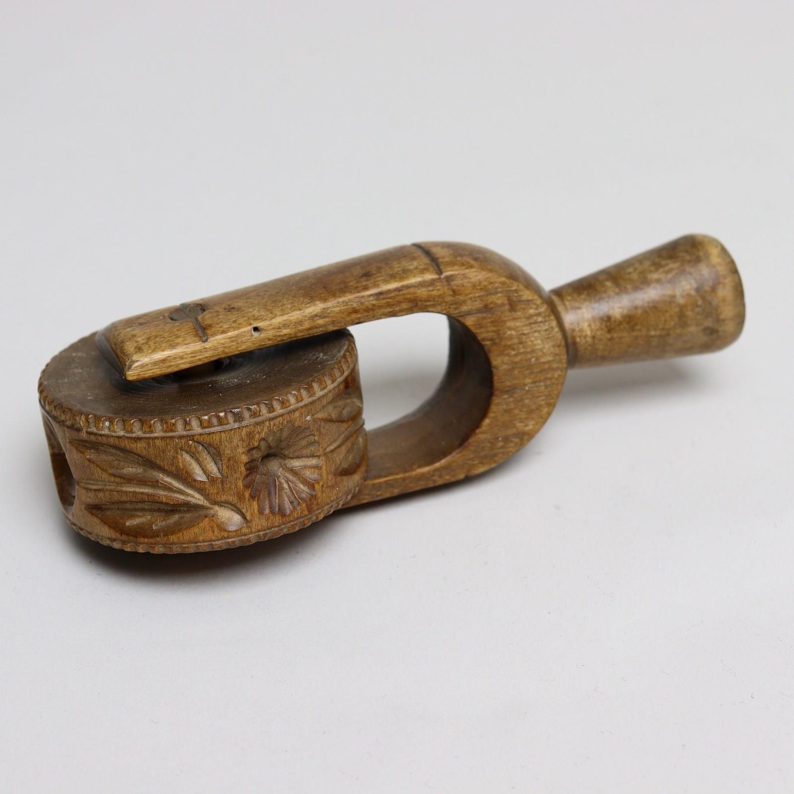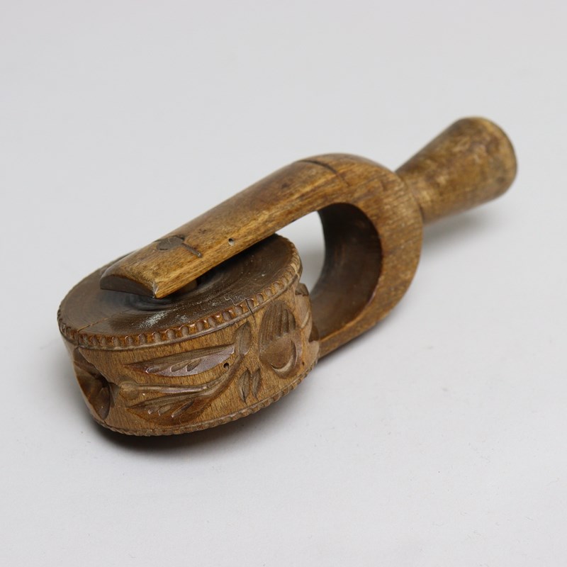 A nineteenth century, beechwood butter roller. This would have been used to imprint a design around the edge of a large block of butter. It is well carved, with three different types of flower and a cow, and it dates from c.1850. There is a split in the wheel, across one of the flowers, and there are a couple of small woodworm holes which have been treated. Otherwise it is in good condition.