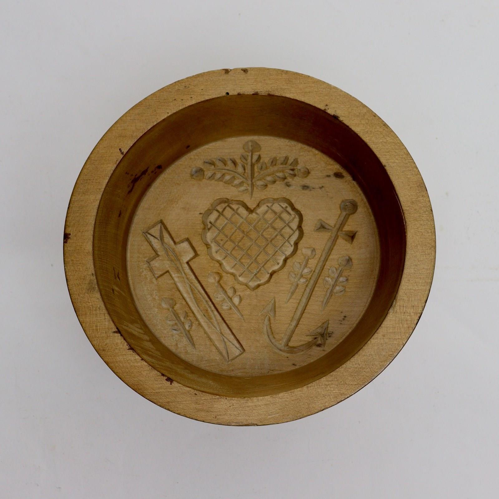 An unusual, 19th century, beechwood flummery mould. This is carved with a cross, a heart and an anchor. This is an unusual combination of items and the mould was possibly carved for use on a specific religious festival. Although the mould is probably French, flummery, which is a sweet, soft dessert made from steeping oatmeal, originated in Britain in the 17th century. The mould is in excellent condition.
