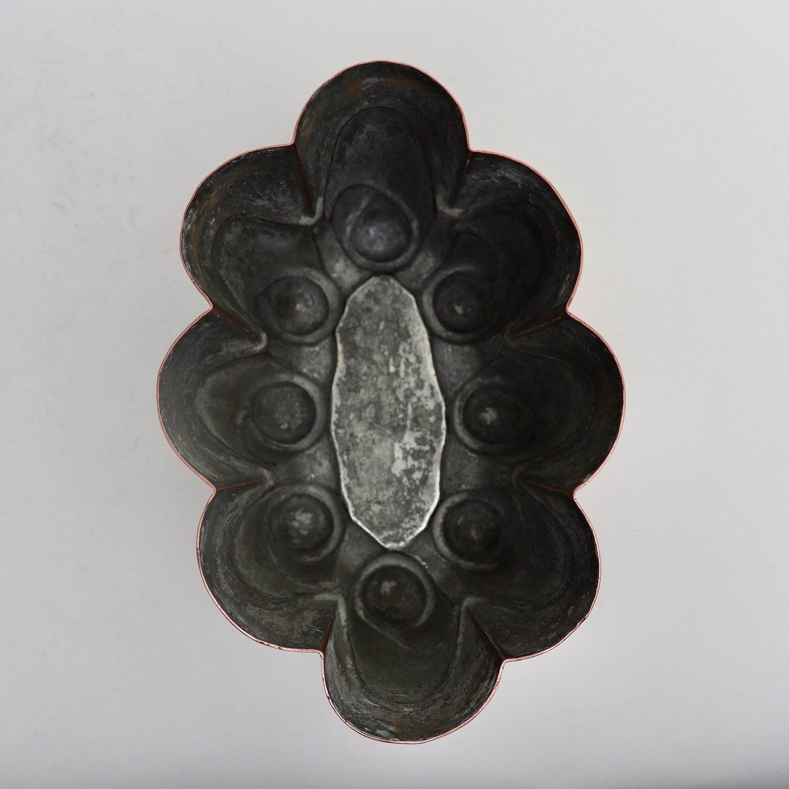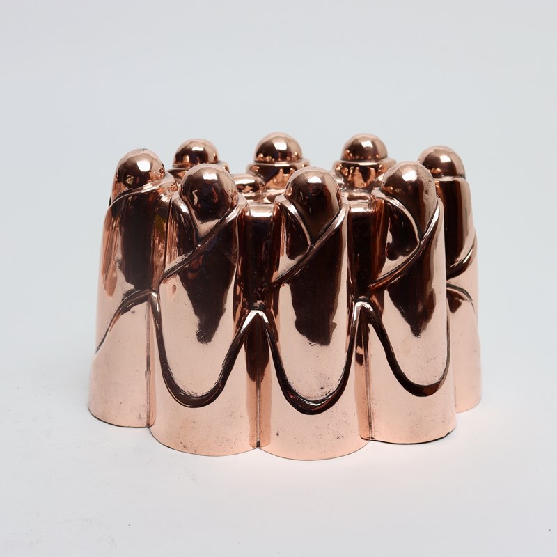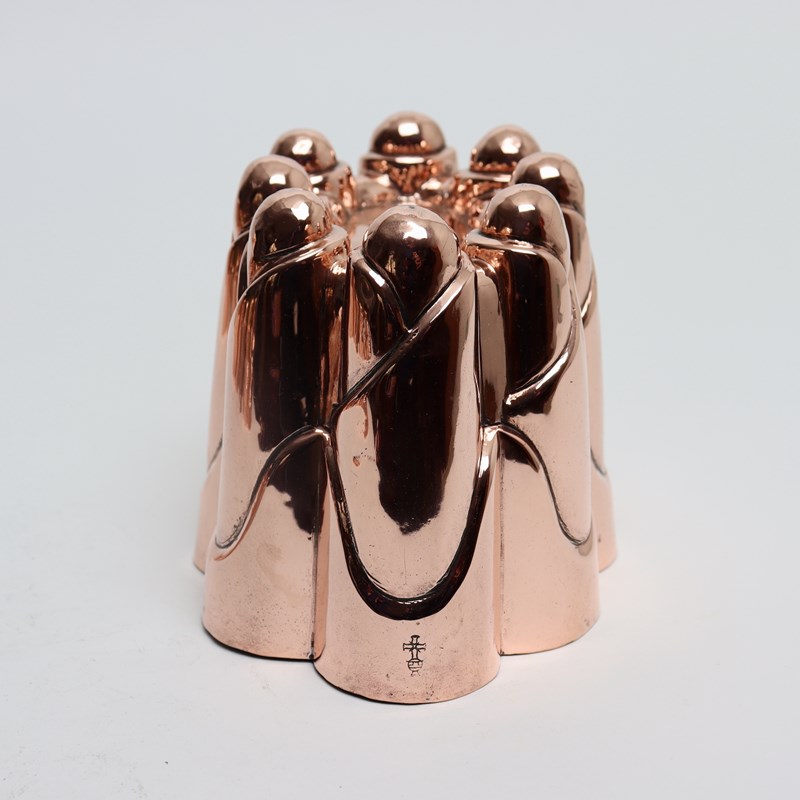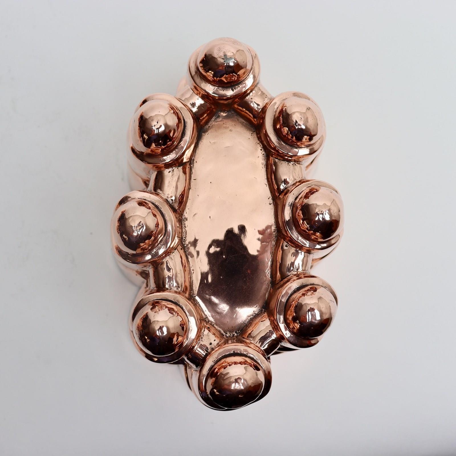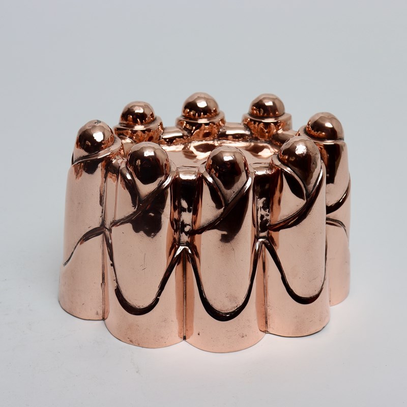 A late nineteenth century, English copper jelly mould. This is stamped with the orb and cross symbol used by Benhams and to the opposite end is the pattern number “188”. It is made from quite a substantial gauge of copper and it dates from c.1890. The design consists of eight dome topped, draped columns. There is very minor denting to both the sides and the tops of the columns and the tinning to the interior is worn.