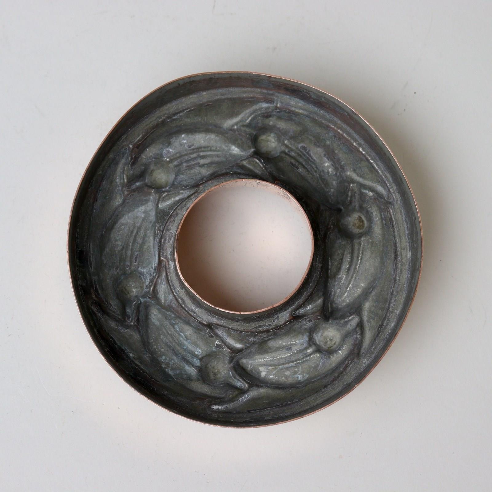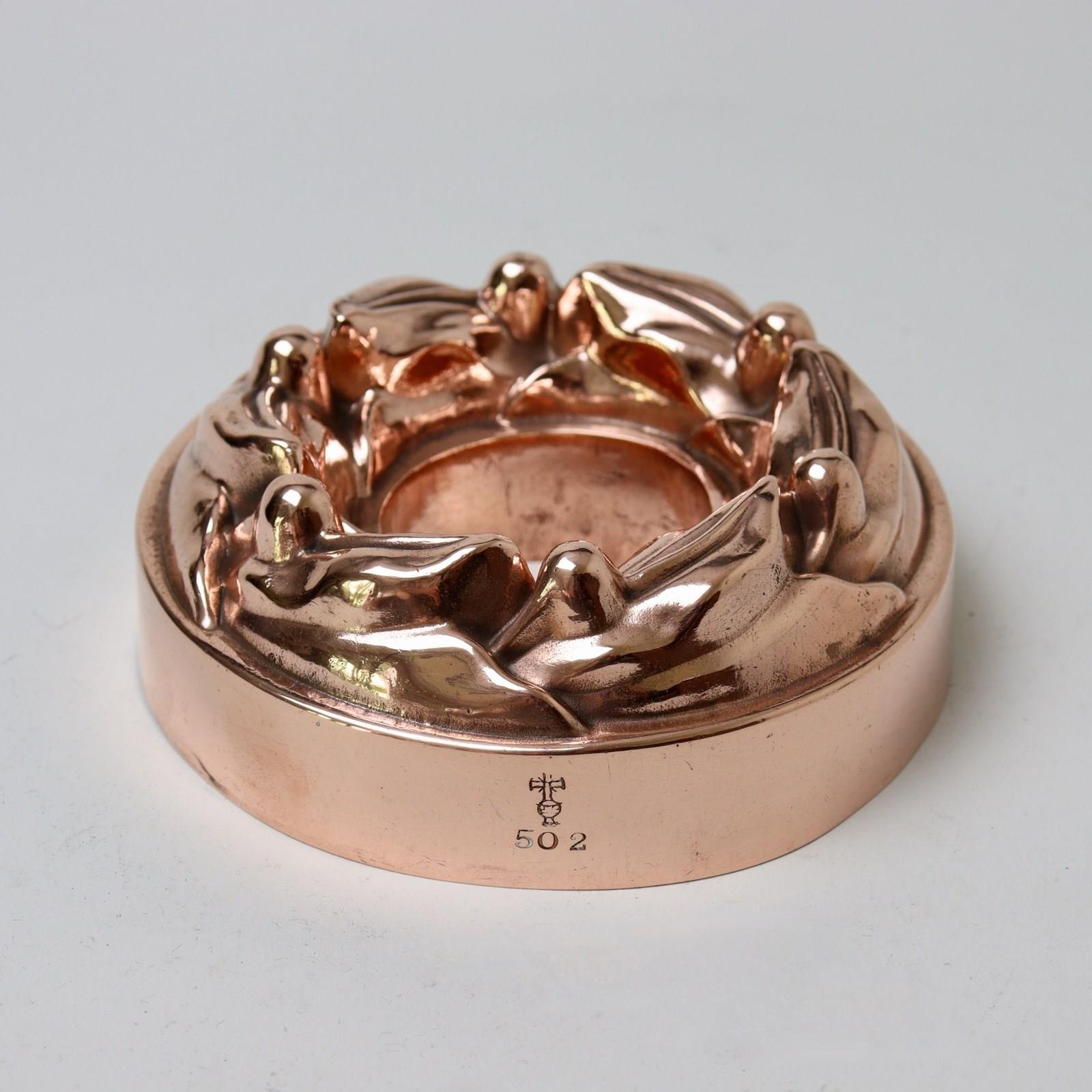 A small, 19th century, copper ring mould in the shape of laurel leaves and berries. This is marked with the orb and cross symbol used by Benhams above the pattern number “502”. To the opposite side is a workman’s mark in the shape of an O. The design is made to represent a laurel wreath. The mould is made from a substantial gauge of copper and dates from c.1880. It is in excellent condition but the tinning, to the interior, is worn.