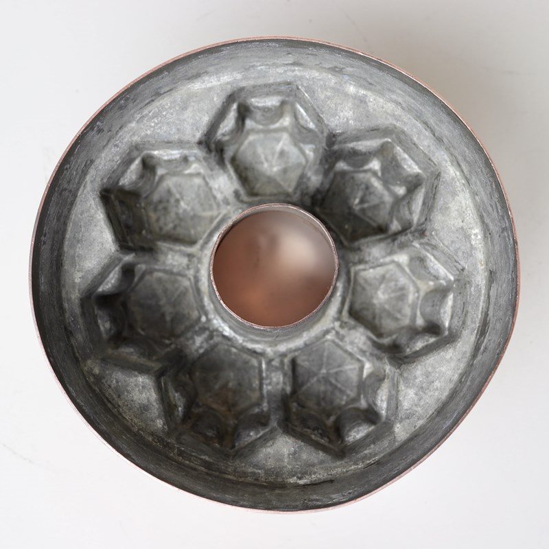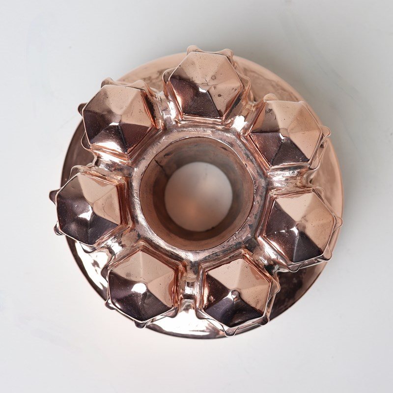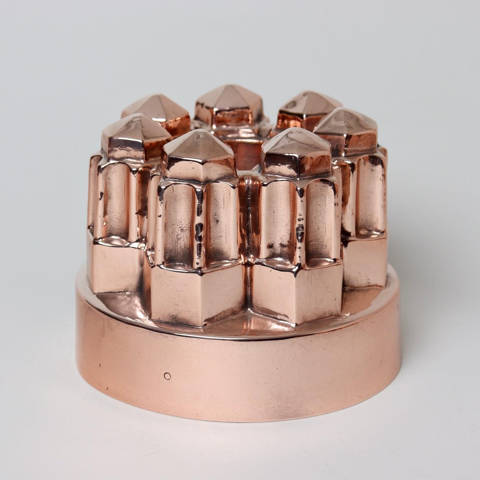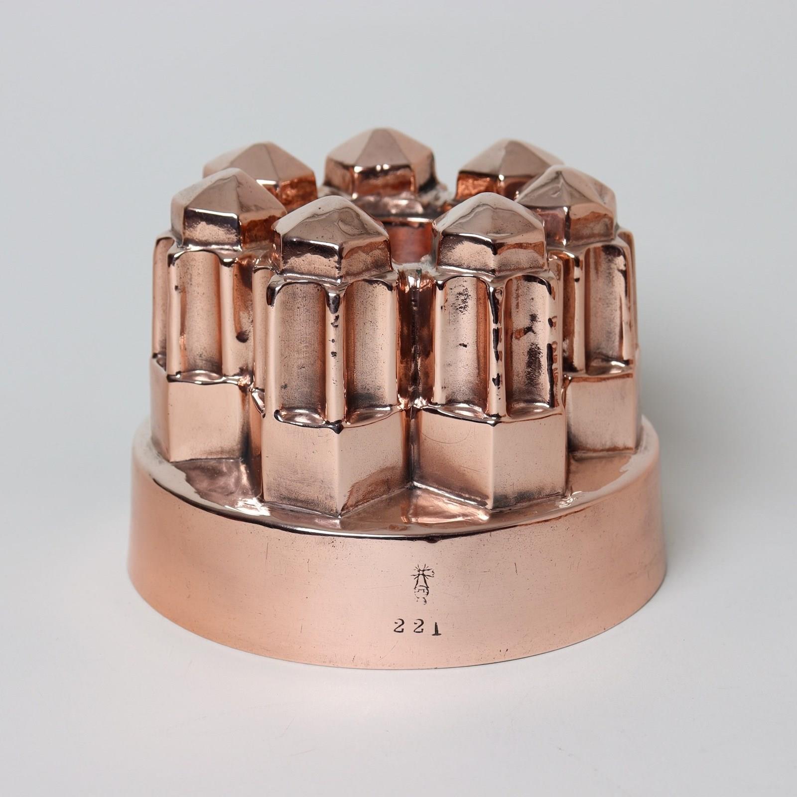 A 19th century, English copper jelly mould with central pipe. This is marked with the orb and cross symbol used by Benhams above the pattern number “221”. To the opposite side is a workman’s mark in the shape of a circle. The mould is well made, from a heavy gauge of copper, and it dates from c.1870. The design consists of seven angular columns each with a pointed, hexagonal top. There are some very small dents to the sides and tops of the columns and the tinning, to the interior, is a little flakey.
