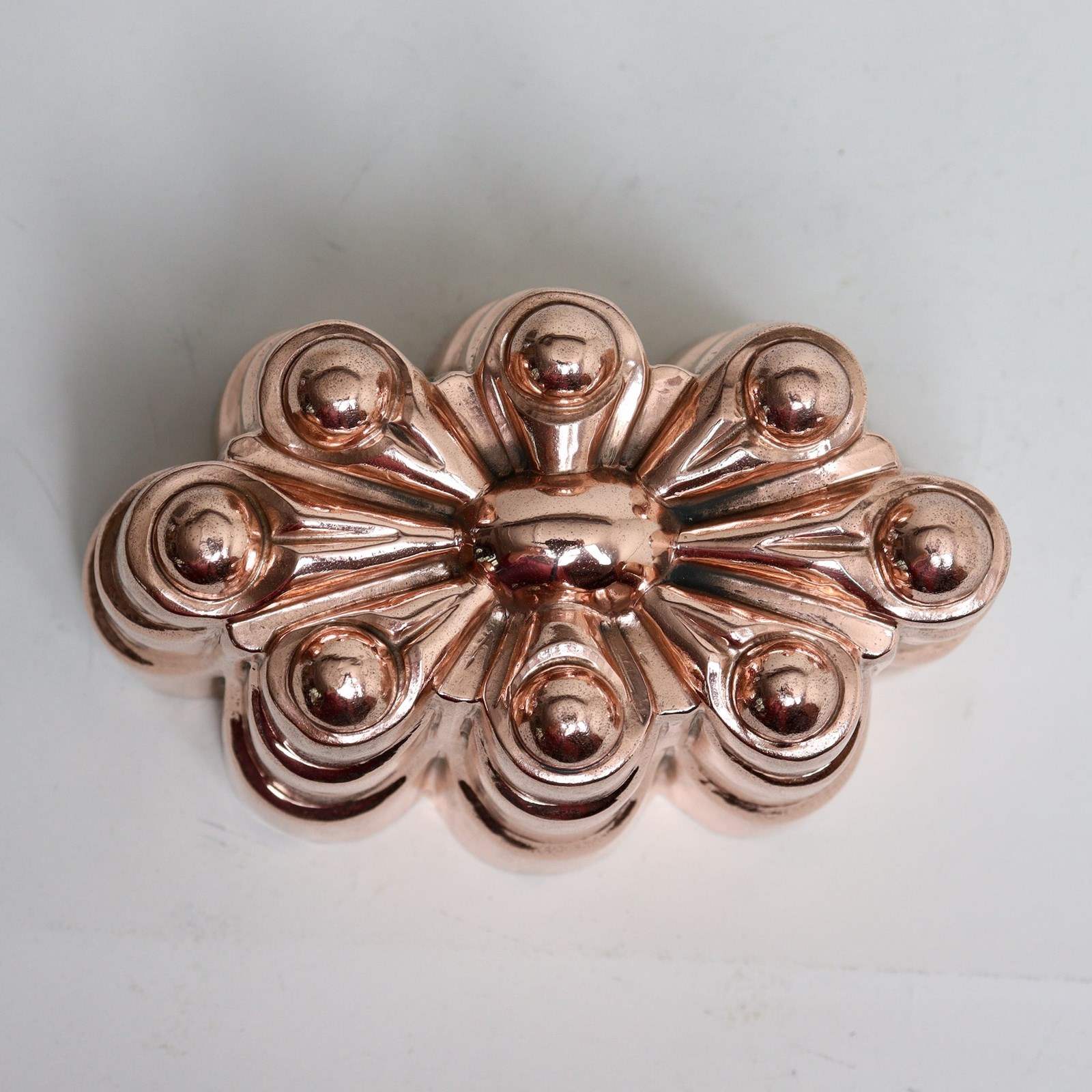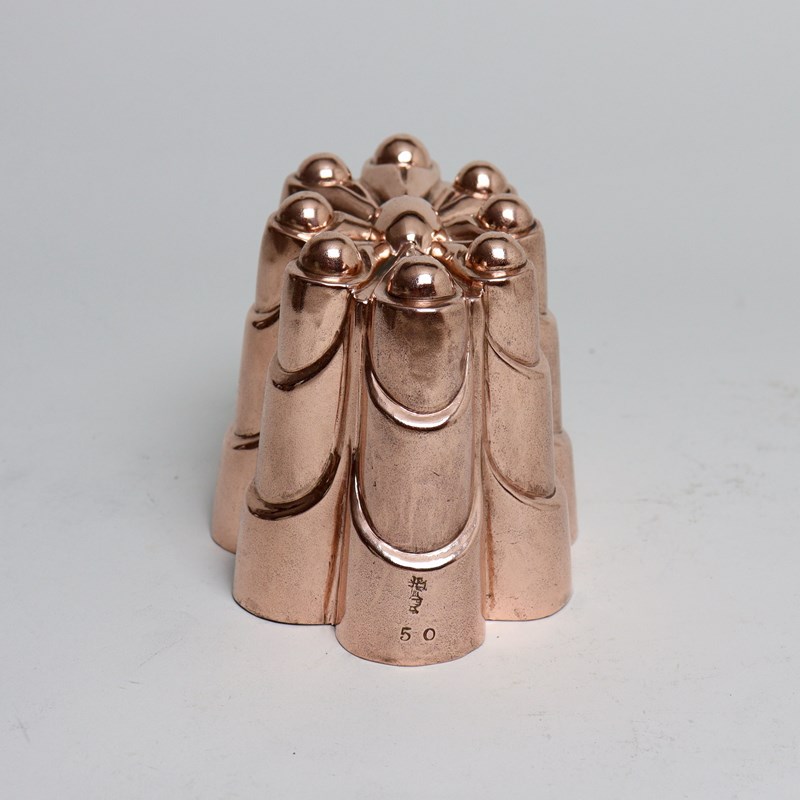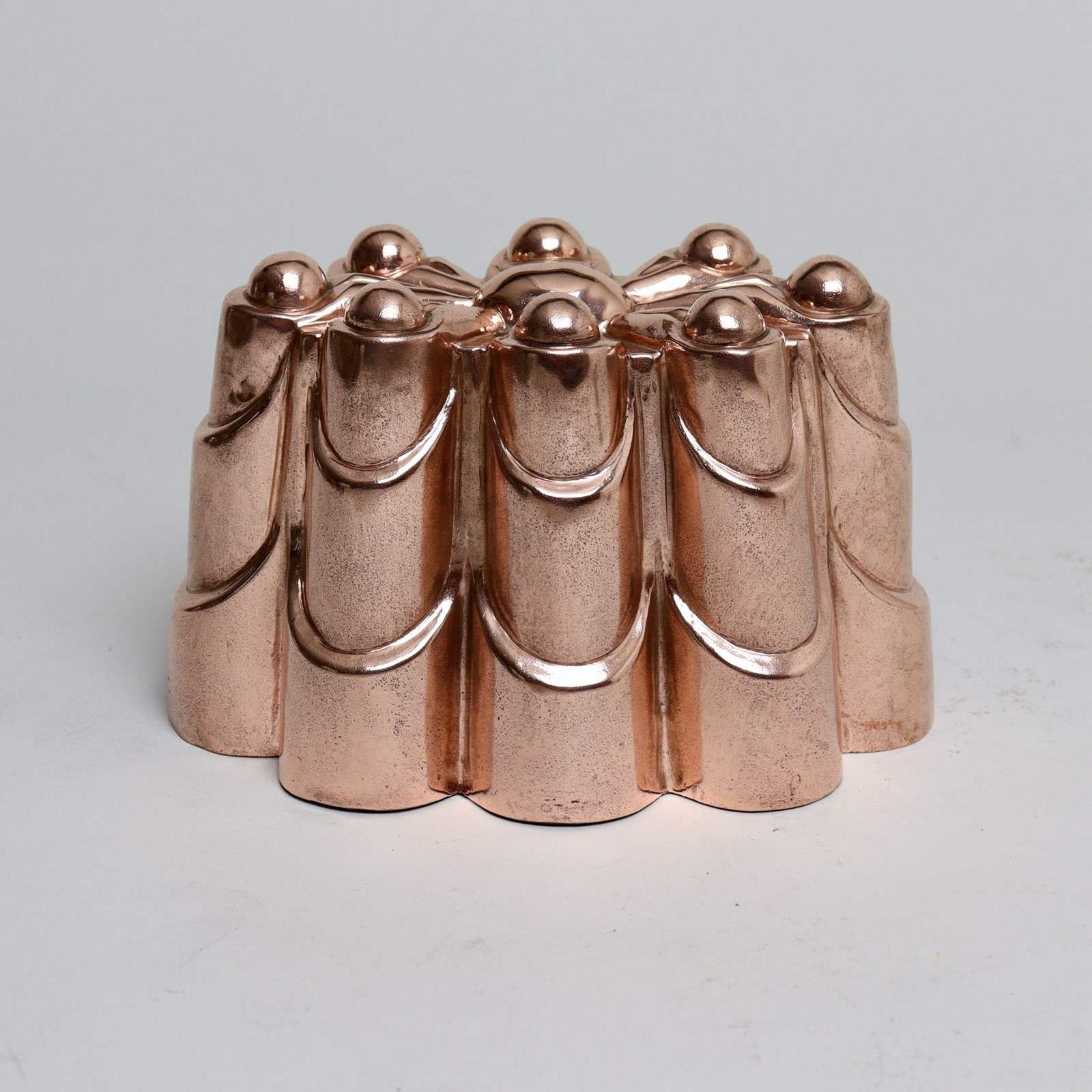 A good quality, 19th century, English copper mould. This is marked with the orb and cross symbol used by Benhams above the pattern number “50” and to the opposite end is a workman’s mark in the shape of a fleur de lys. It is made from a heavy gauge of copper and dates from c.1870. The design consist of eight columns with swags, and there are eight small domes to the top which radiate out from a central dome. There are a couple of very small dents to the sides but otherwise it is in good condition. The tinning has been stripped from the interior. This is a lovely design which would display well either on a shelf or hanging on a wall.