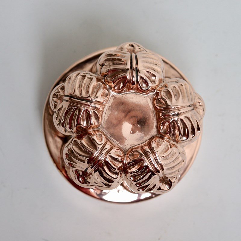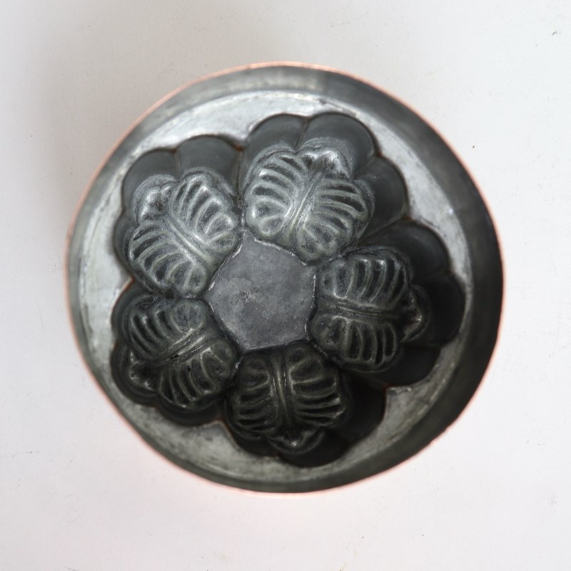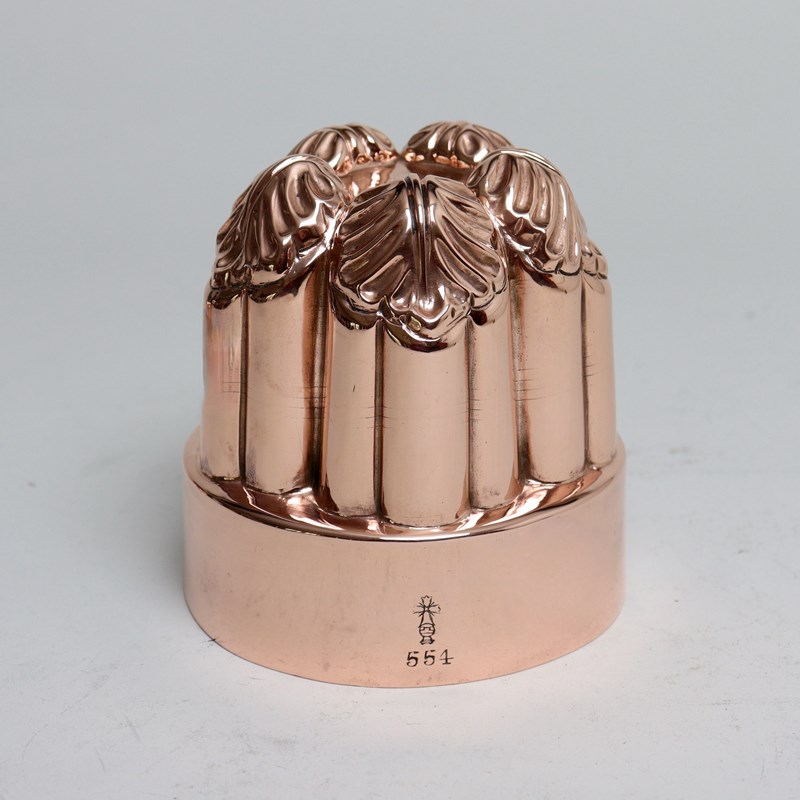 A lovely quality, 19th century, English copper mould. This is marked with the orb and cross symbol used by Benhams above the pattern number “554”. To the opposite side is a workman’s mark in the shape of a heart. It is made from a quite a heavy gauge of copper and dates from c.1880. The design has five very attractive leaf shapes at the tops of the five fluted columns. It is in excellent condition and the tinning to the interior, although slightly worn, is still in usable condition.