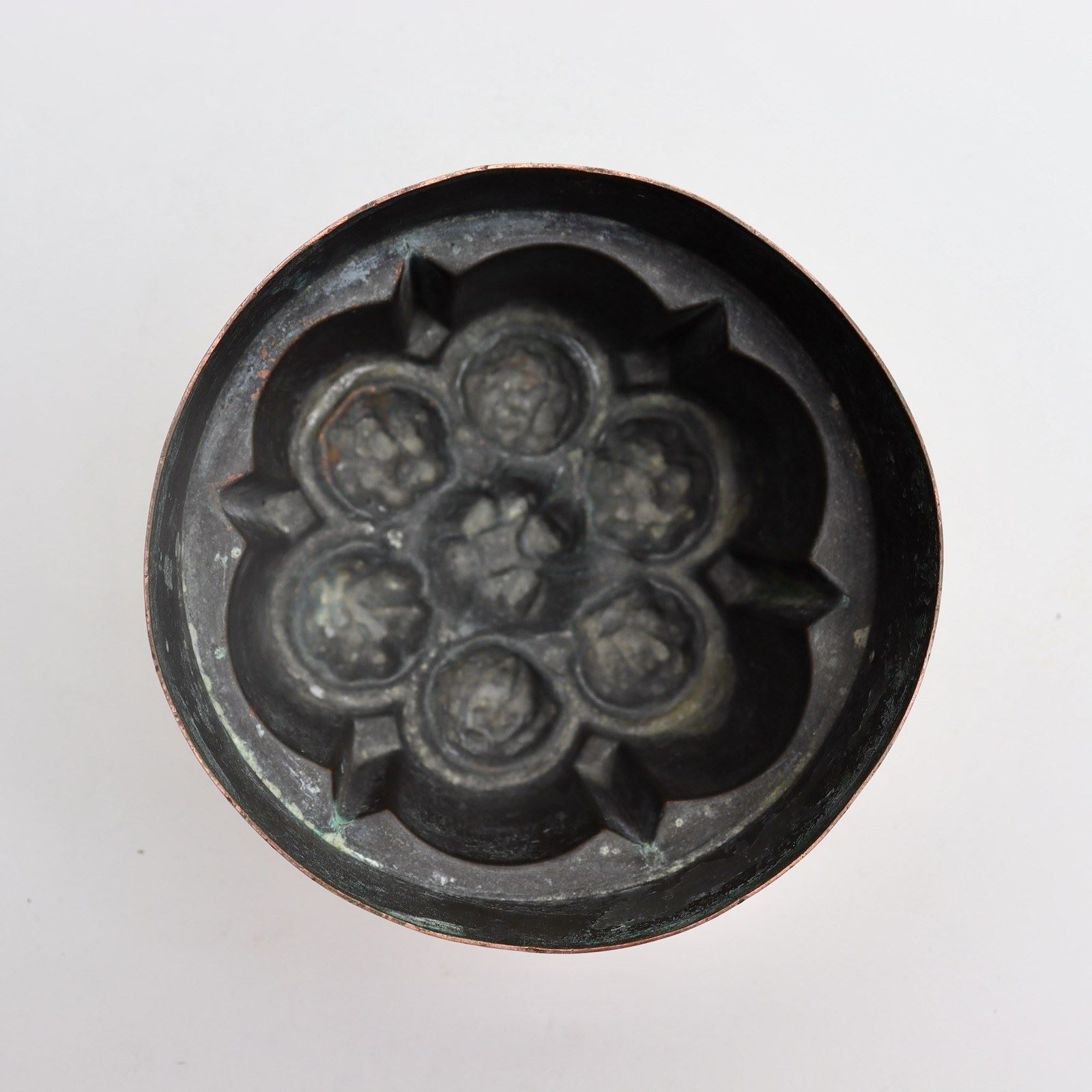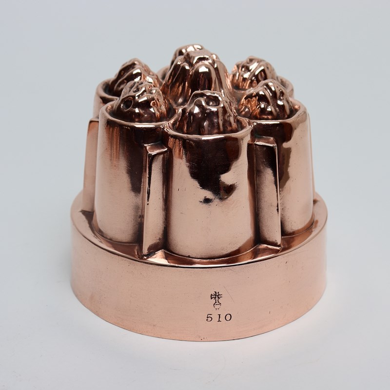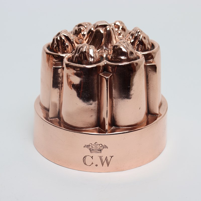 A nineteenth century, copper mould by Benhams. This is stamped with the orb and cross symbol used by Benhams above the pattern number “510”. It is also beautifully engraved with the initials “C.W” beneath a crown so this would have come from an aristocratic household. The design consists of six small nuts or fruits to the top, above fluted sides. Unfortunately there is a small split in the rim of the mould and there is very minor denting to the sides. The tinning is badly worn so the mould could not be used.