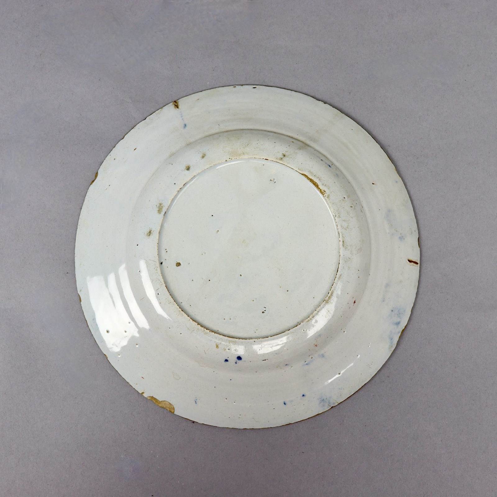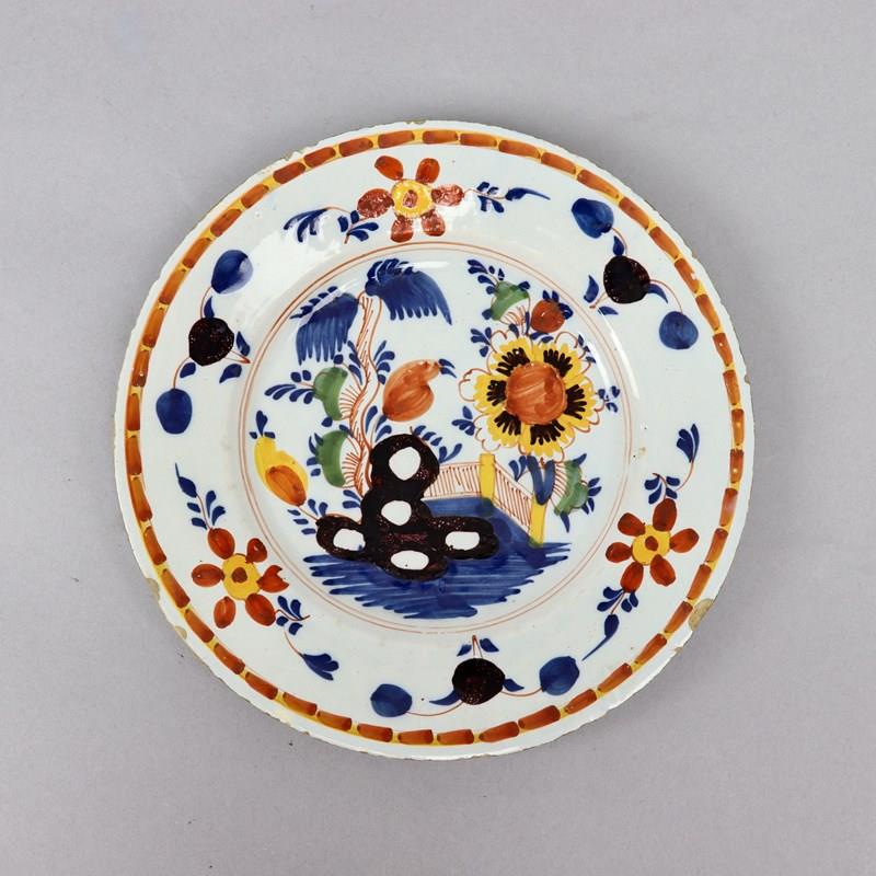 A very boldly decorated, polychrome Dutch Delft plate. This dates from c.1780. It is naively decorated with a rocks in a pond with a bridge in the background and flowers and trees to the sides. This is all in shades of blue, green, manganese, ochre and orange. The orange makes it particularly vibrant. There is minor wear to the rim, and three small glaze chips, which is quite normal with Delft due to the soft nature of the glaze. This can be seen in the images. Otherwise it is in very good condition.