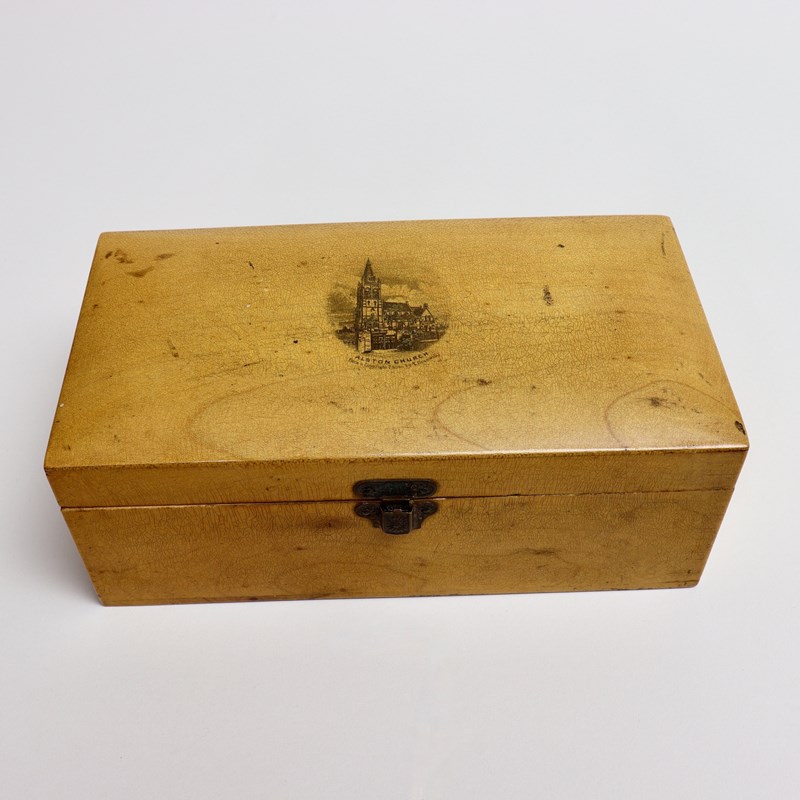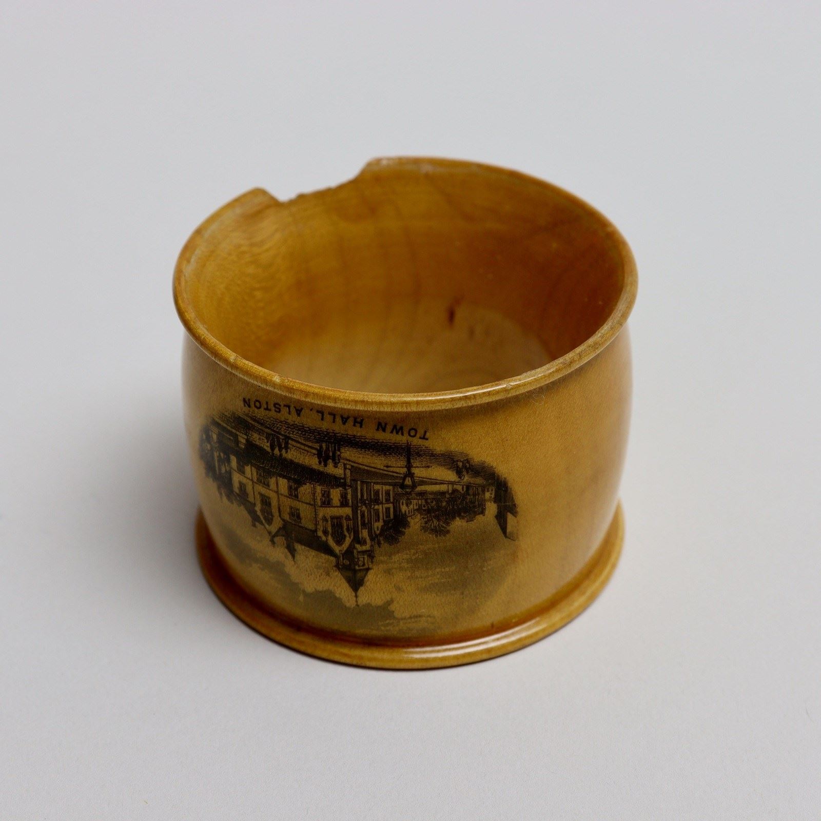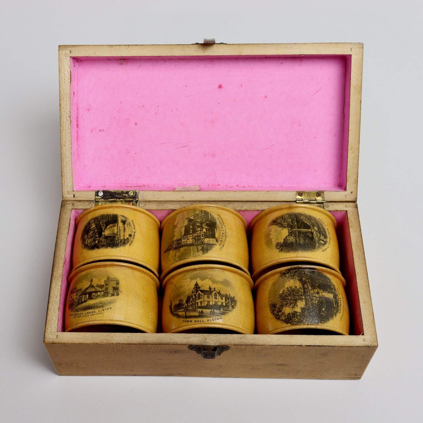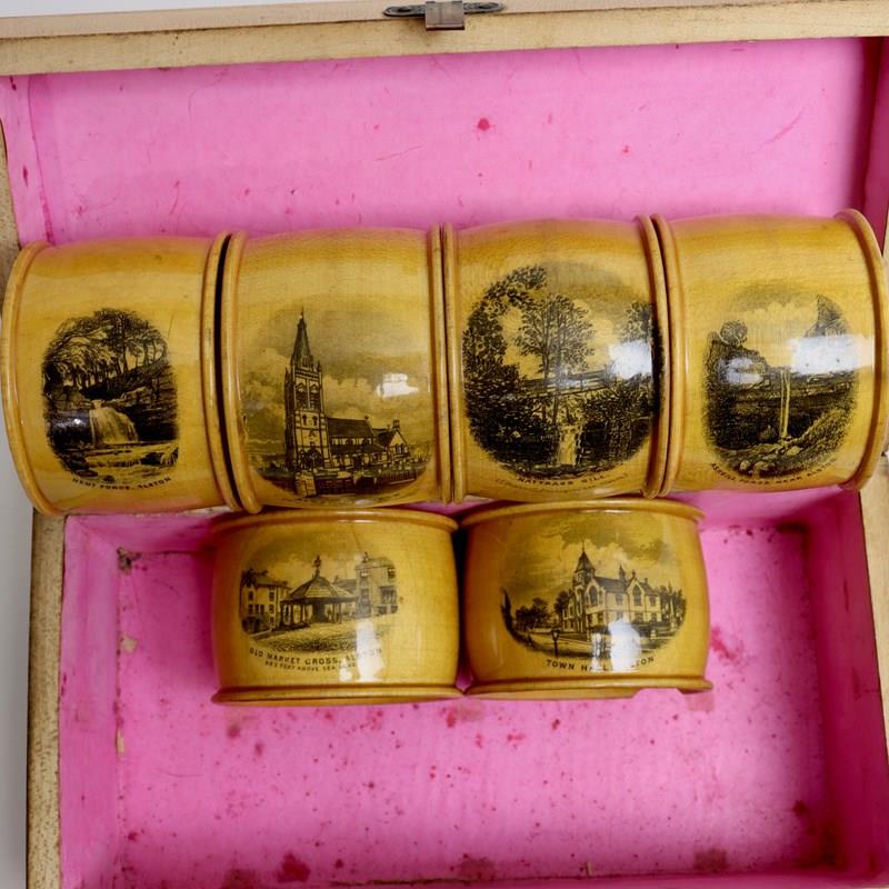 A boxed set of six Mauchline Ware serviette rings, each one, and the exterior of the box, transfer printed with different scenes of Alston in Cumbria. The town of Alston, at 1000 feet above sea level, is the highest market town in England. This set dates from c.1880 and it is quite unusual to find an original set still together. One of the serviette rings has a large chip to the rim, which can be seen in one of the images. Other than this they are all in good condition and, because they have been keep in their box, the prints are all still very bright. The exterior of the box is slightly worn.