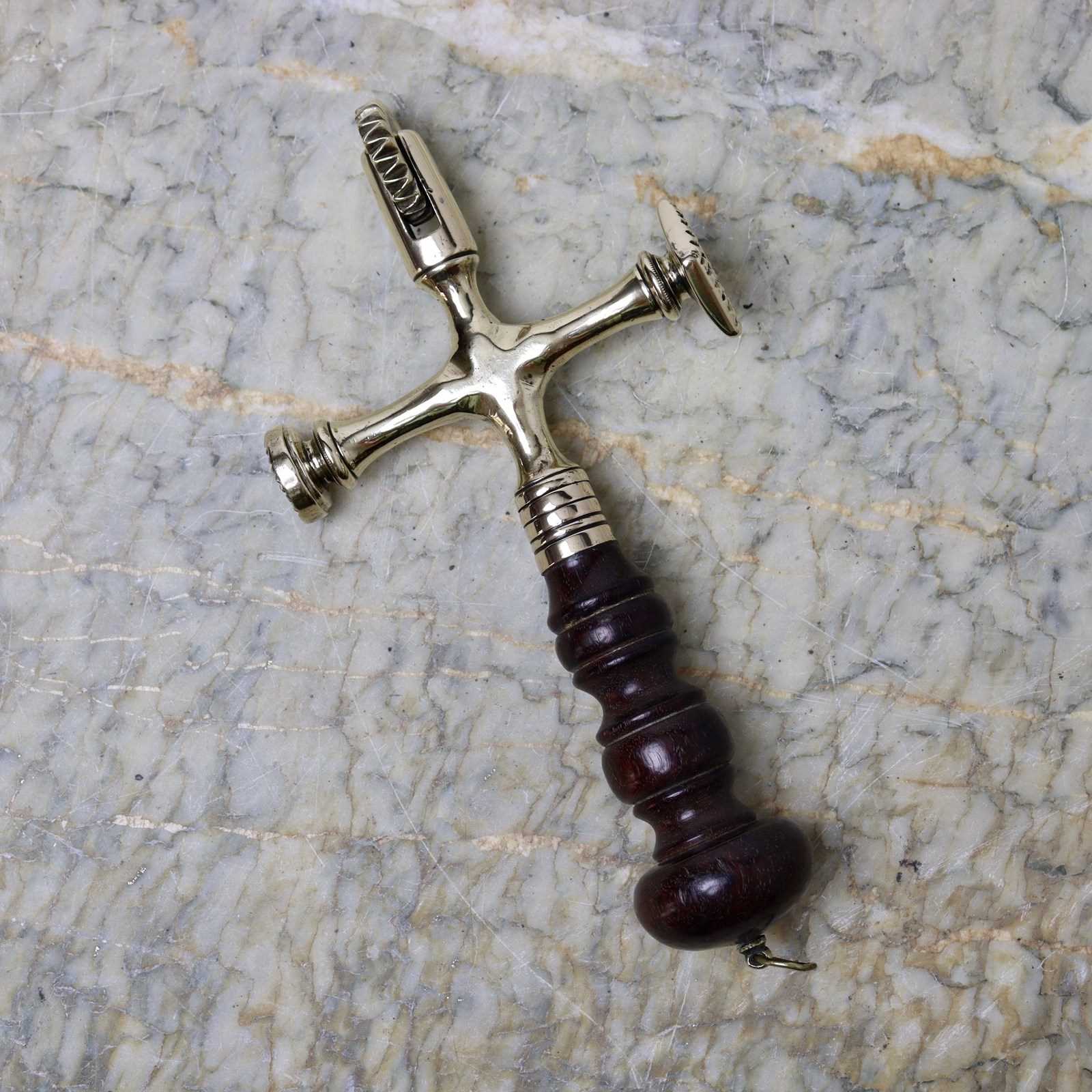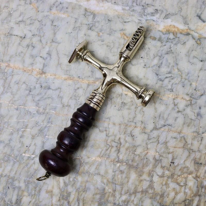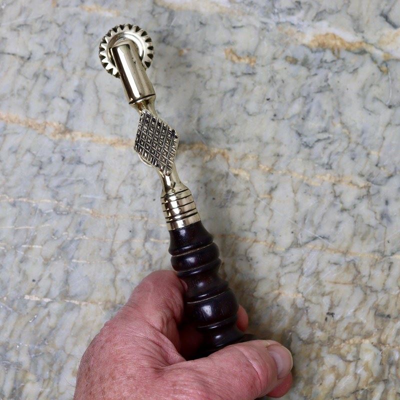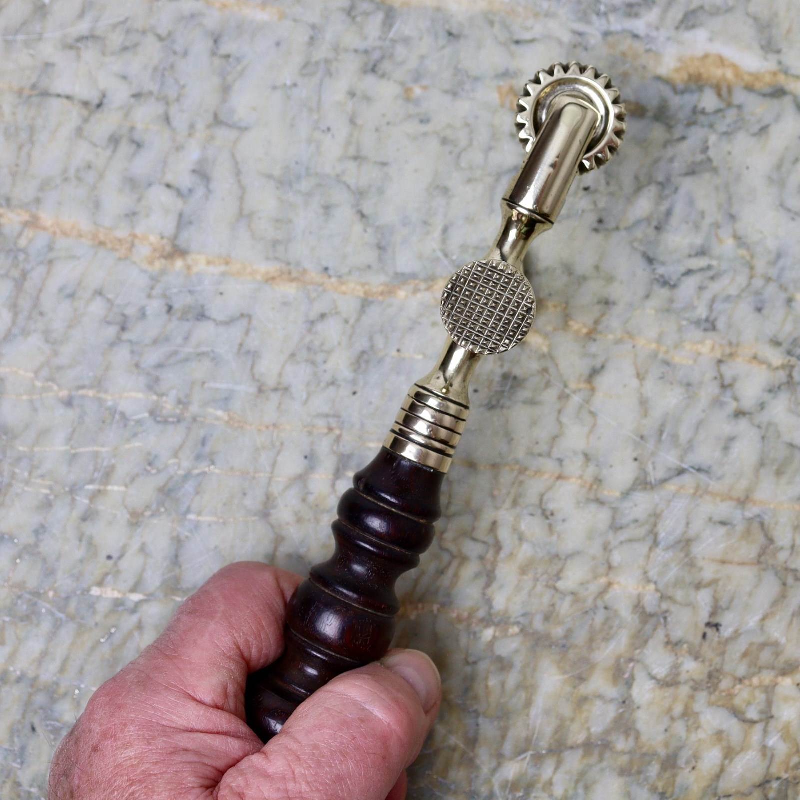 A nineteenth century, brass, cruciform pastry tool with a turned wood handle. This is English and it dates from c.1860. It has a sturdy wheel on the end, for trimming the rim of a pie, and diamond and circular stamps on the sides, for impressing deigns into the pastry. It is well made and it is in excellent condition.