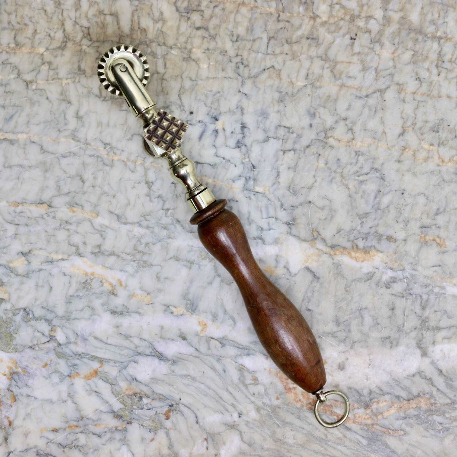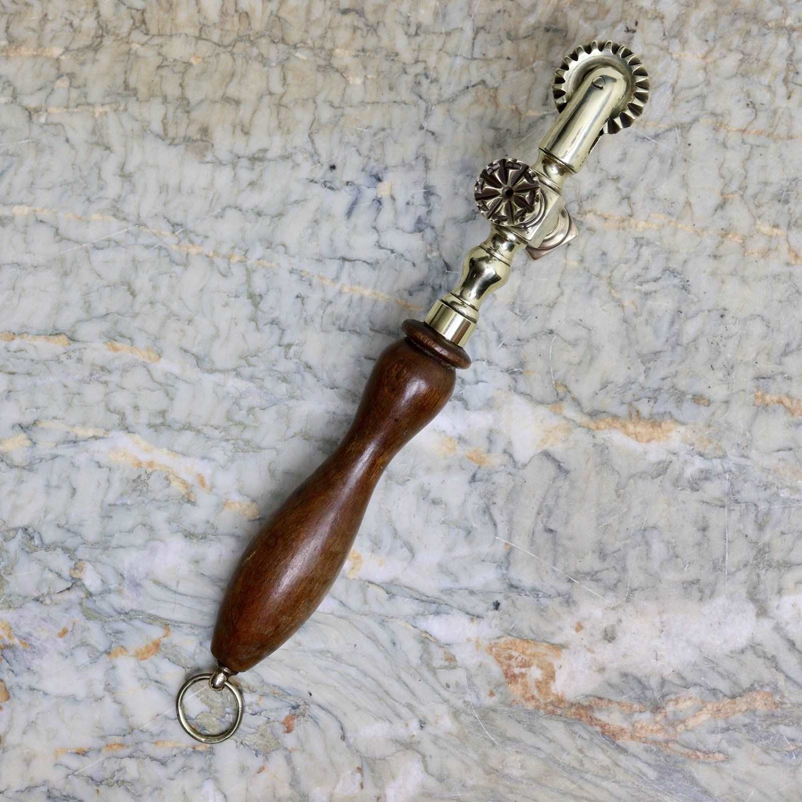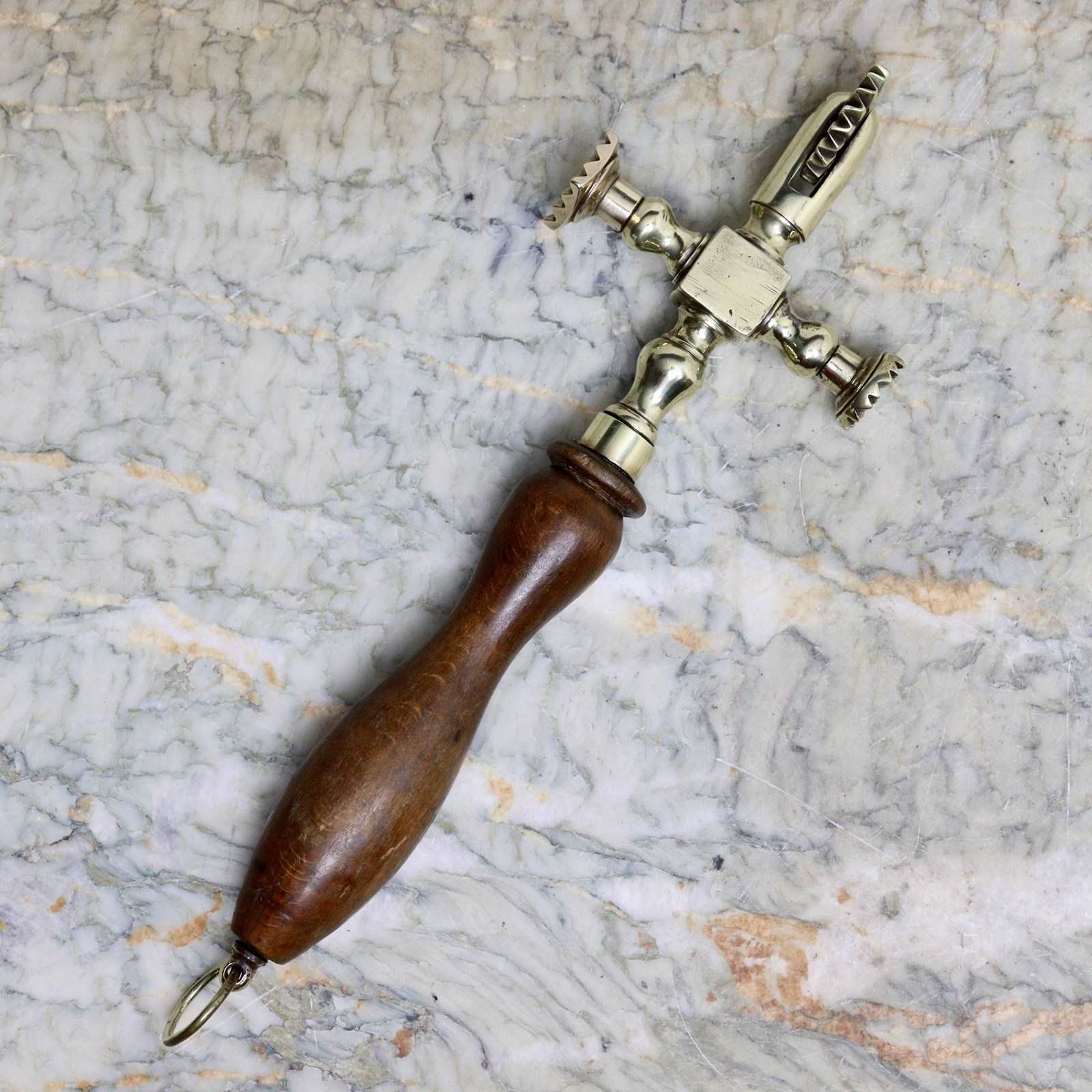 A nineteenth century, brass, cruciform pastry tool. This is English and it dates from c.1870. It has a heavy brass wheel to the top, which would have been used for trimming the rim of a pie, and there are shaped markers on the sides, for putting a design into the pastry. It is cast in brass and has a turned oak handle. It is in excellent condition.