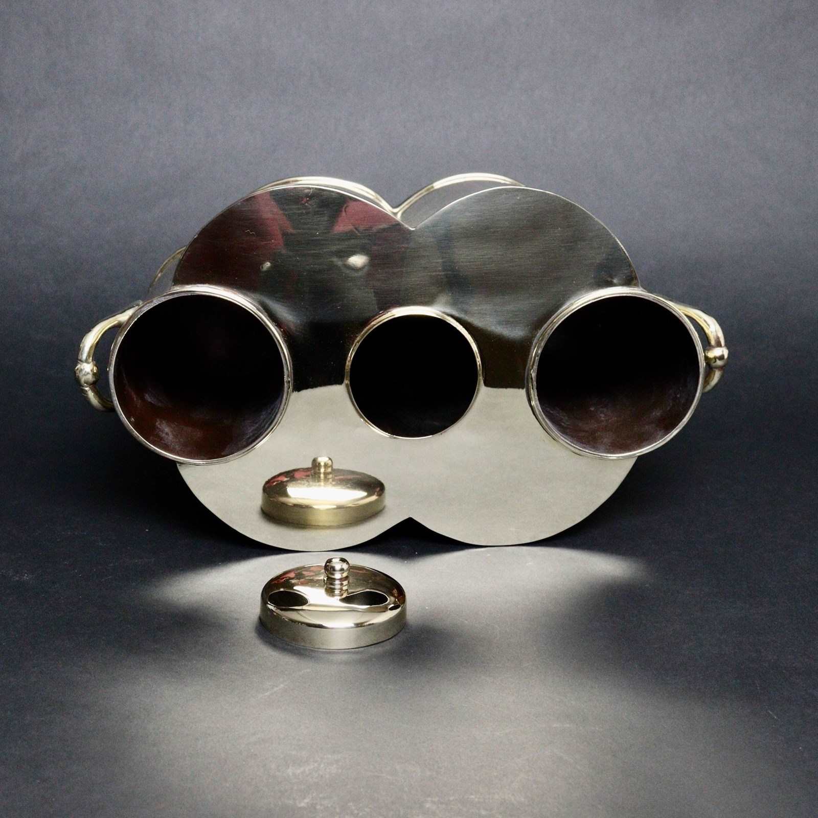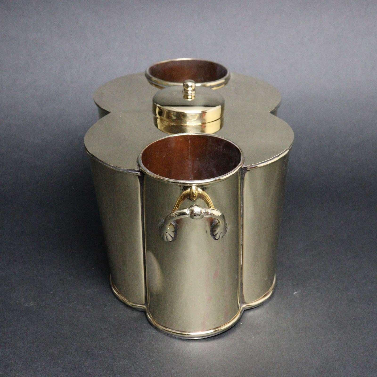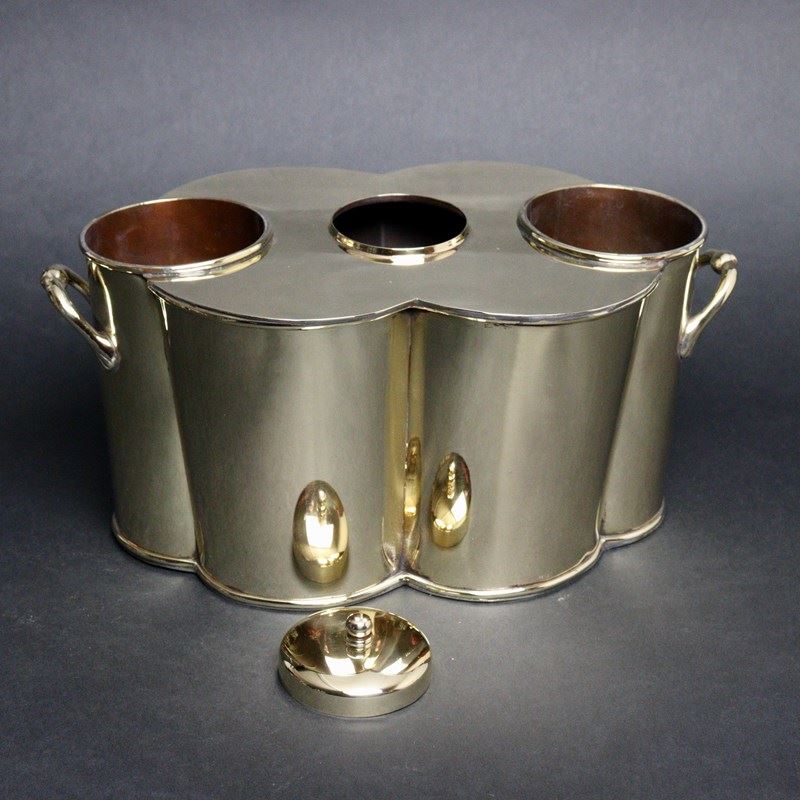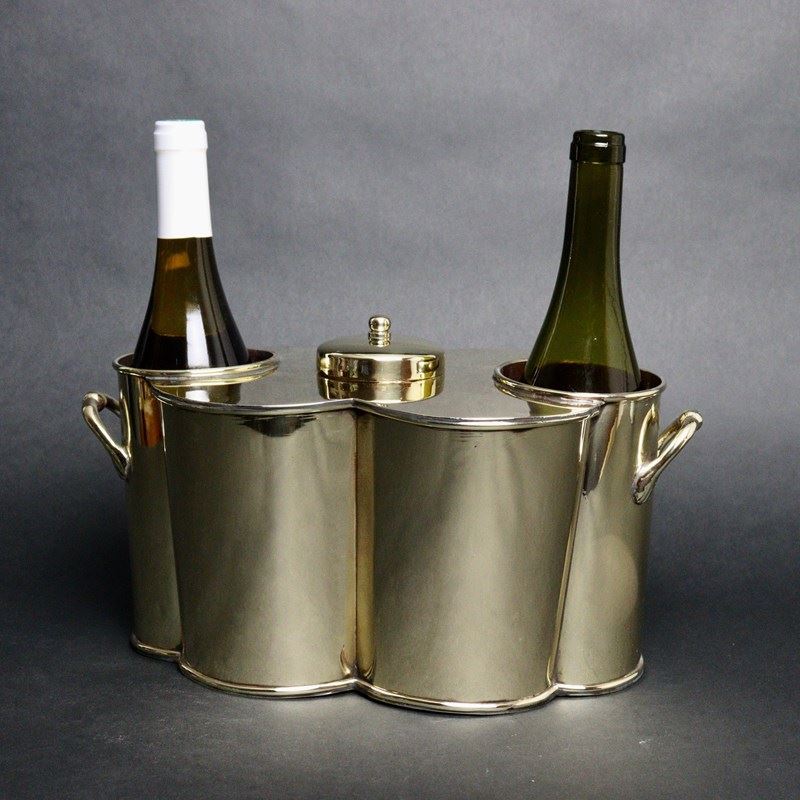 A lovely quality, brass, two bottle wine cooler with a central, covered section for ice. This is French and it dates from c.1920. As well as being a beautiful item it is very practical as the centre is filled with ice and the bottles are kept in separate compartments so they don’t get wet, they just stay chilled. It is in excellent condition.