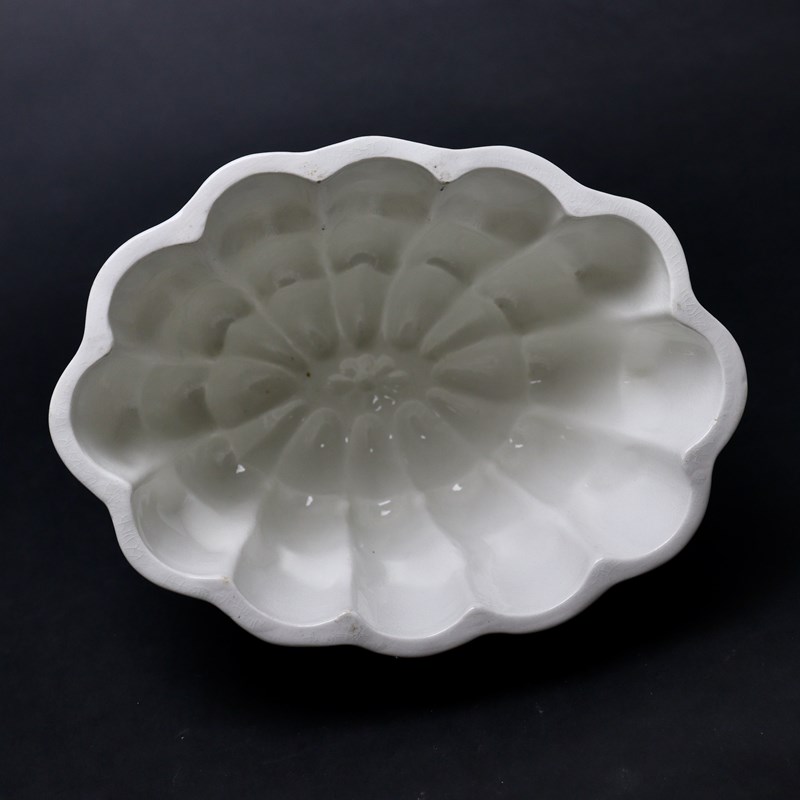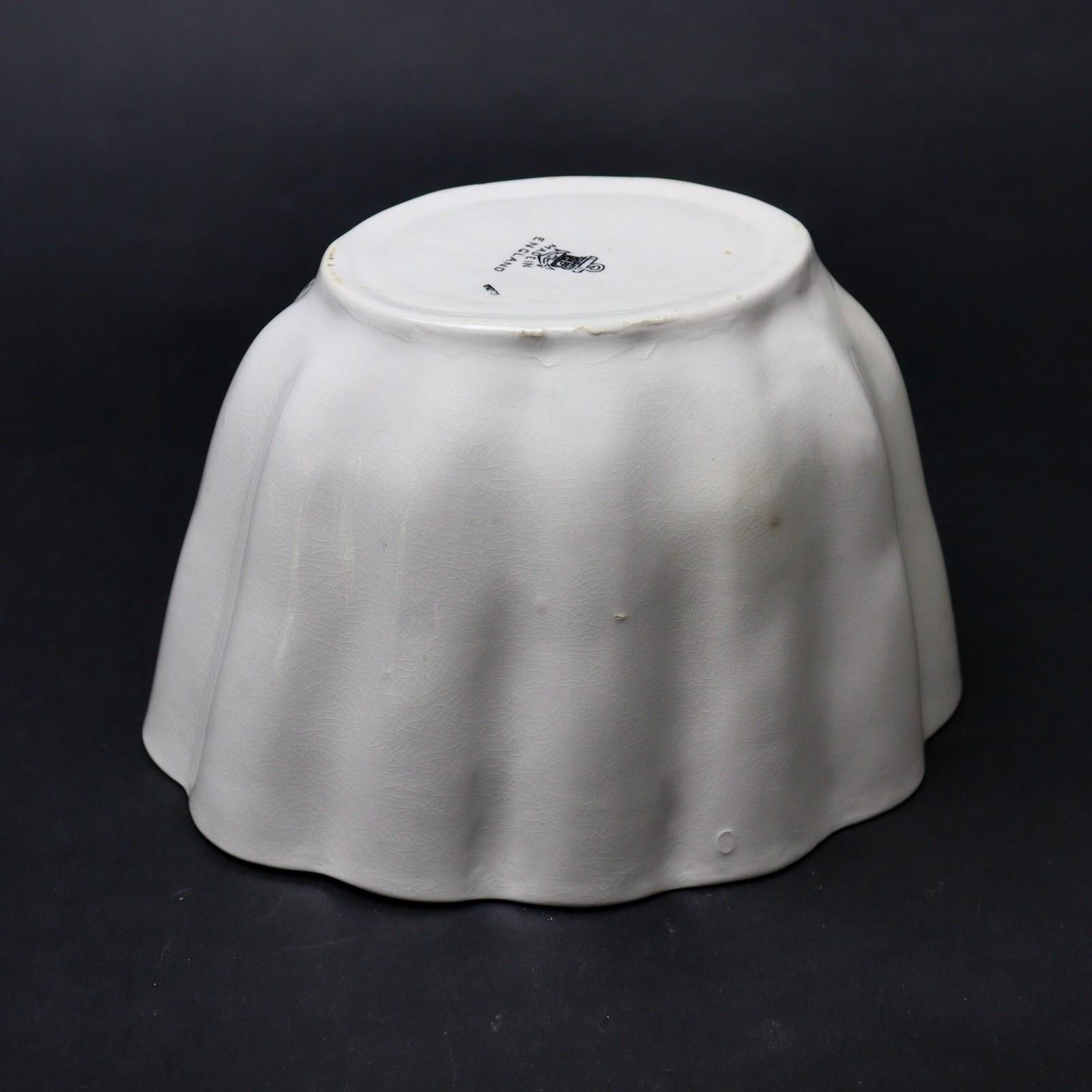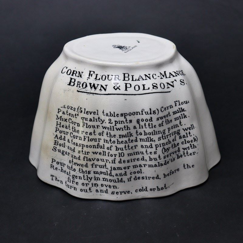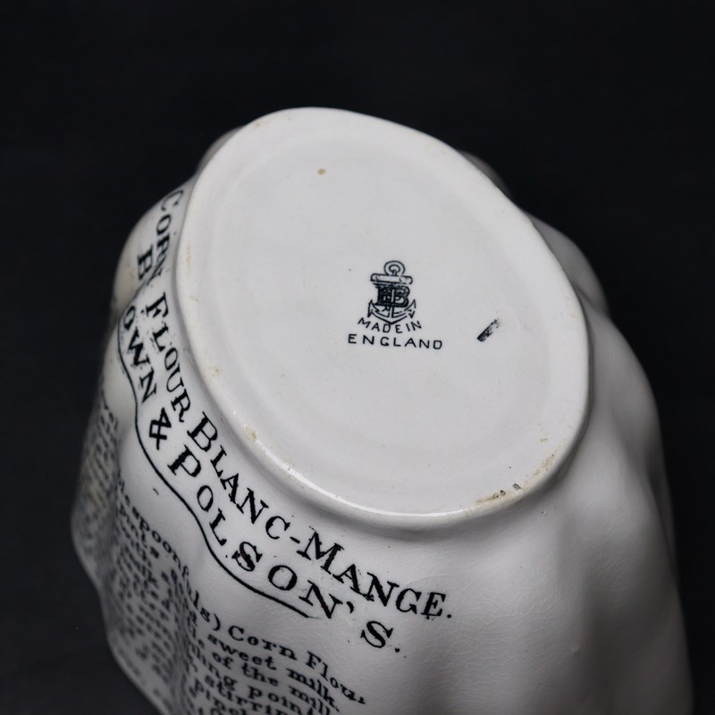 An early 20th century, Brown and Polson’s blanc-mange mould. This is marked, in black transfer print, with an anagram of “BP” around an anchor, above “MADE IN ENGLAND” and it dates from c.1920. The exterior of the mould is decorated with a black transfer print of a recipe to make blanc-mange and the interior is quite a simple, fluted shape, with a small flower to the top, which would turn out very easily. There is a very tiny chip to the rim and a fine, glaze crack runs from that, but it is still in usable condition. There is also very slight staining to the glaze.