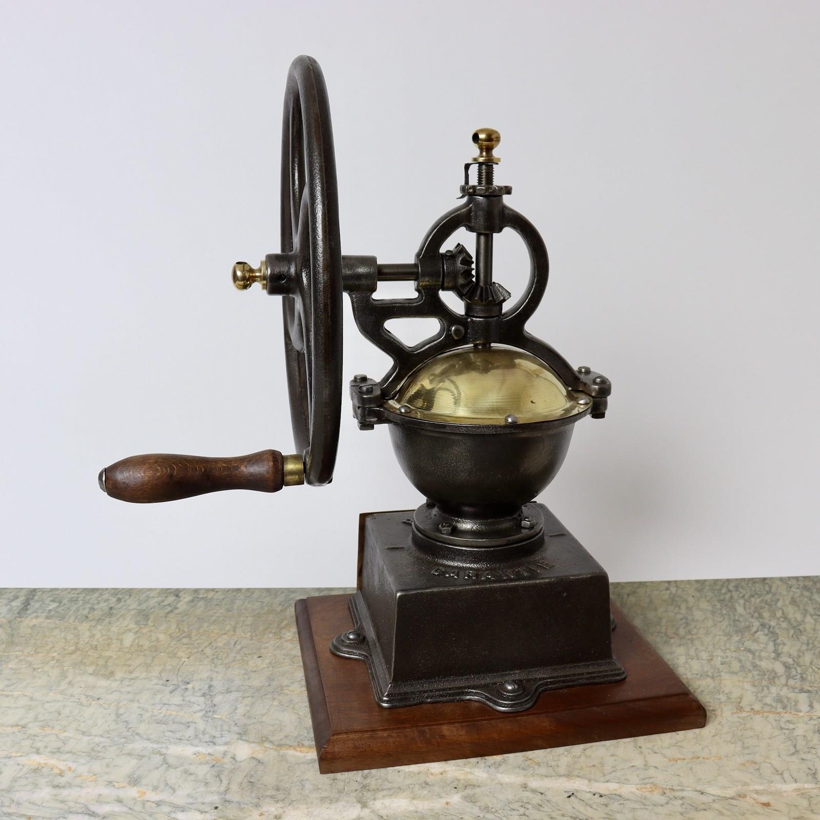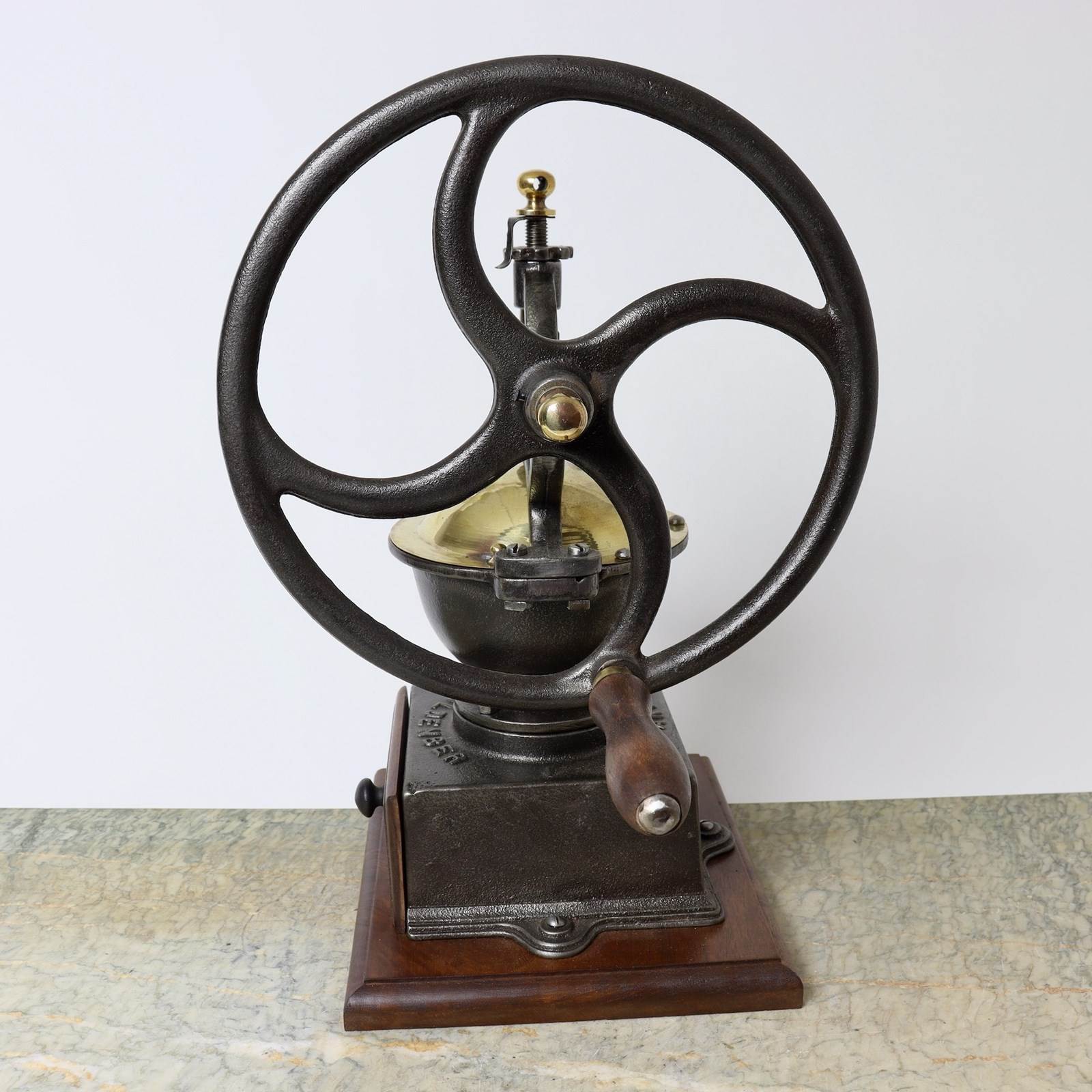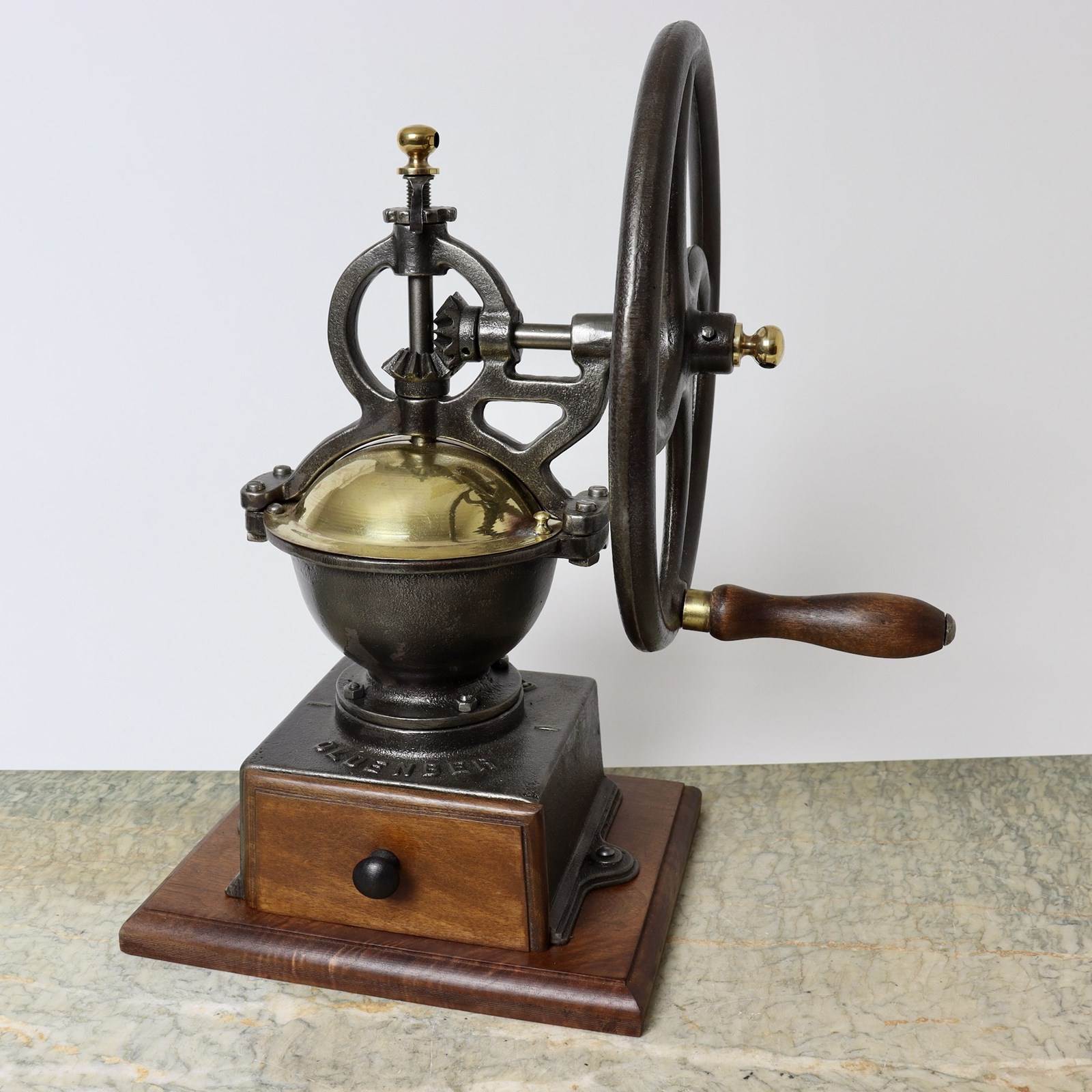 A 19th century, cast iron coffee mill with brass fittings. This is cast with “OLDENBER GARANTIE” and it dates from c.1880. It could be either French or German as “garantie” means guarantee in both languages. However the design of the mill is very similar to the French, Peugeot models but the name “Oldenber” sounds more German and I can find no trace of the company. The mill is in excellent condition and in full, working order.