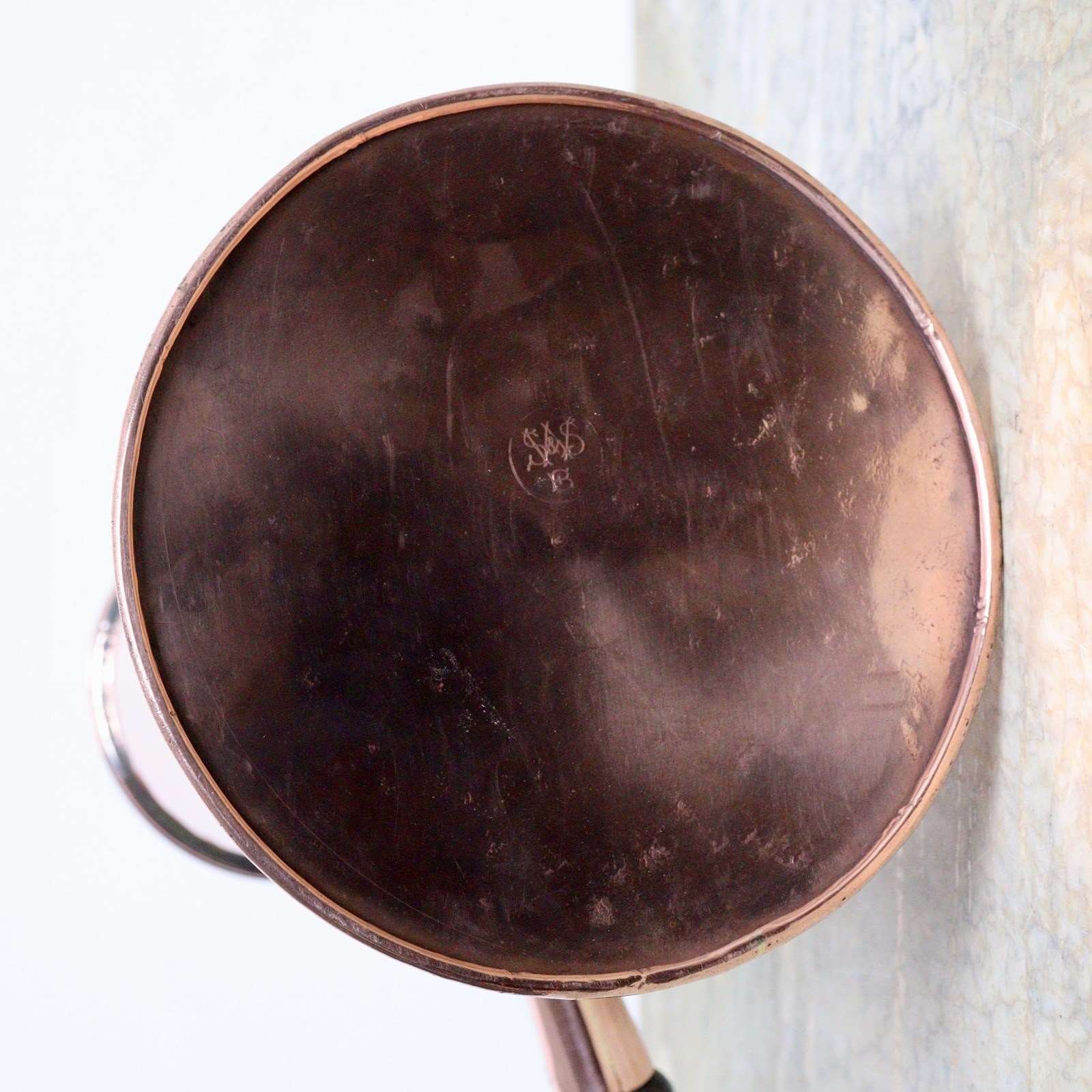 A nice quality, English copper chocolate or coffee pot. This is well made, from quite a heavy gauge of copper, and it has castellated seams up the side. It is marked, to the base, with a monogram “SWS” over “B”. This is the mark of William Soutter & Sons and it dates from c.1880. It has a hinged lid, with an acorn shaped brass finial, and the turned ebonised wooden handle is attached by a heart shaped copper fitting. It is in very good condition but the tinning, to the interior, is worn.