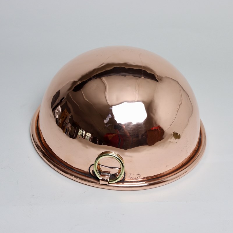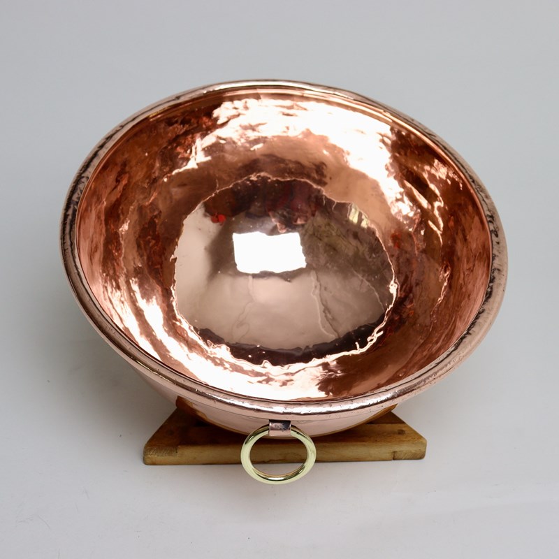 A good quality, 19th century, French copper egg whisking bowl. This is stamped “MORA & CIE. PARIS 1er”. Beneath this is the remains of an address in Paris but this has been worn away by polishing over the years. Mora & Cie were established in the early 19th century, in Paris, and were renown for the production of superb quality copper kitchenware. This piece is made from an exceptionally heavy gauge of copper and it dates from c.1860. It has a wired rim and a large, brass, folding loop handle. There are a couple of very tiny dents to the bowl but generally it is in very good condition.