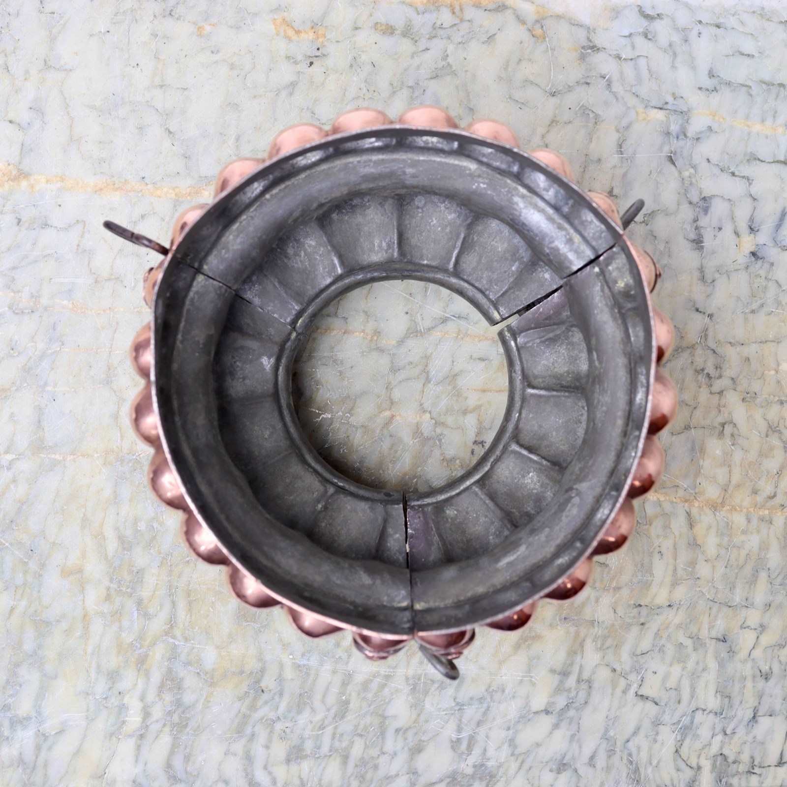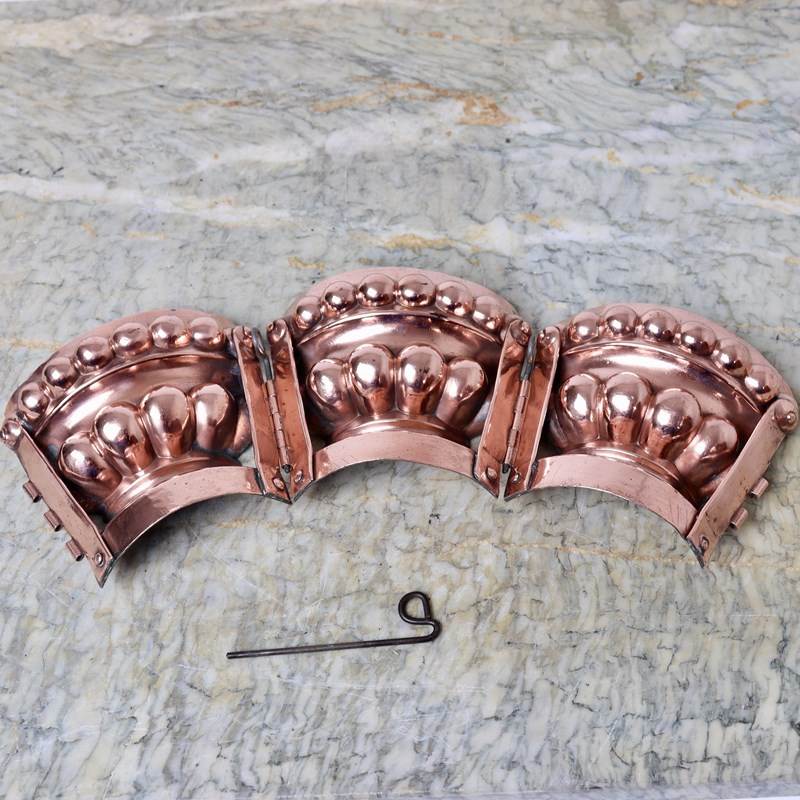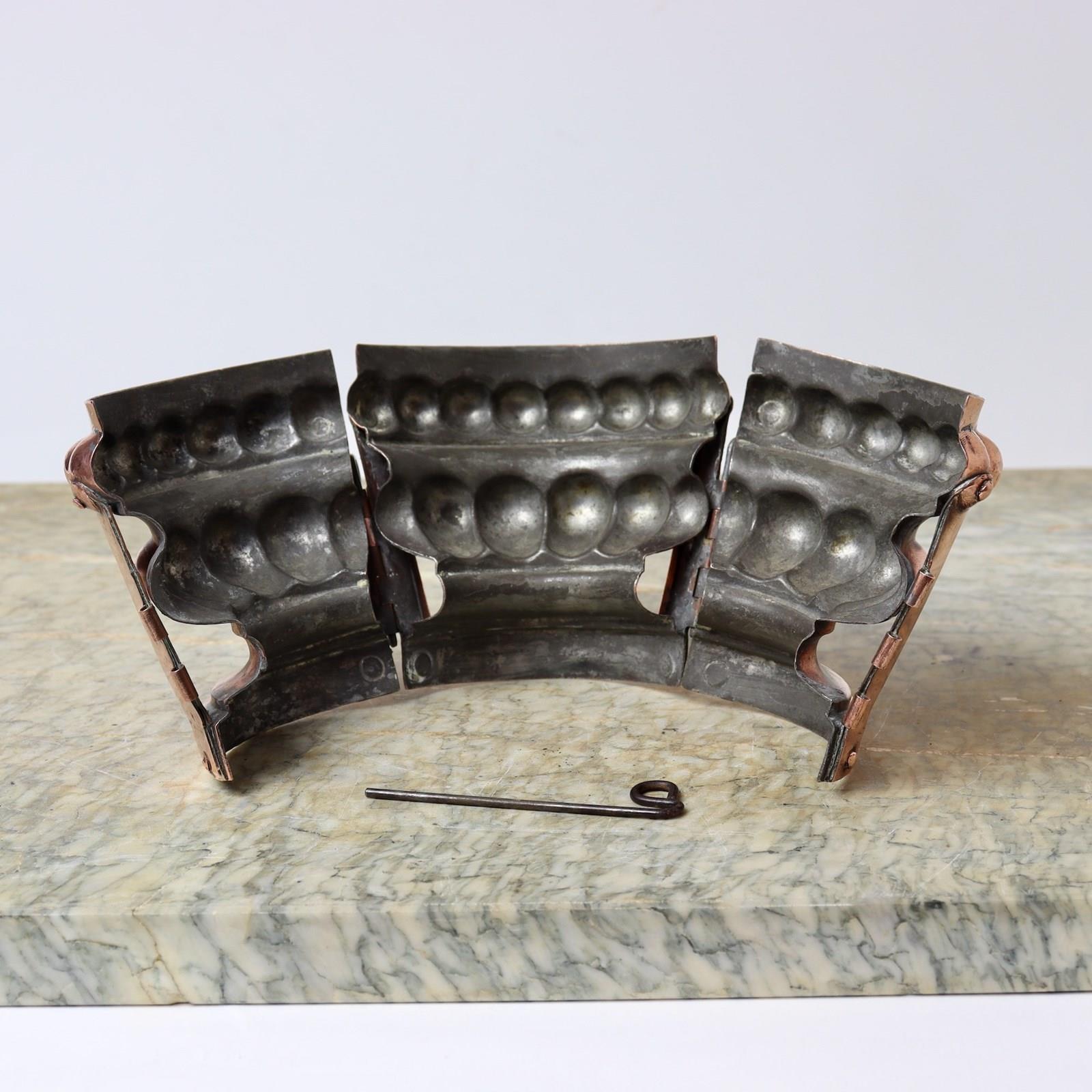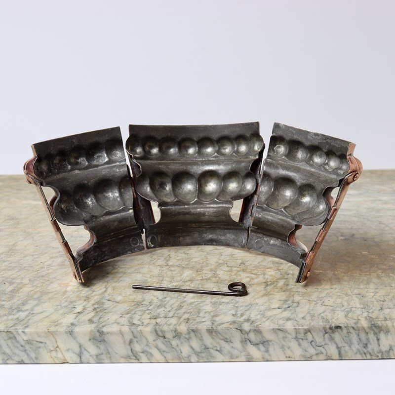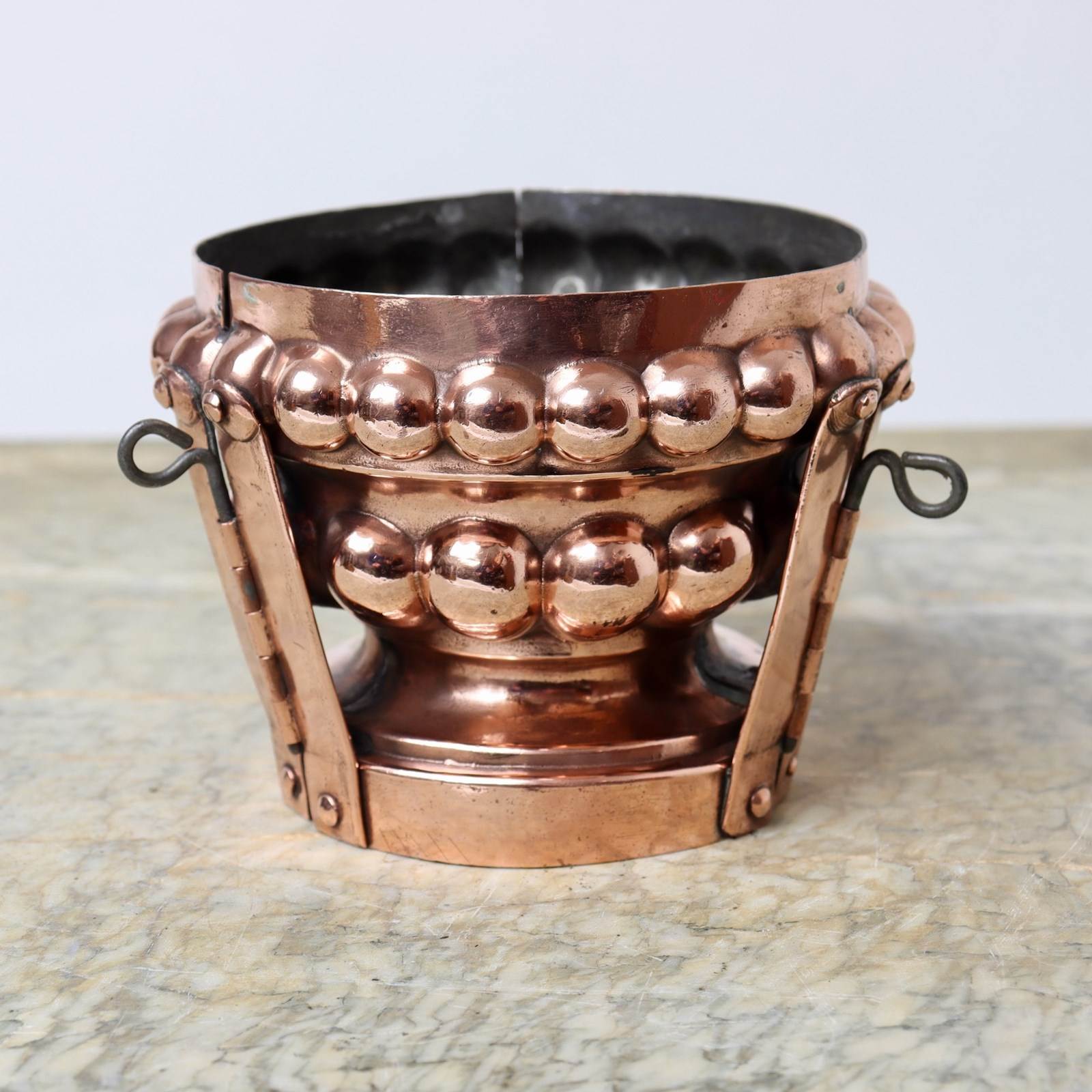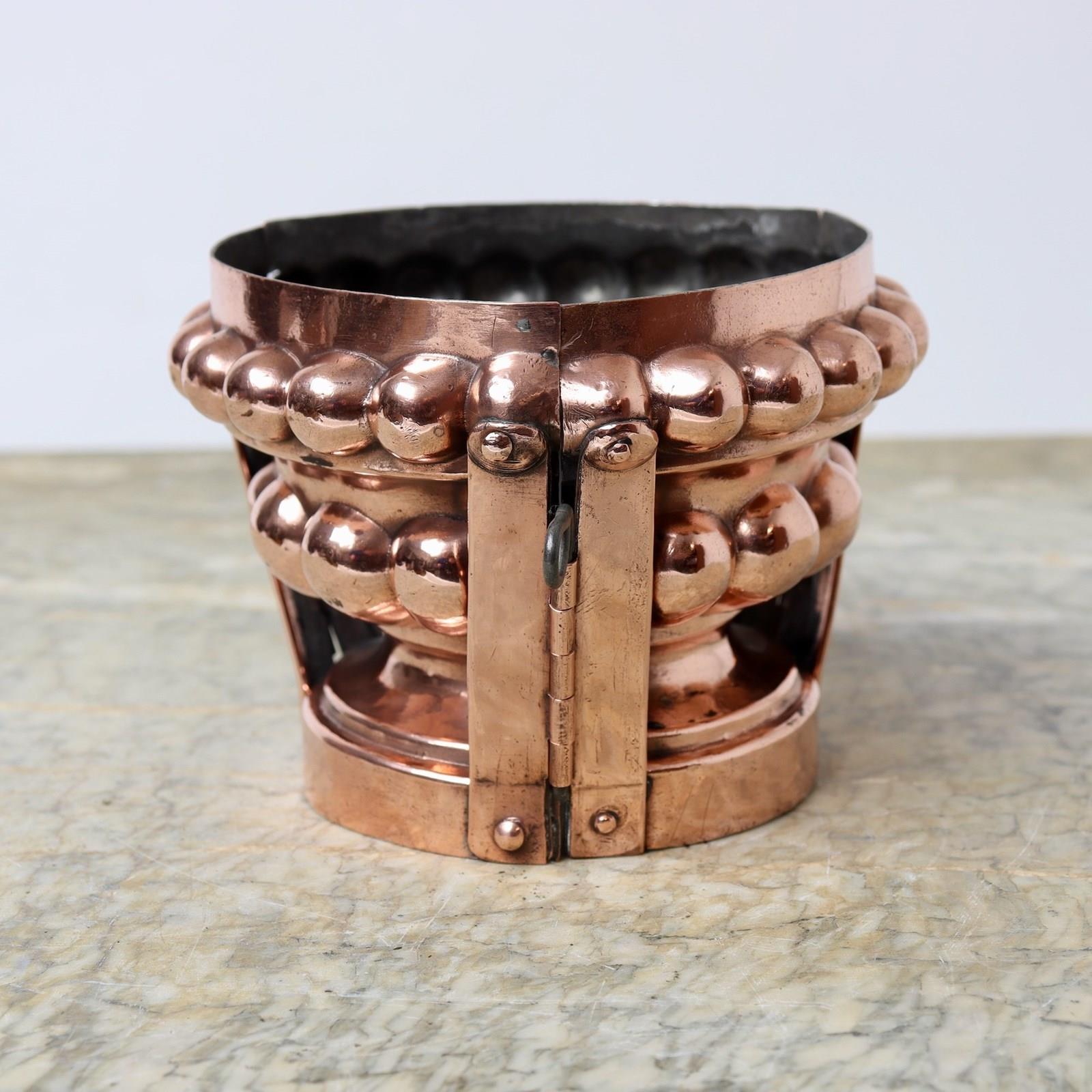 An unusual, French copper, three part hinged pie mould in the shape of an urn. This is made from a heavy gauge of copper and it dates from c.1860. It is typically the shape of a garden urn with a pedestal base and deeply moulded beading. We have never seen a pie mould in this shape before and it possibly had a specific use. It is in very good condition but the tinning, to the interior, is worn.