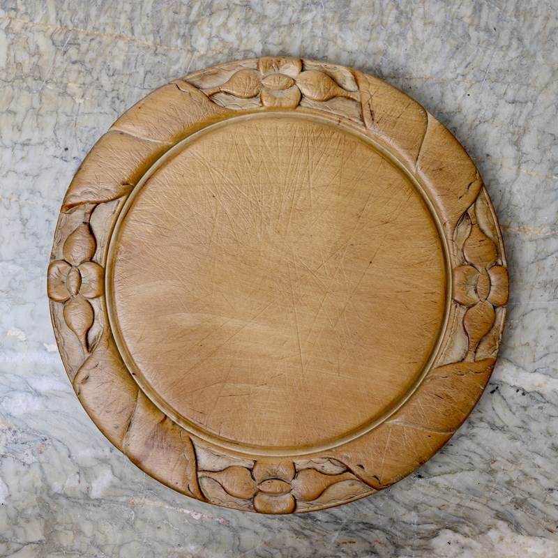 A nineteenth century beechwood breadboard with a deeply carved border. This is carved with four stylised flowers divided by leaves. It is English and it dates from c.1880. There is wear to the border and there are the usual knife marks to both the face and the reverse of the board, from use. The wood has quite a rich patina.