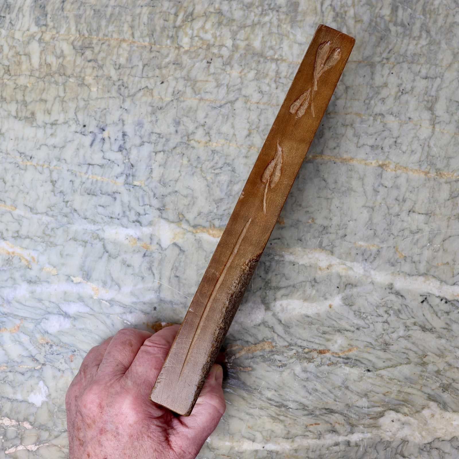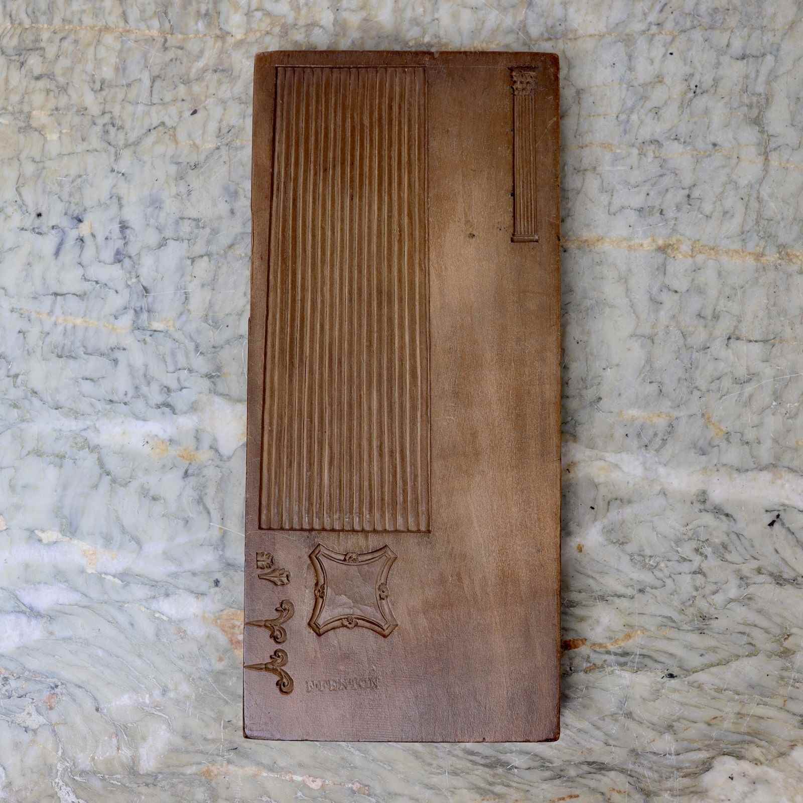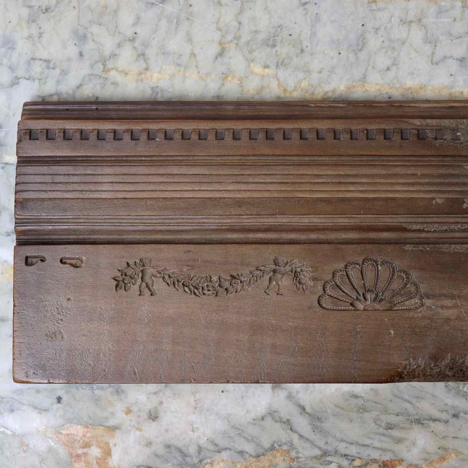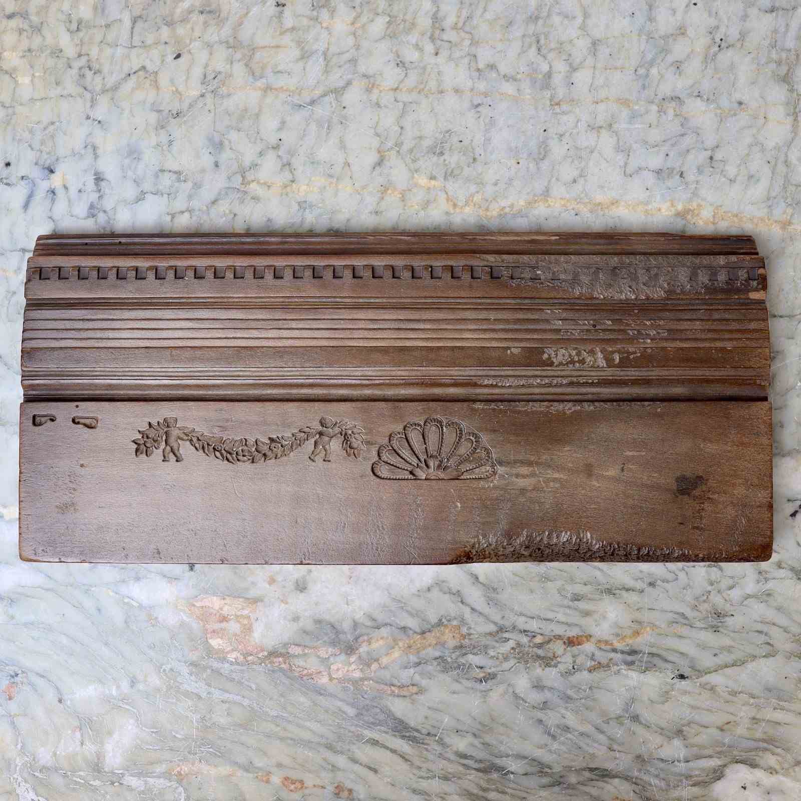 A late 18th century, double sided, fruitwood sugar mould. This is stamped with the name of the carver “F.FENTON” and it dates from c.1790.To one side it is carved with a series of border designs and tiny cherubs holding a garland. The opposite side is carved with a reeded section and a column, which would have been used as part of a building, and other tiny leaves and plumes. The carving is of exceptional quality. The carver has also started to carve some leaves on the side of the block but these have never been finished. There is wear to one edge of the block and also to the border designs but this is still a fascinating mould.