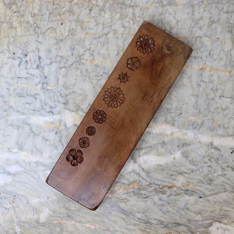 A 19th century, double sided, fruitwood sugar mould. This is English and it dates from c.1860. One side is carved with three large, geometrically stylised flowers and the other side is carved with a series of eight small flowers. The mould is in excellent condition.