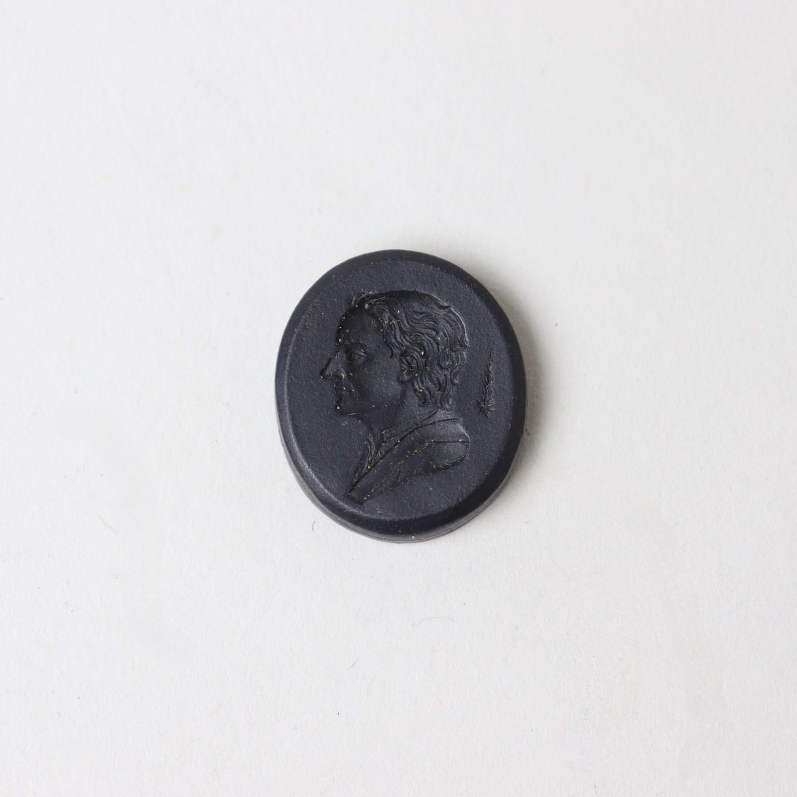 A very small, Wedgwood, double sided, basalt intaglio. This is impressed with the head of Isaac Newton to one side and a further male head to the other. It is unmarked and it dates from c.1780. It is exceptionally fine quality and it is in excellent condition.