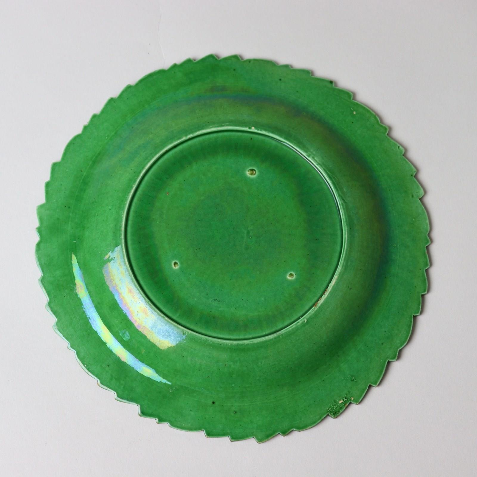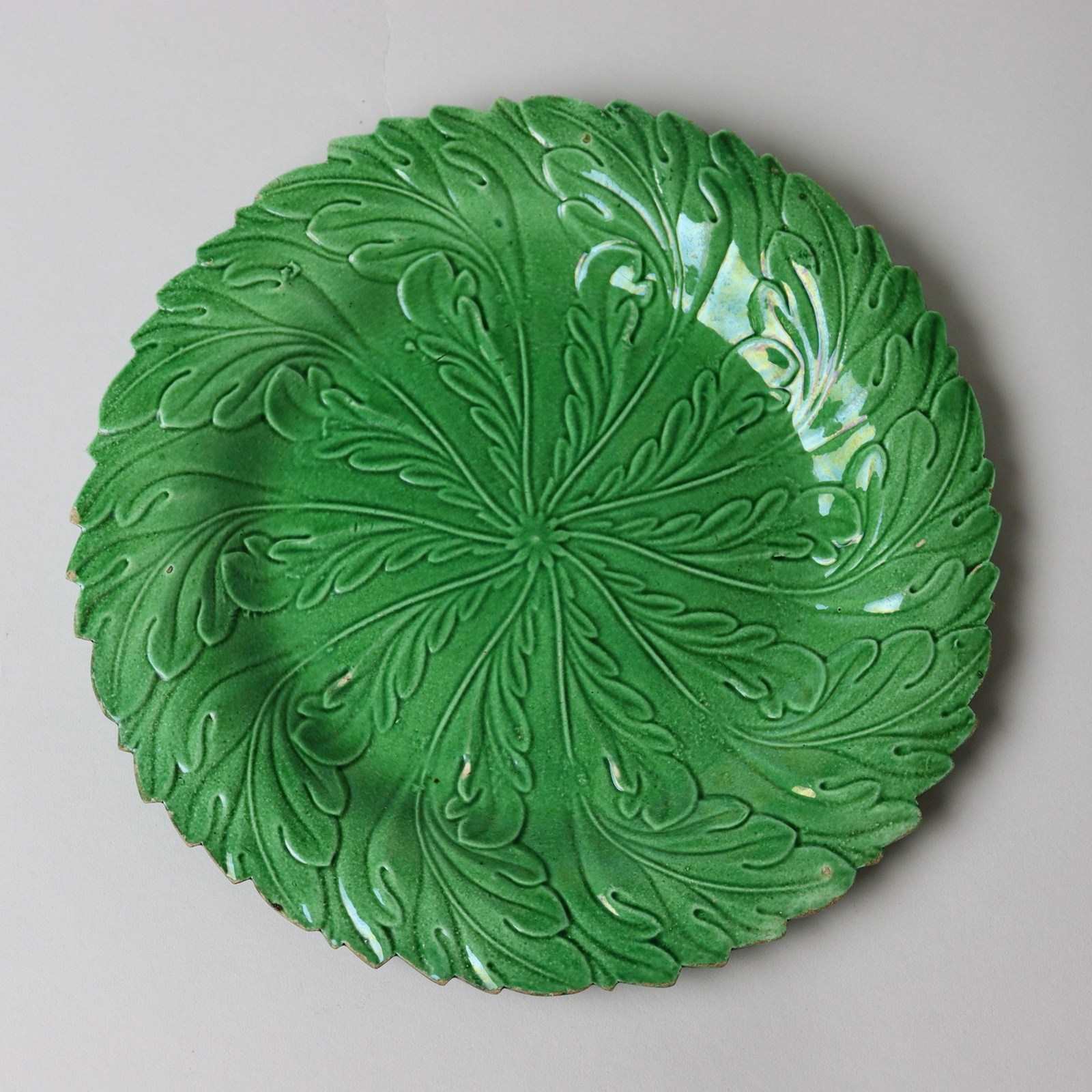 A 19th century, green majolica glazed plate. This bears no manufacturers marks but it is English and it dates from c.1820. It is nicely moulded, with a stylised leaf design, and the serrated rim follows the shapes of the leaves. The design is covered in a mid green, majolica glaze. There is rubbing to the glaze, on the serrated rim of the plate, and there is also slight rubbing to a couple of the high points in the moulding.