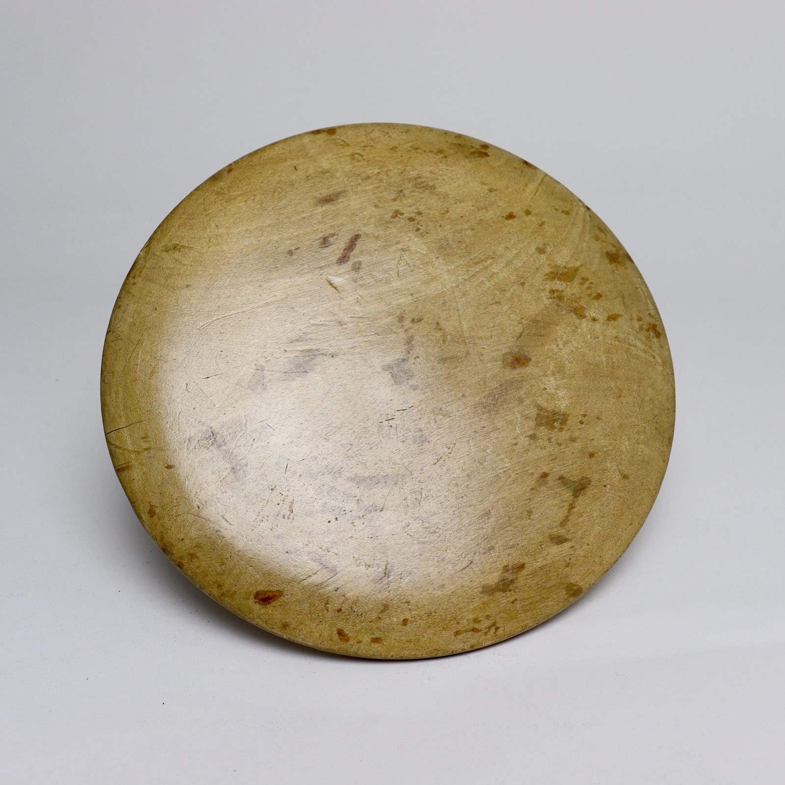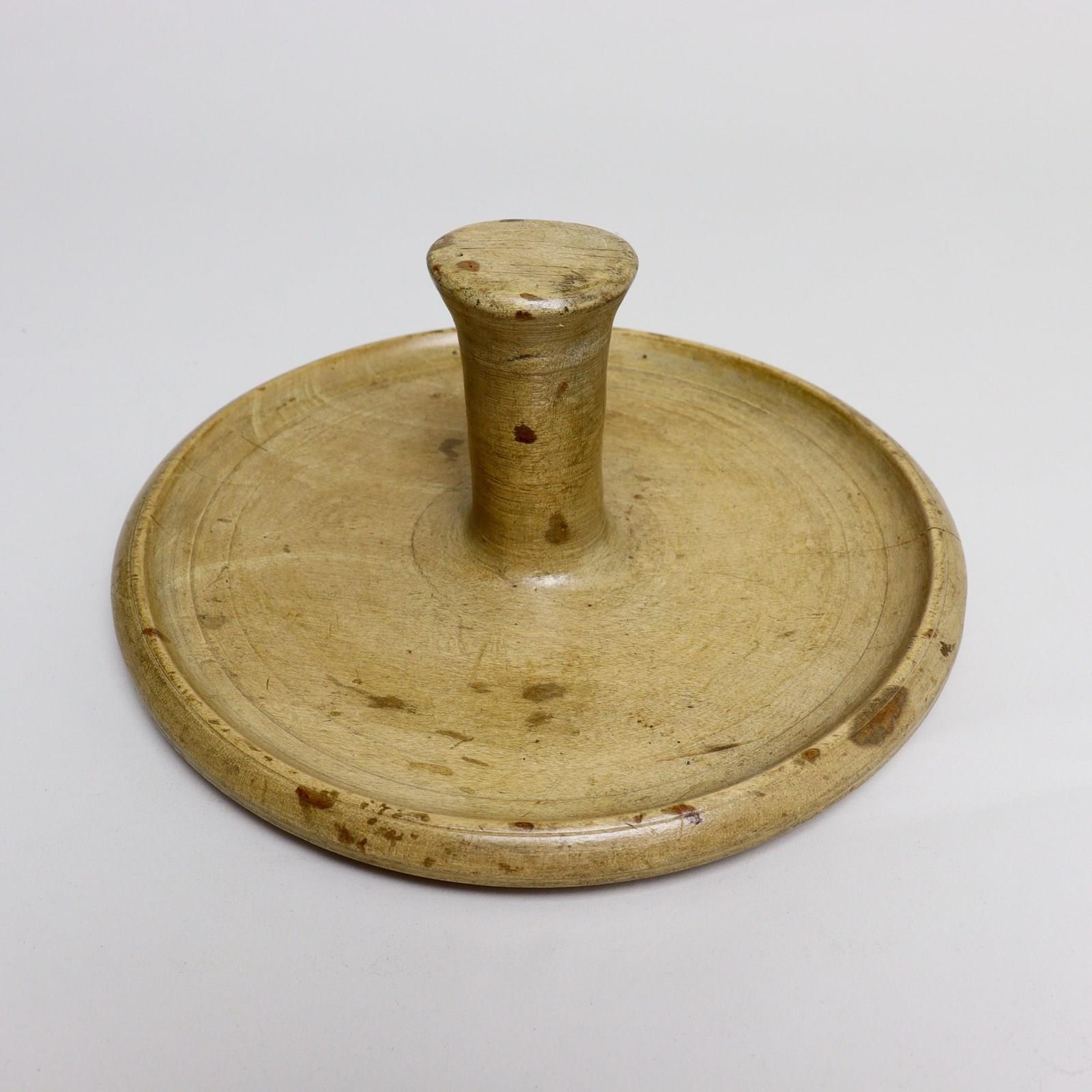 An early 19th century, sycamore butter worker. This would have been used, during the butter making process, for working the salt into the butter and the water out. The butter would have been worked in a large butter bowl. The worker is turned from sycamore and dates from c.1830. There are two cracks in the rim, one which goes through and one which doesn’t. There are also a couple of woodworm holes but these have been treated so the worm is no longer active. The wood has a lovely patina.