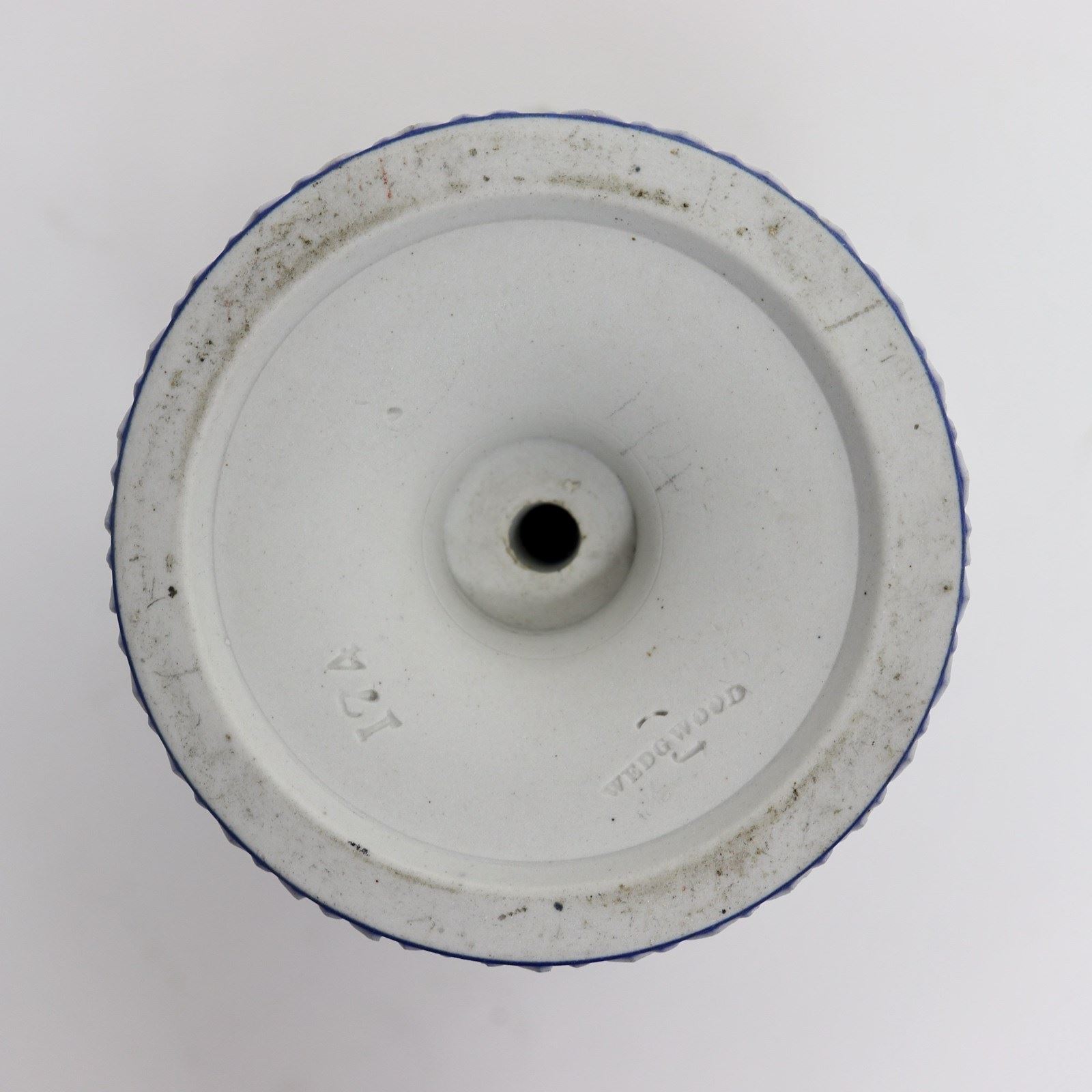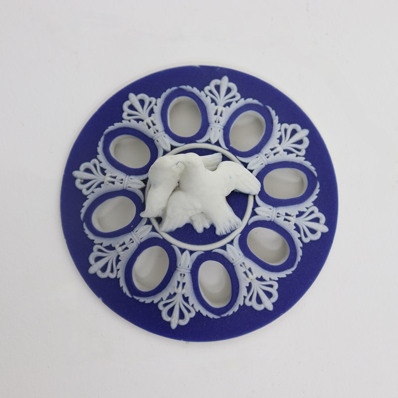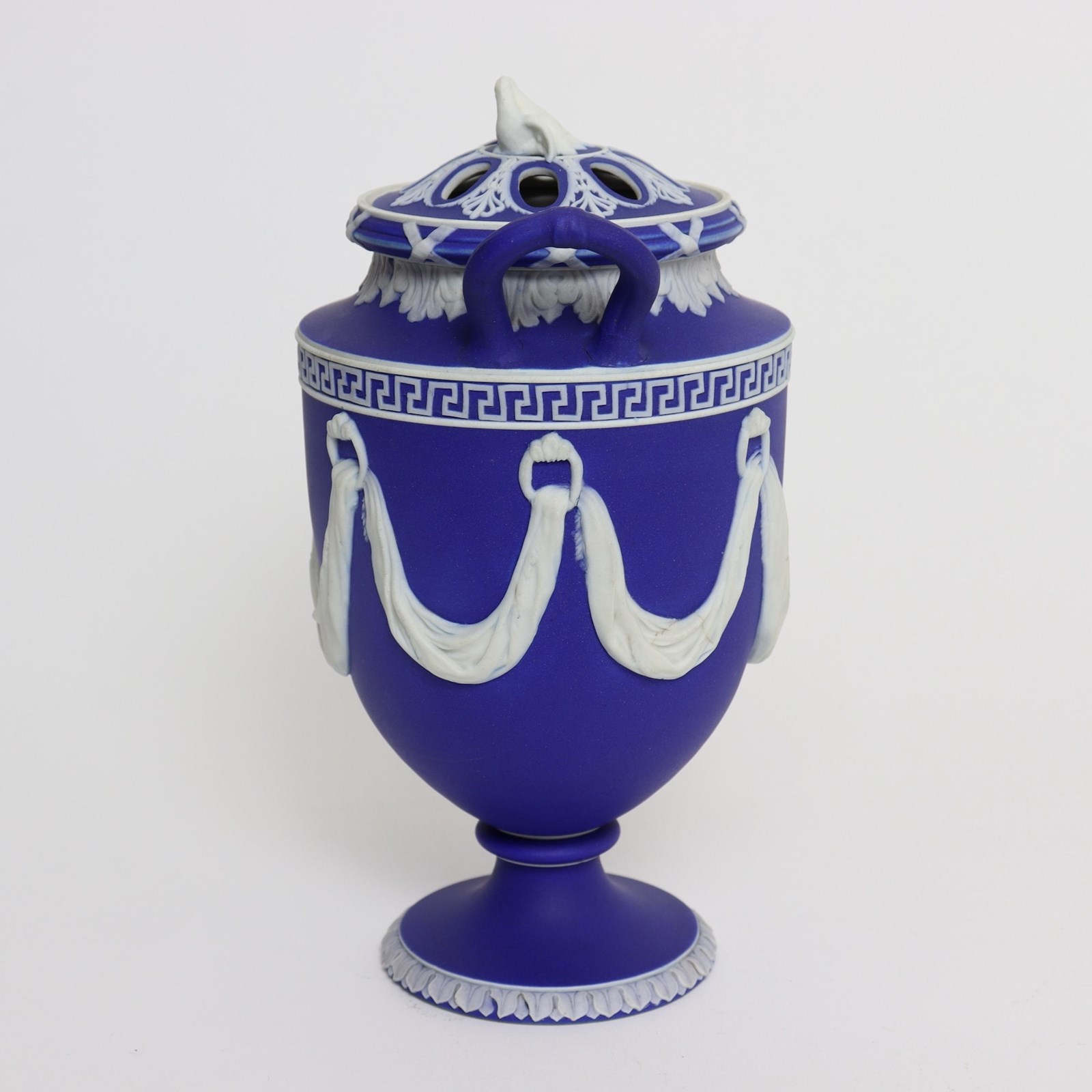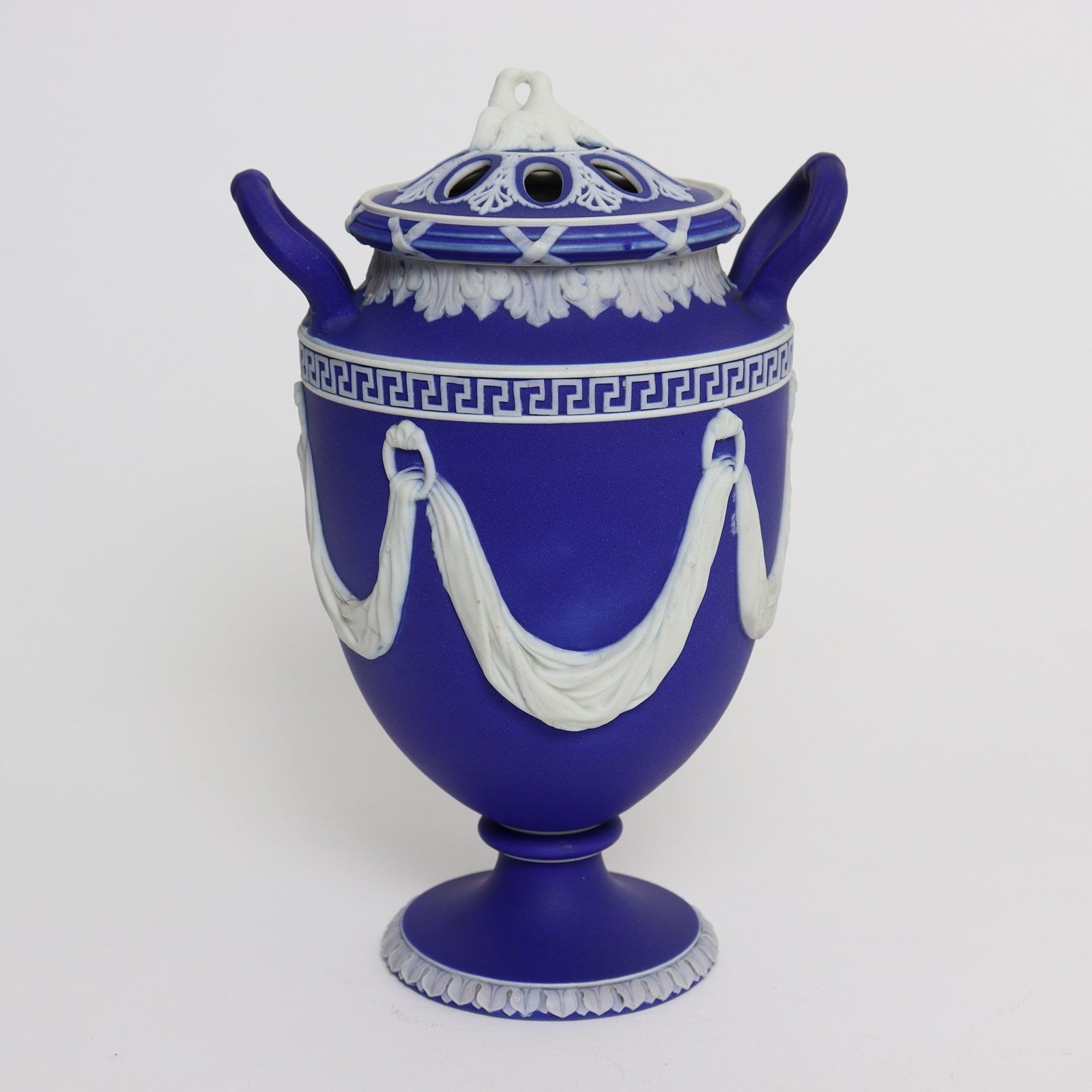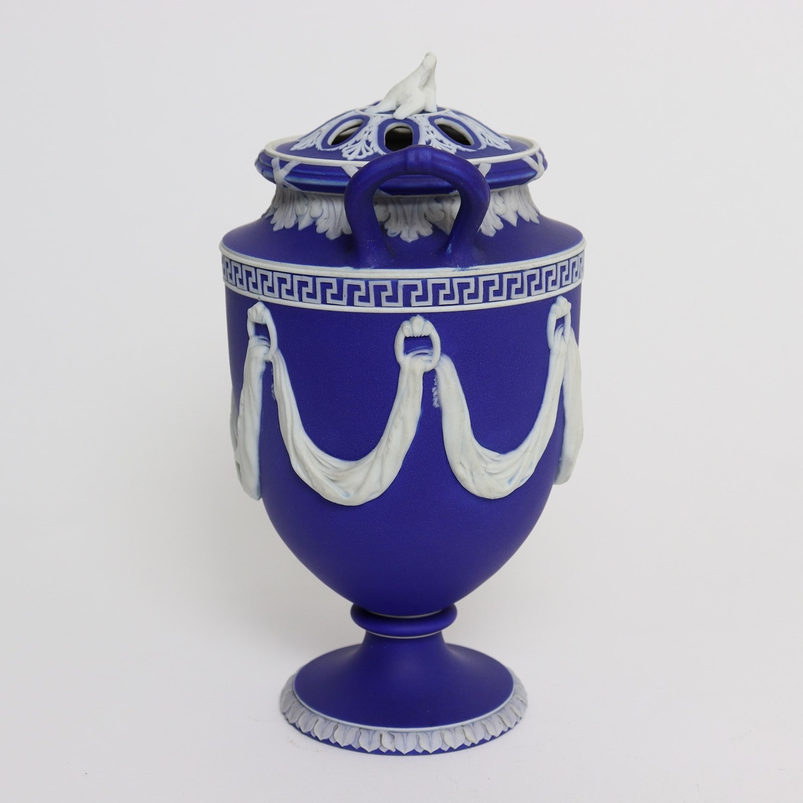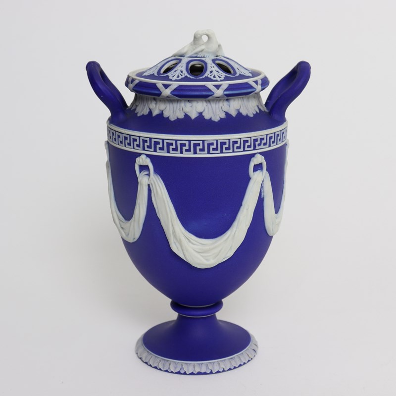 A super quality, early 19th century, Wedgwood dark blue, jasper dip bough pot and cover. This is marked “WEDGWOOD” and it is also impressed with the number ”174’ which could relate to a pattern book number. It dates from c.1820. The vase is decorated, in white relief, with swags of fabric which hang from loops and there are various foliate and geometric borders. The pierced lid has a very attractive finial in the shape of two doves. All of the reliefs are excellent quality, as would be expected of a piece from this period, and the jasper dip is a rich shade of blue. There is a very small chip to the rim, which is visible in the image of the lid, and there are also two firing faults in one of the shorter swags. Otherwise it is in good condition.
